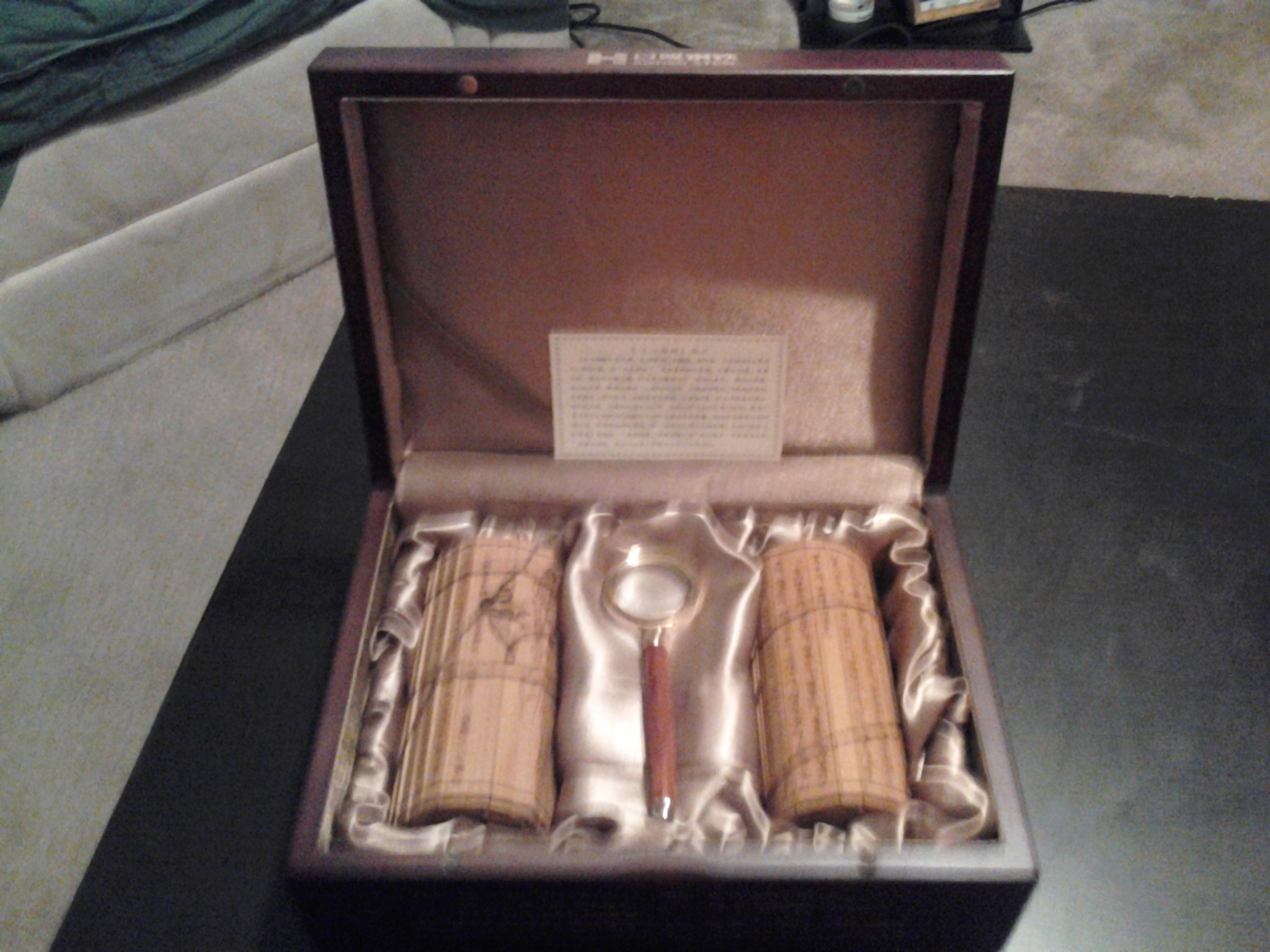 China box with two scrolls and magnifying glass . The scrolls are not painted like inscripted u might say . One scroll has the only pic of a man . The storage box says rizhao steel company and adress and phone numners . Can someone give me ideas what it is and possible value .thx