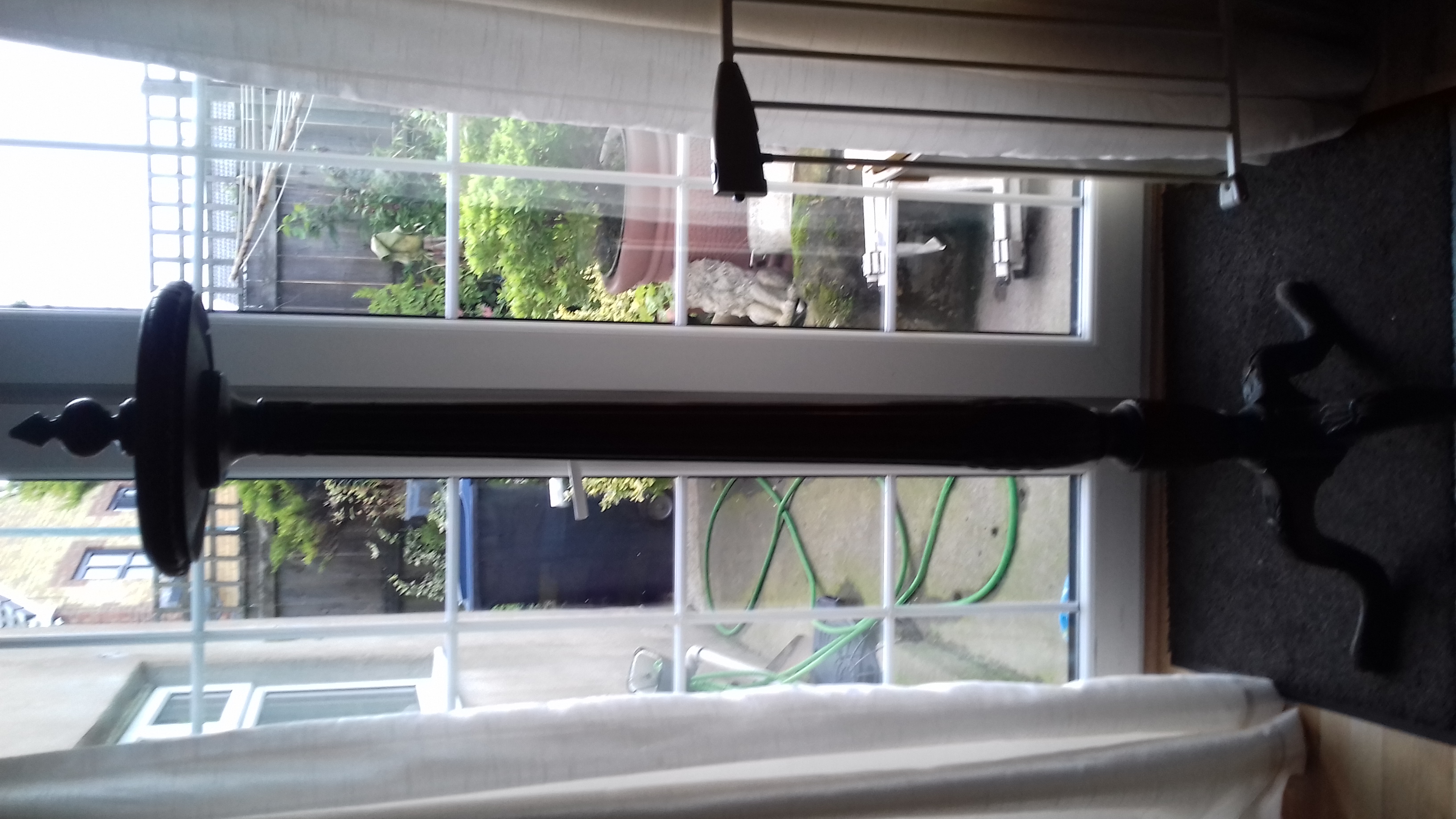 It's made of wood and has a cast iron ball top