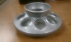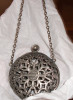 The side of the dish curve upwards and slightly outwards. The dish section is comprised of ornate shapes that resemble flowers or Macintosh style lines, made of holes through which light casts complex, tree or vine like shadows on the surface beneath. The base is solid metal (no holes) and features a a stylised screw or pin in the centre, yet strangely this seems to serve no purpose: It does not fix the dish to the base as these are a single piece of metal, nor does it secure the lower piece to the 'flute' piece rising from the centre of the dish. The circumference of the dish is approximately 15cm.