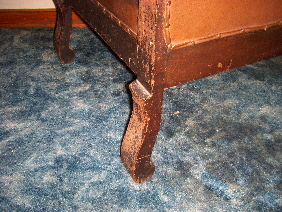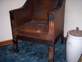 All wood parts are solid one piece, brown leather and piping with tacks on the interior. back and sides, black leather on the bottom. seat padding is heavy cotton inside of burlap bound with twin, supported with hourglass shaped metal springs.