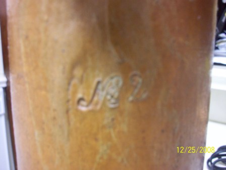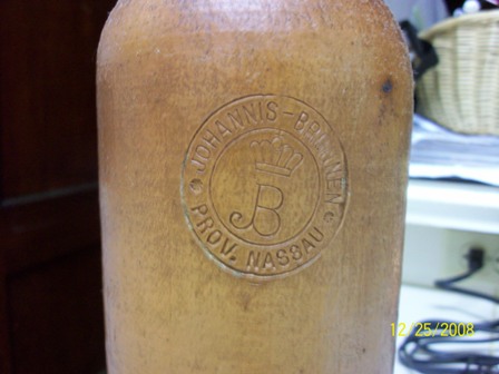 Bottle is orangeish brown in color.  Front of bottle has stamped seal on front with Johannis Brunnen on top of seal and Prov. Nassau on bottom of seal.  Bottom of bottle has No. 2 stamped on it.  Nothing on bottom of bottle.