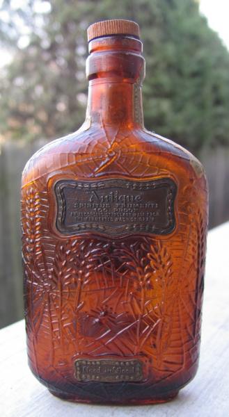 Bottle label is "Whiskey Antique" front side, it's brown, pint size about 5" tall,Spring 1913, The Frankfort Distillery. Inc. Distrib. Number 35, Dist. of Kentucky By John B. Thompson. This bottle have never been opened, original label covers shoulder to shoulder, also have box it came in missing flap. There is a spider web with spider on both sides of bottle, labels on both sides of bottle. Enclosed picture shown is open bottle of Antique Whiskey.