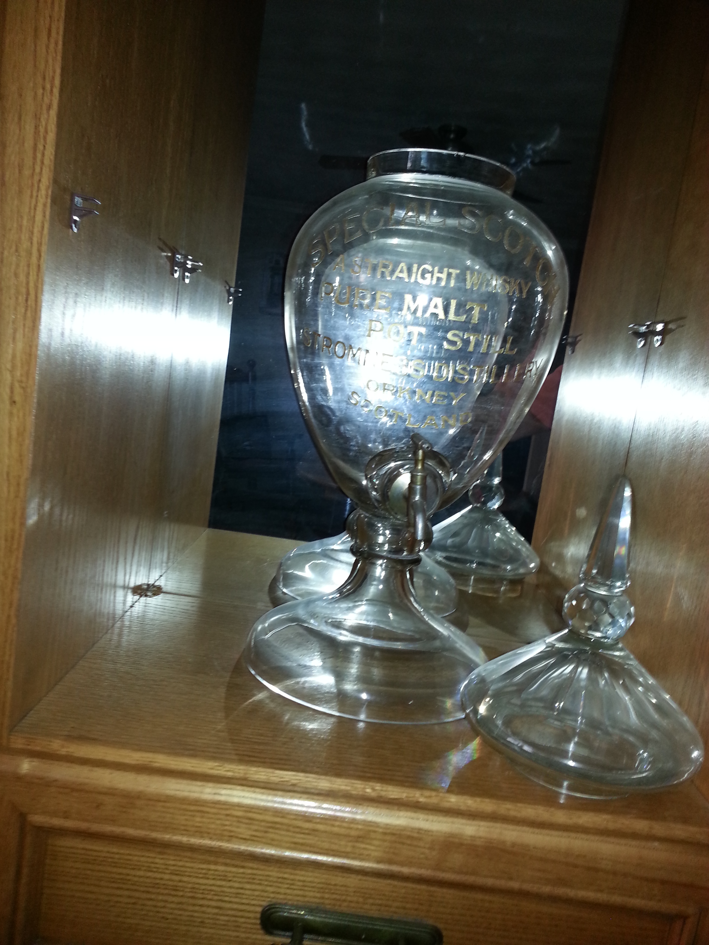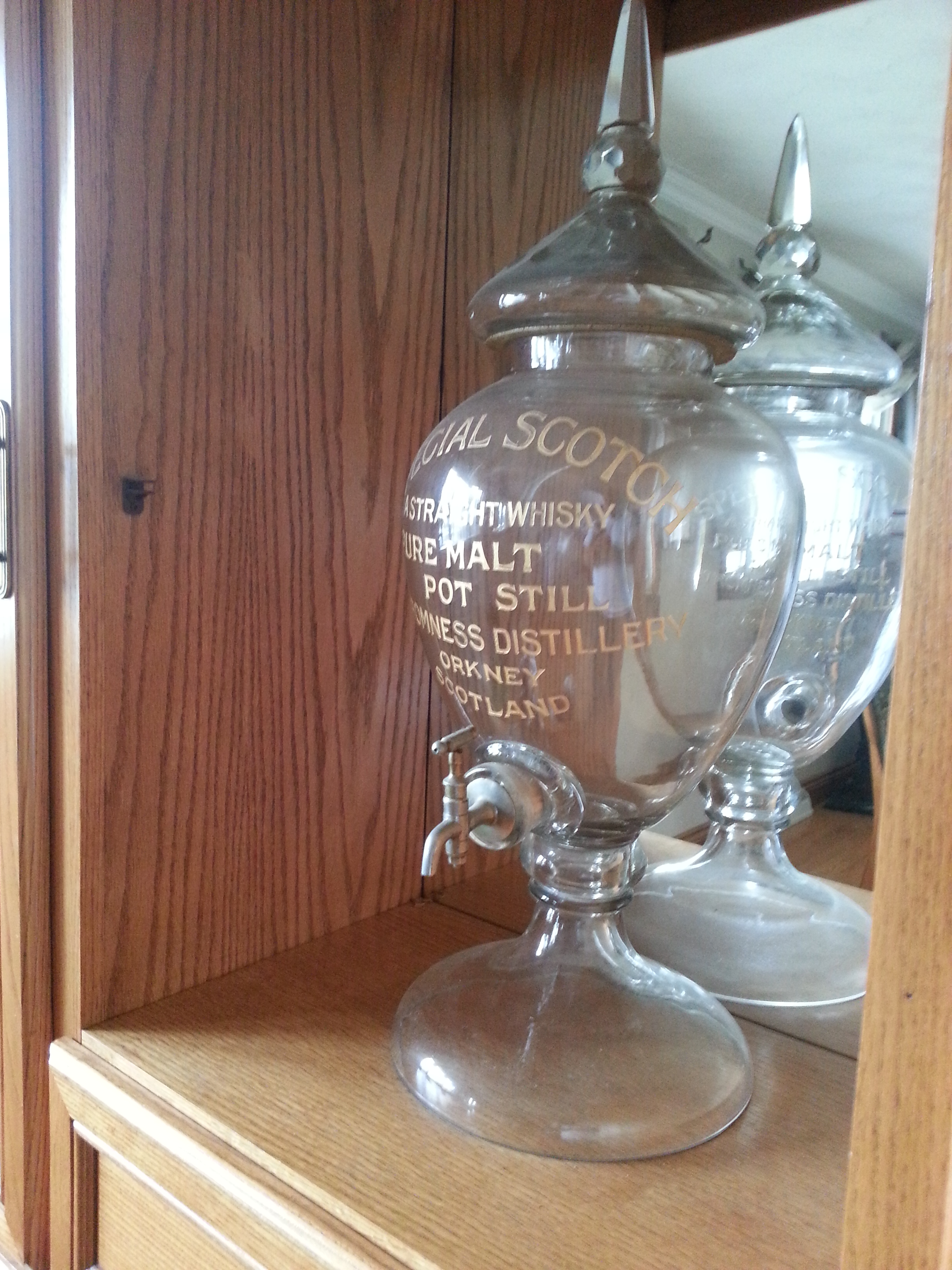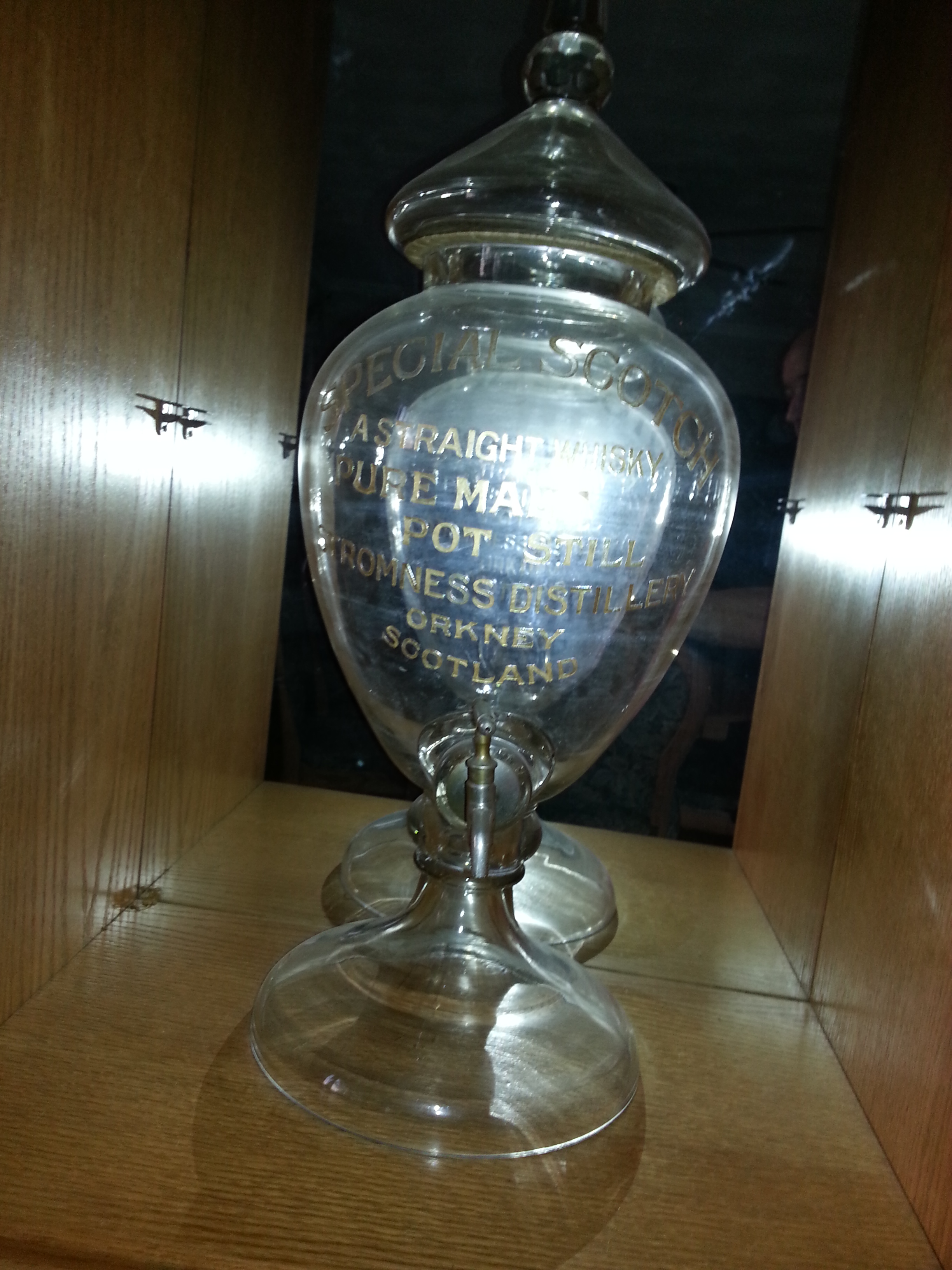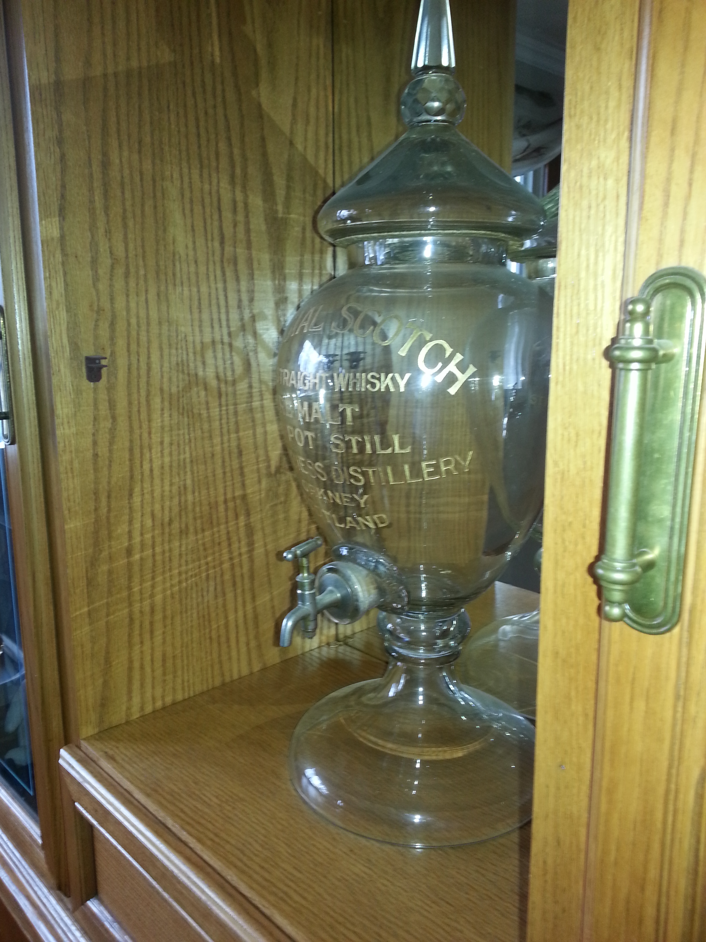 Glass Urne , 27'' hight by 11'' wide, From 1890 to 1903. SPECIAL SCOTCH A STRAIGHT WHISKY PUR MALT POT STILL STRONMEE DISTILERY ORKNEY SCOTLAND. Groove and gold trim. With a tap in front.