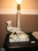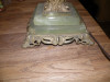 Art Deco figural lamp. The lamp is an interesting one, it has an alabaster round ball that is made up of two pieces. The round piece of alabaster is hollow and the lamp lights the ball up from the inside. the cast gold brass colored base contains the wiring contains a housing for the light, and the alabaster ball slips over the top.