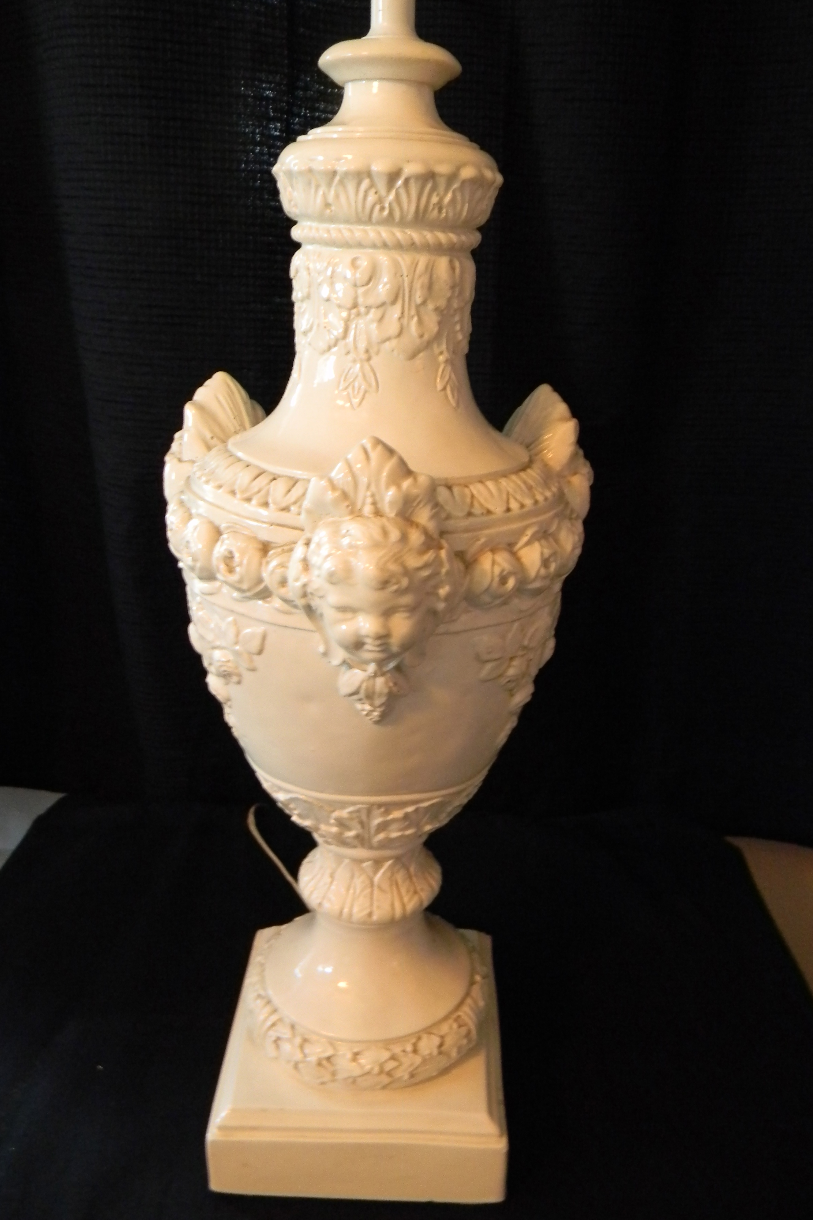 Lamp is white with 4 cherub faces and other details that include roses and leaves. Total height is approx. 32". Weight is appox. 17 lbs. My mother thinks it is made of white marble. I am not sure what it is made of but it is heavy. Condition is very good, no chips or scratches. Been in my mother's family for a long (unknown) time.