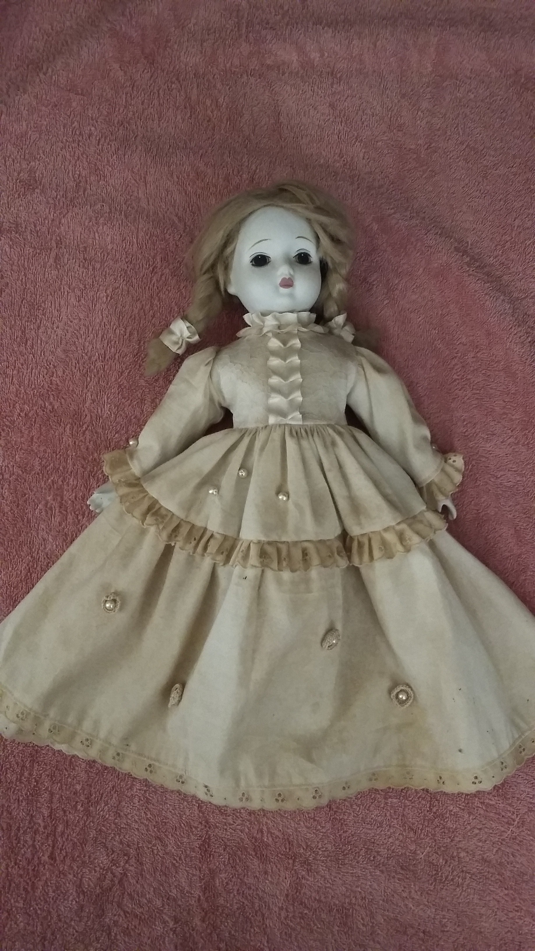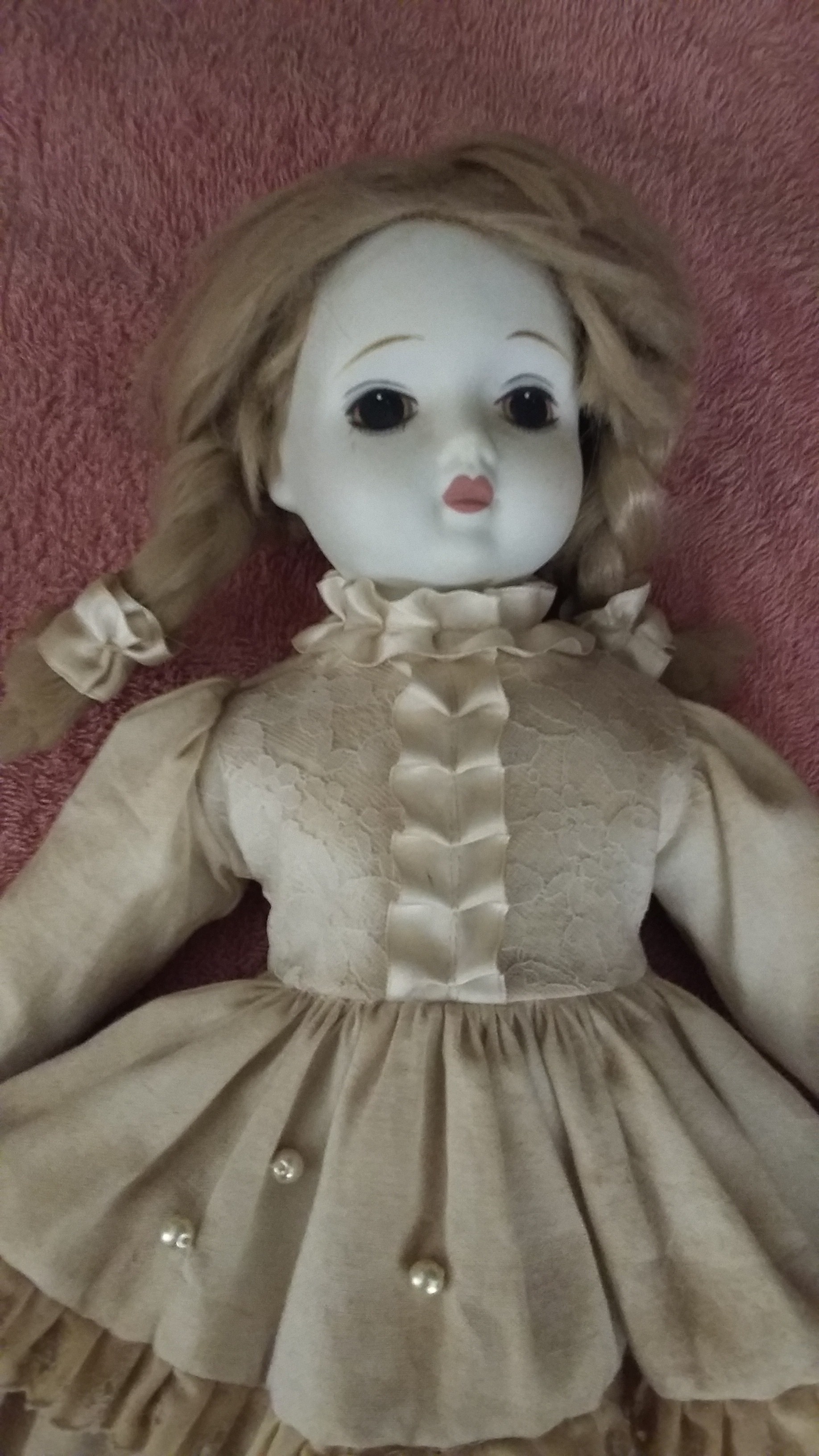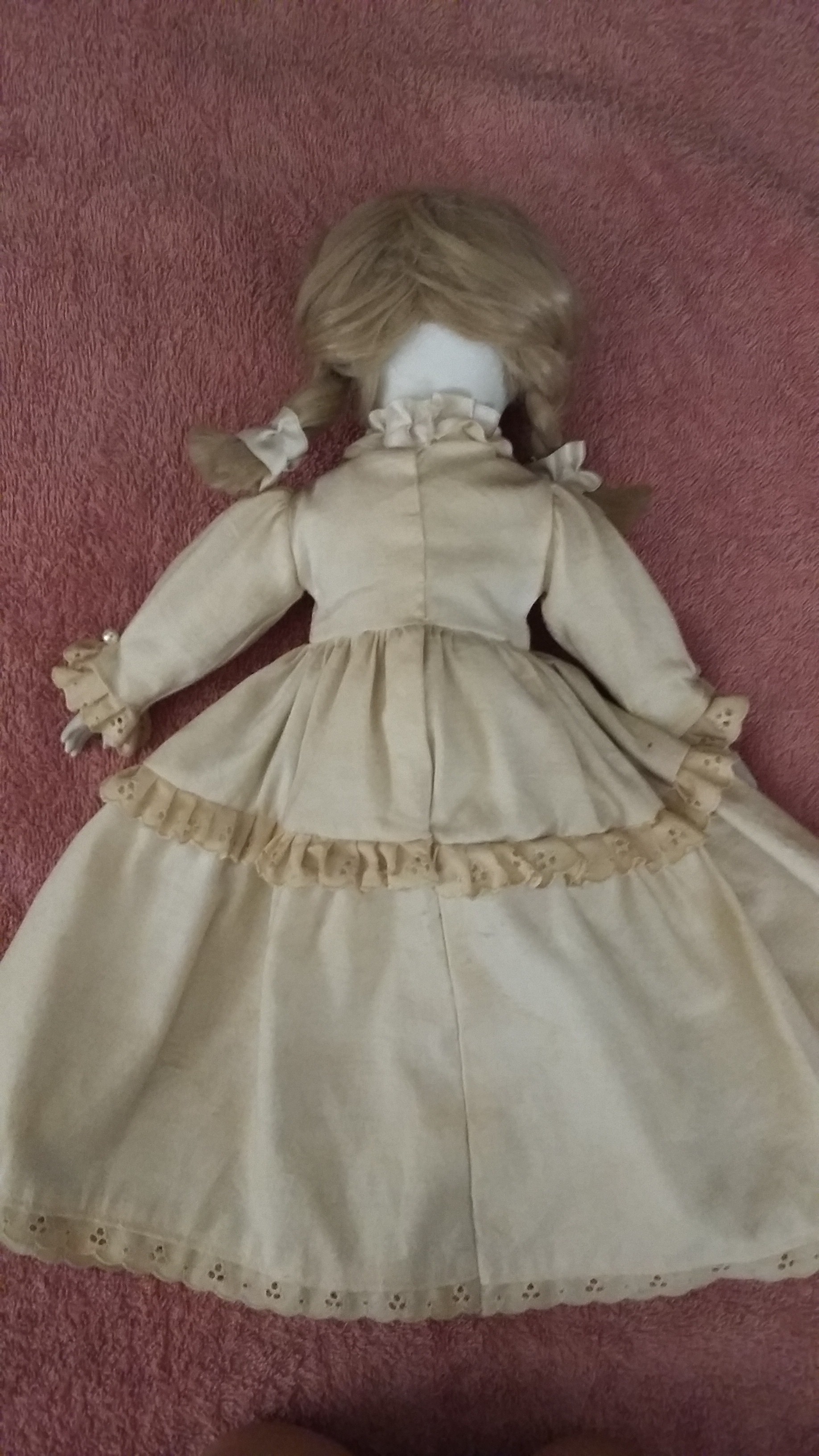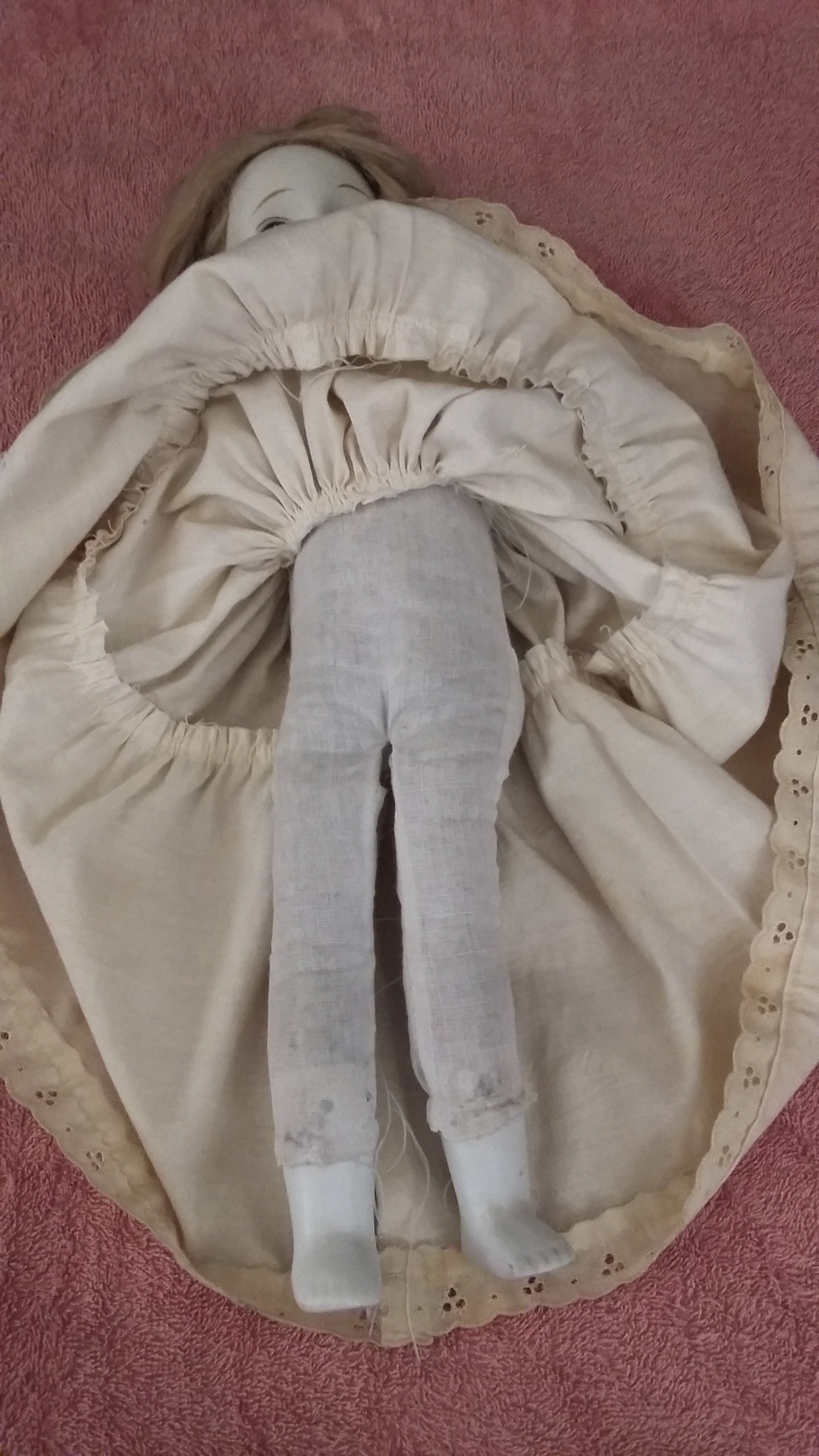 its a white face doll with painted face. she has a white dress on that looks like linnen type of meterial. i dont see any markings on her. her body is material but the face, hands and feet are procelain. about 40cm
