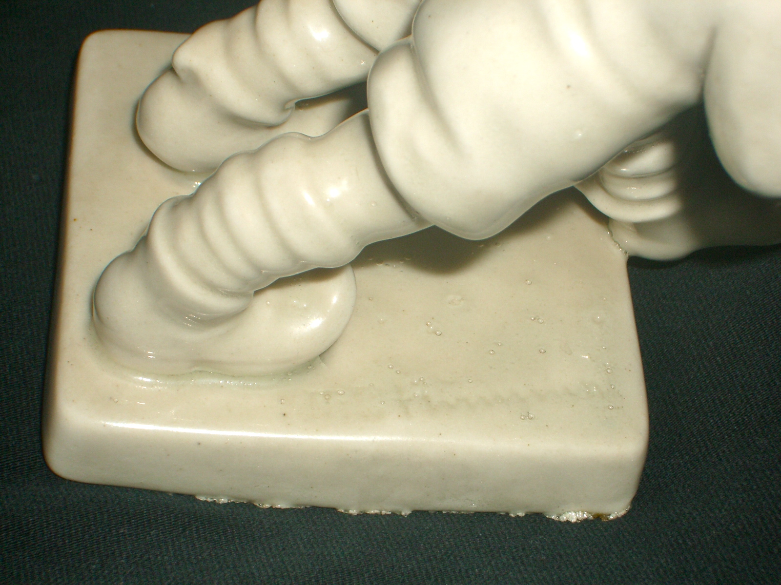 It looks exactly like this figurine: http://www.liveauctioneers.com/item/213764 but completely white. It is 5" tall.