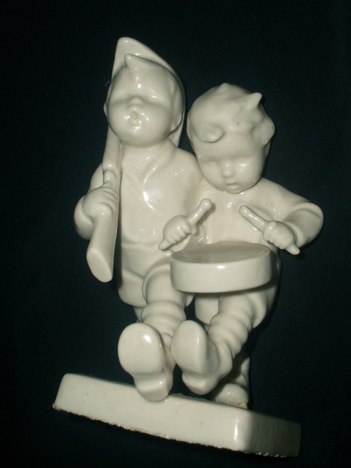 I can identify the name of the two figures. It is called the Volunteers. My research shows it is stamped, no color added, with the first mark and the number 50/0. It does say "Hummel" by the feet. It is unpainted, just white glossed glazed. There are obvious flaws, such as the bottom edges are rough and there is a peice of ceramic actually glazed to the figurine by the boys feet. It seems like the figure didn't finish the clean-up process, and then was glazed over anyway, but not colored. The tip of the gun is broken off, but that was a later flaw I believe, as the glaze does not cover the break.