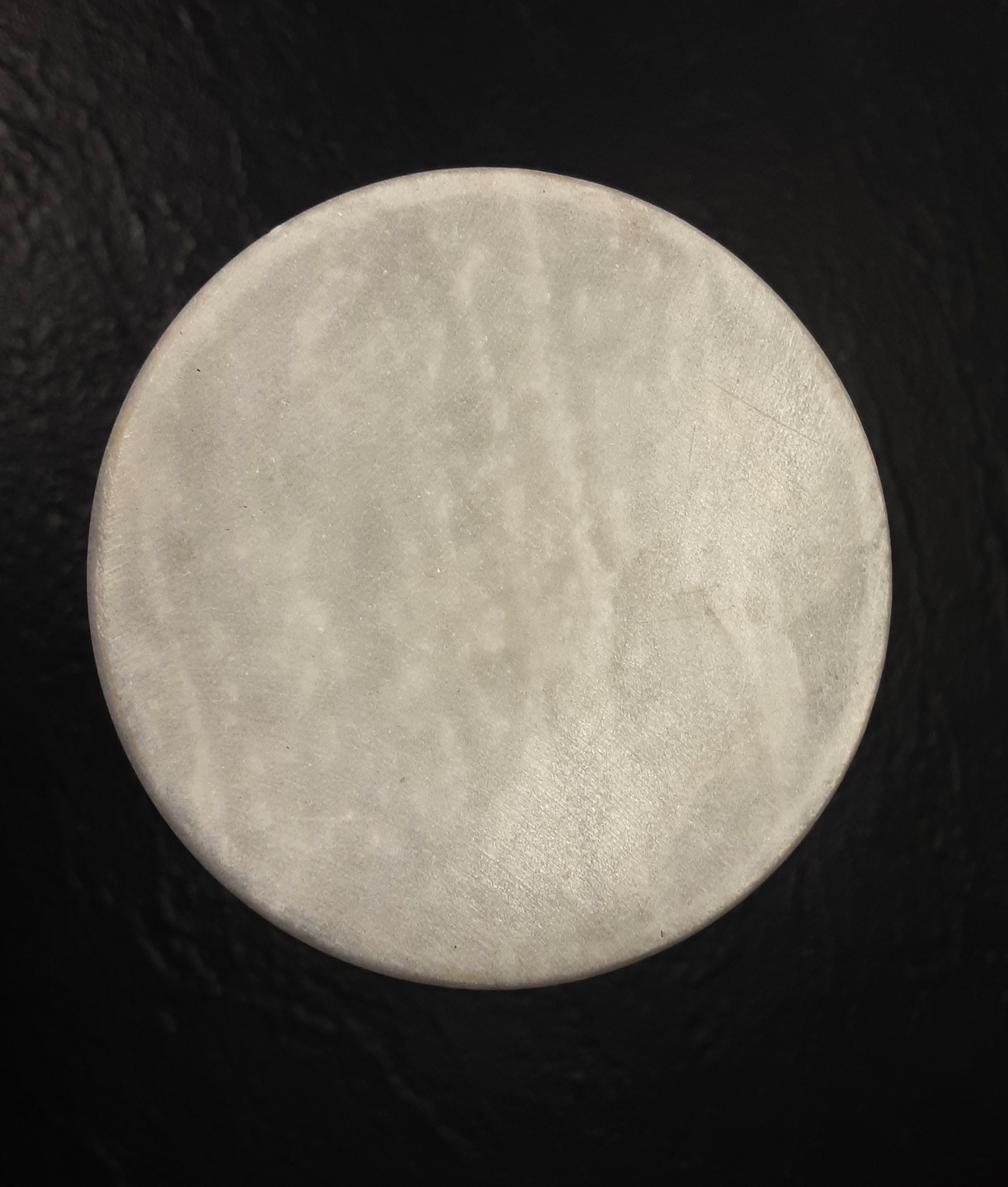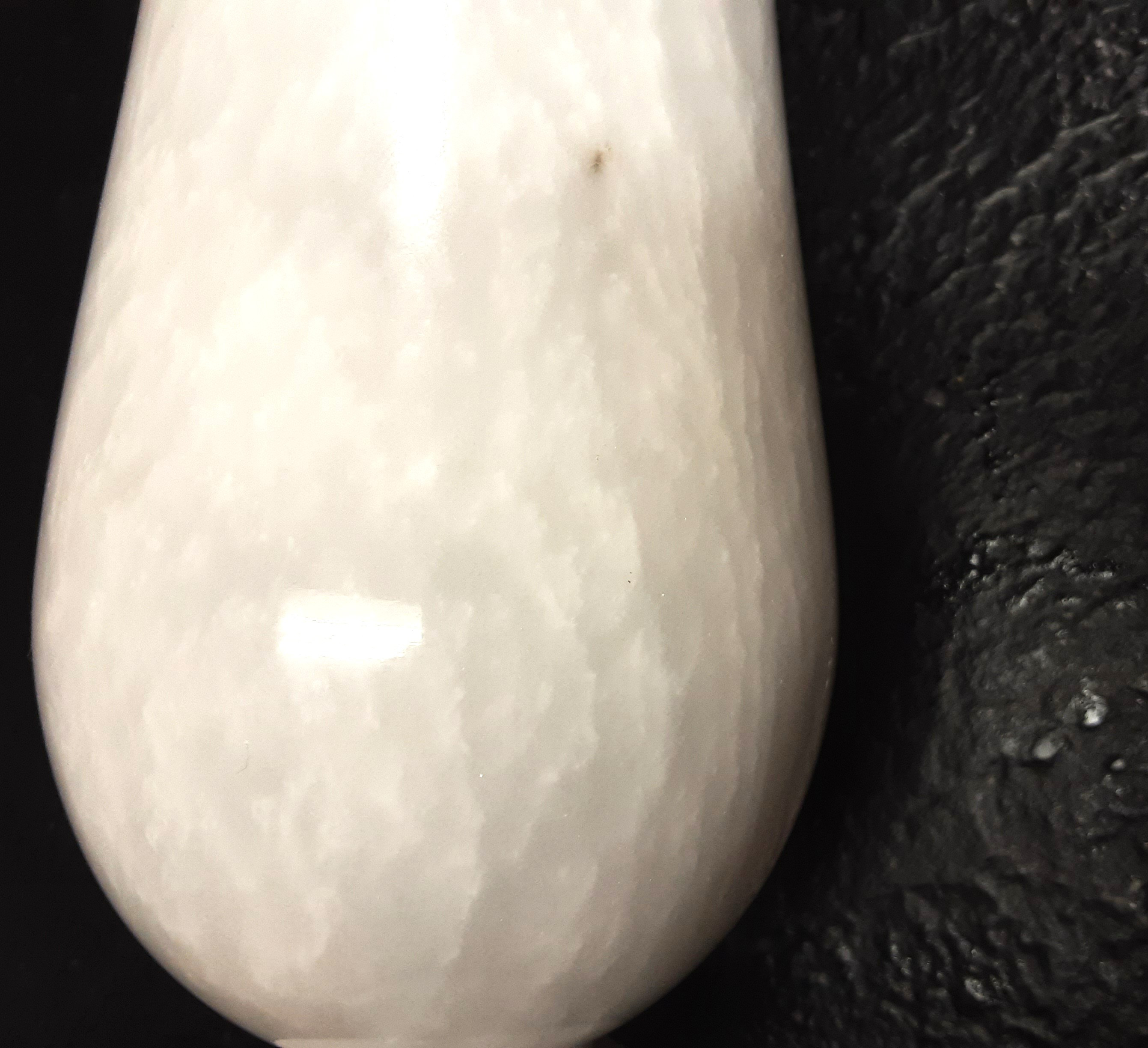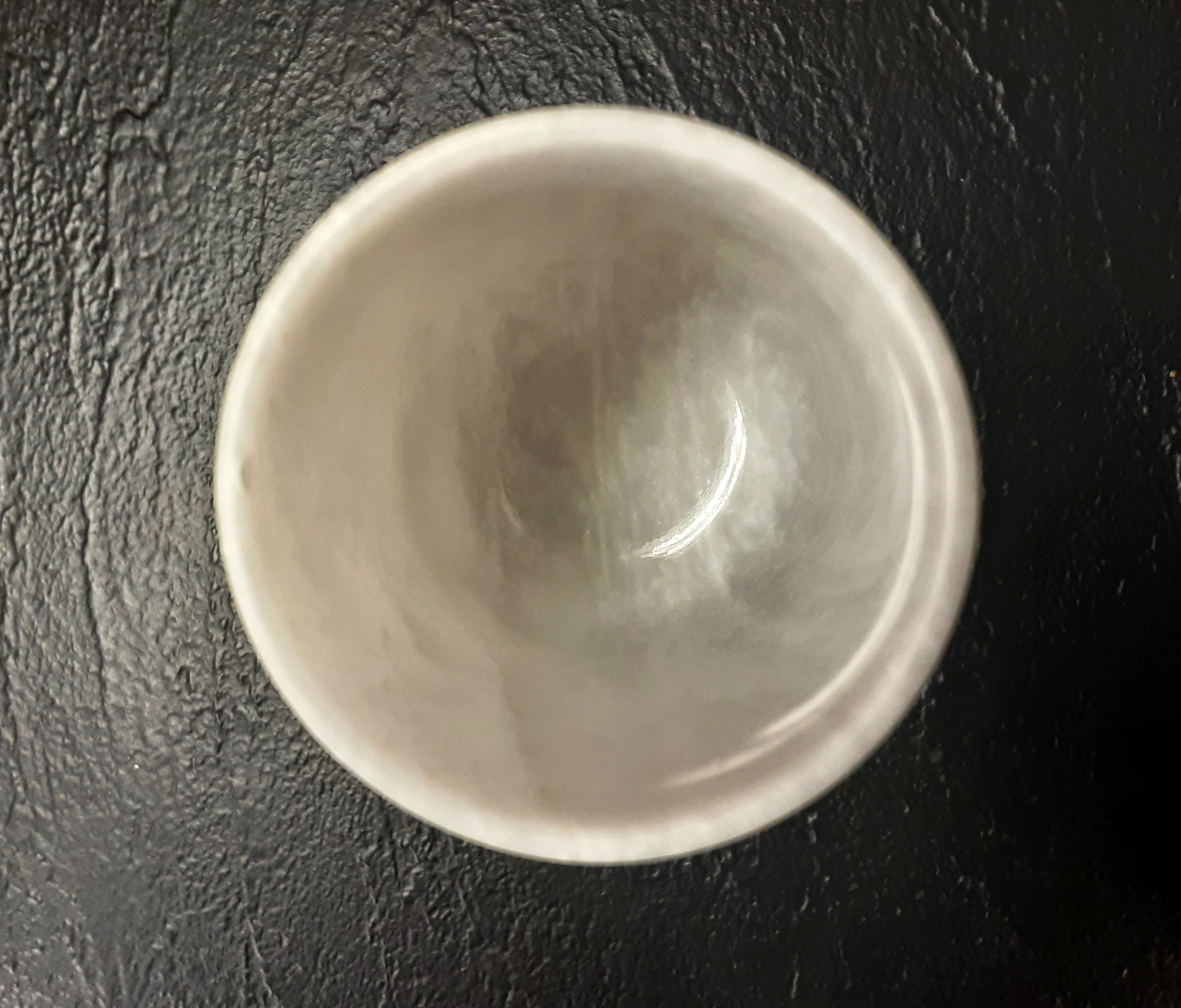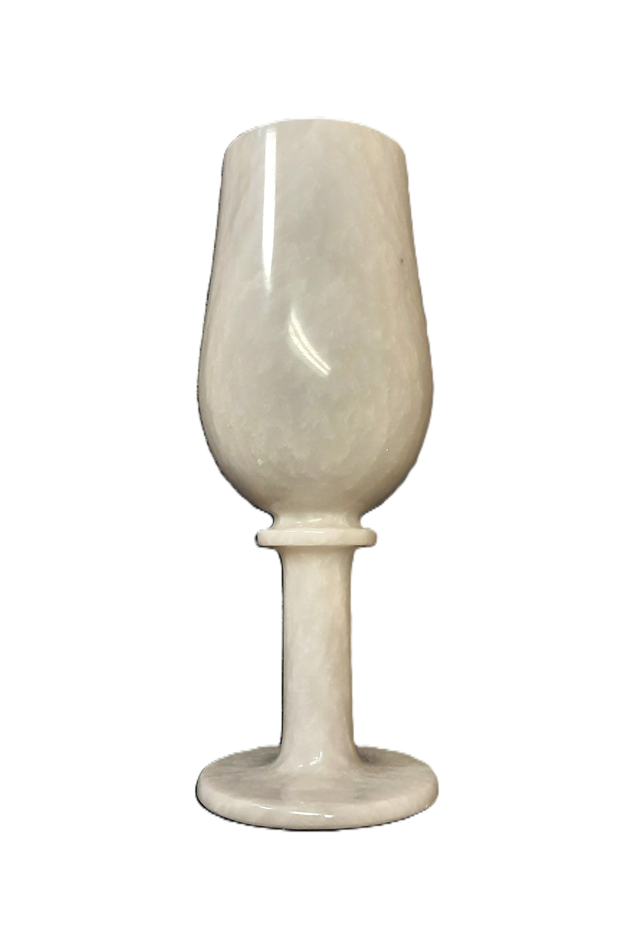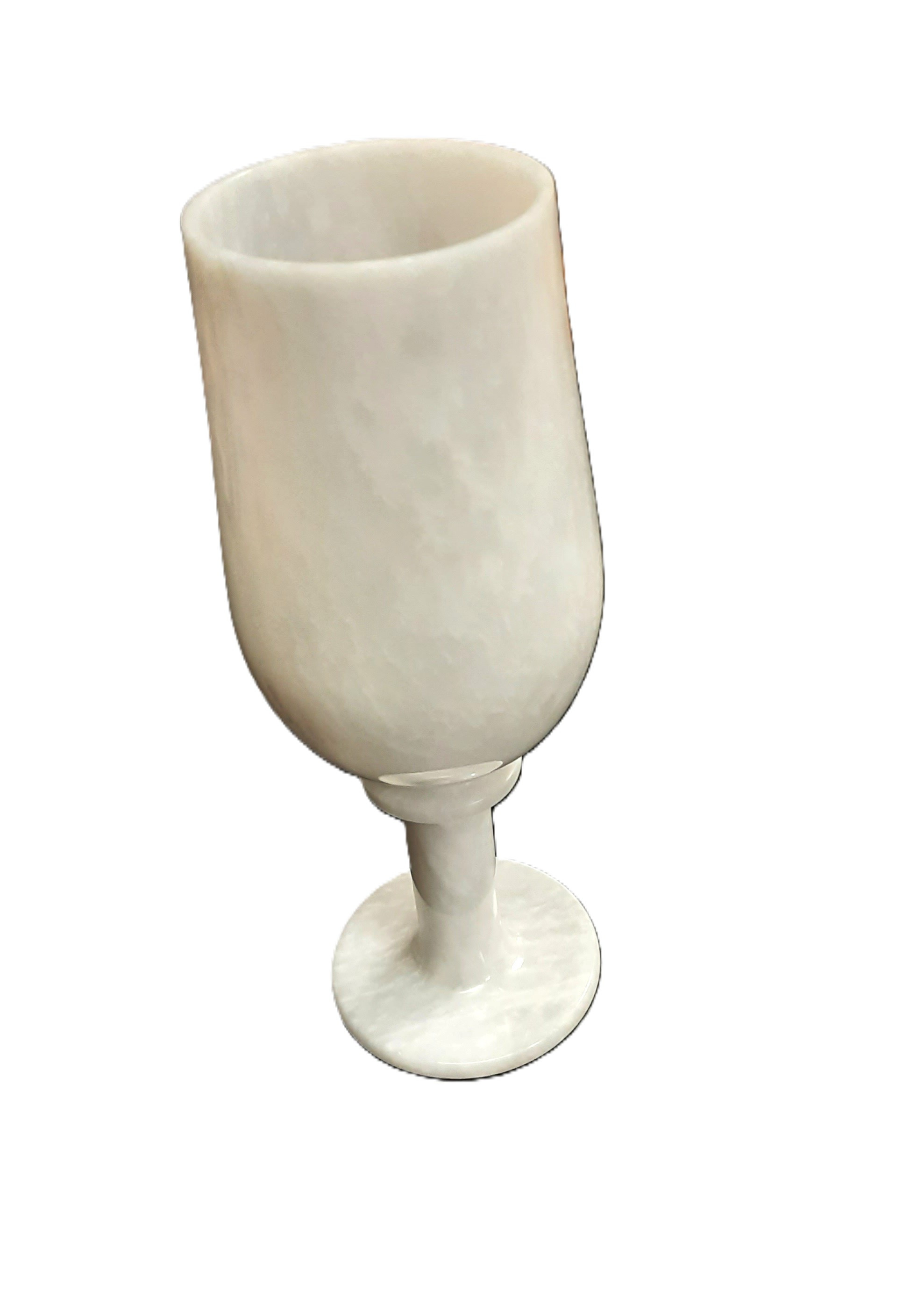 This is a handcrafted goblet carved from white onyx, also known as onyx marble or calcite onyx. Onyx of this type is commonly sourced from Pakistan and used in decorative items and tableware. The goblet has a smooth, polished surface and displays the characteristic creamy translucency and veining typical of white onyx. It weighs approximately 474 grams and stands 7.6 inches tall with a 2.75-inch base and a 2.3-inch rim. The goblet holds liquids and is structurally intact aside from a small chip on the rim.