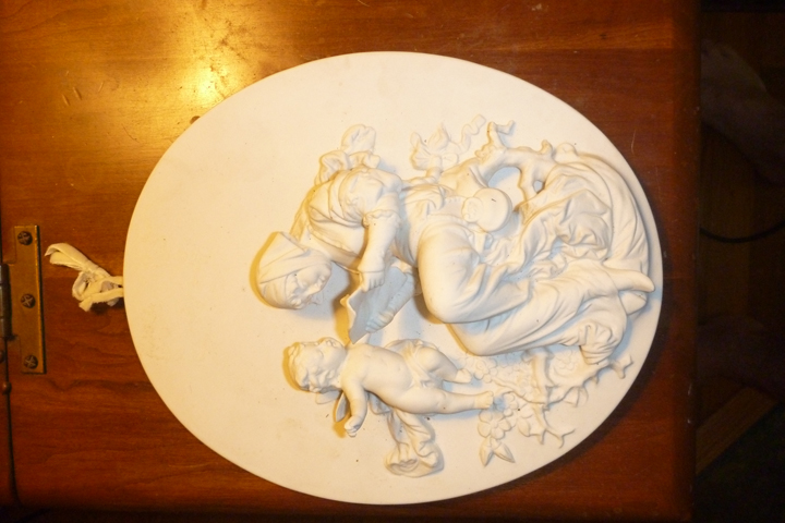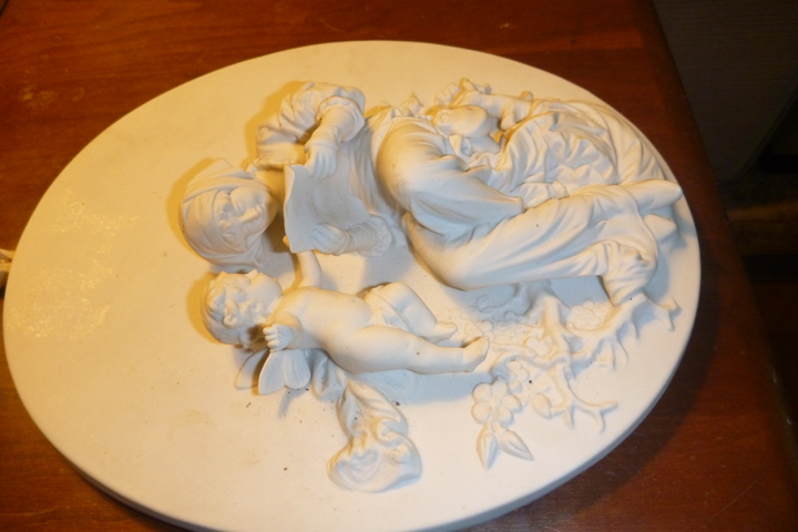 White porcelain oval art with angel and woman reading. Meant to be hung on the wall