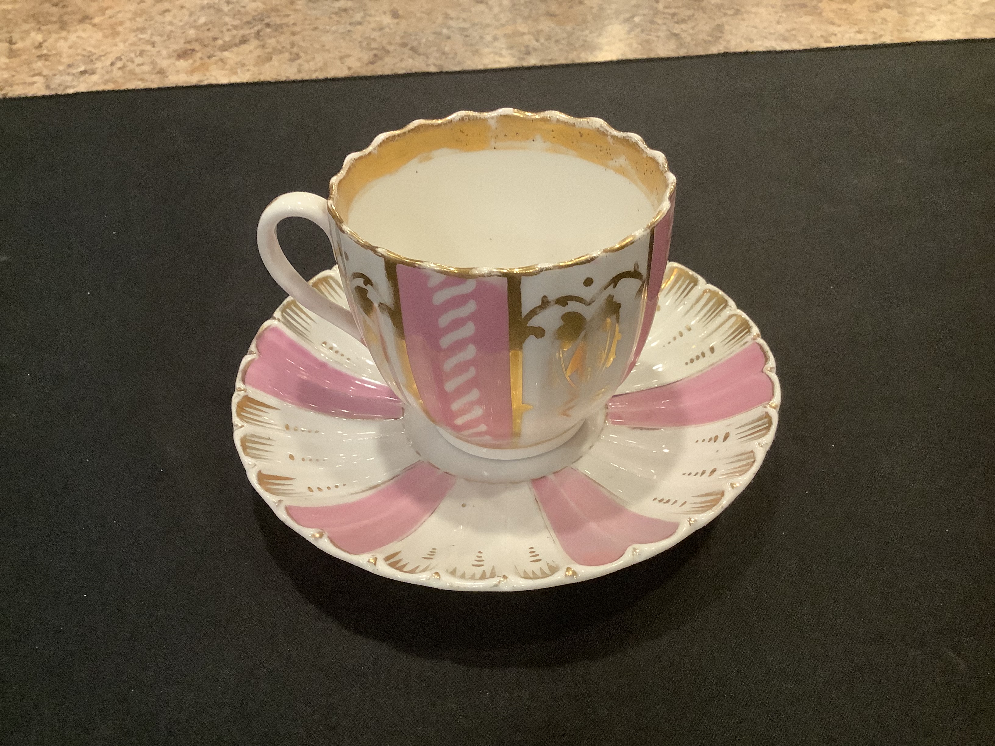 white, pink and gold teacup with saucer, again