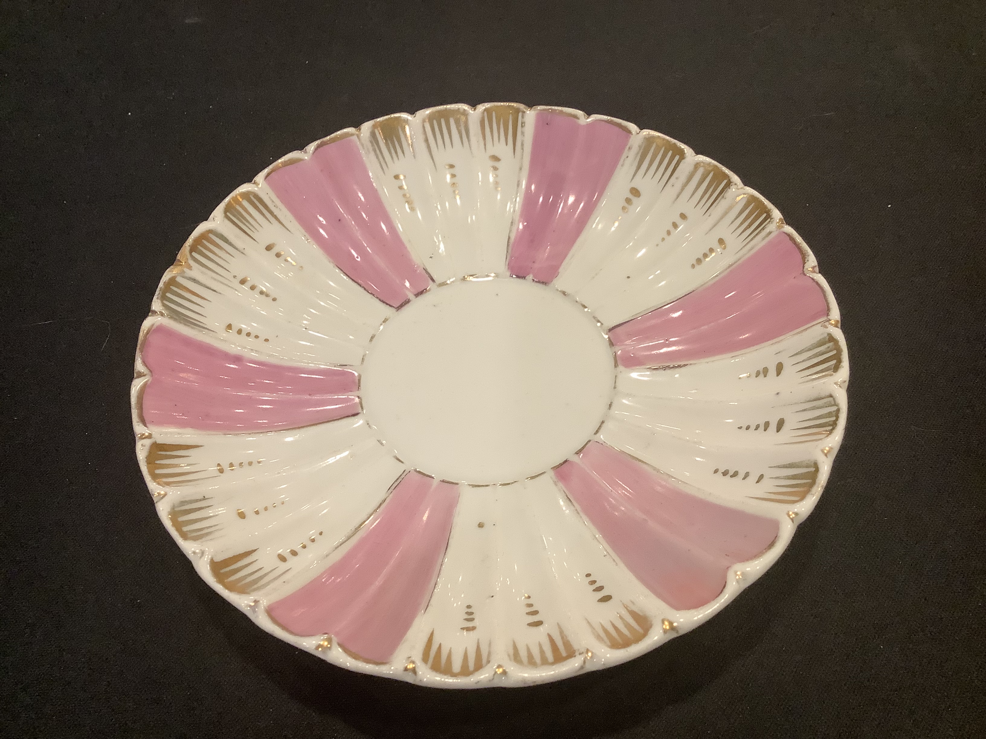 Physical Description: This vintage teacup and saucer set features a delicate design with a combination of pink and white colors, accented by gold gilding. The teacup has a light blue maker’s mark on the bottom, indicating it was produced by Carl Tielsch, a notable porcelain manufacturer. The dimensions of the teacup are approximately 3 inches in height and 4 inches in diameter, while the saucer measures about 6 inches in diameter.