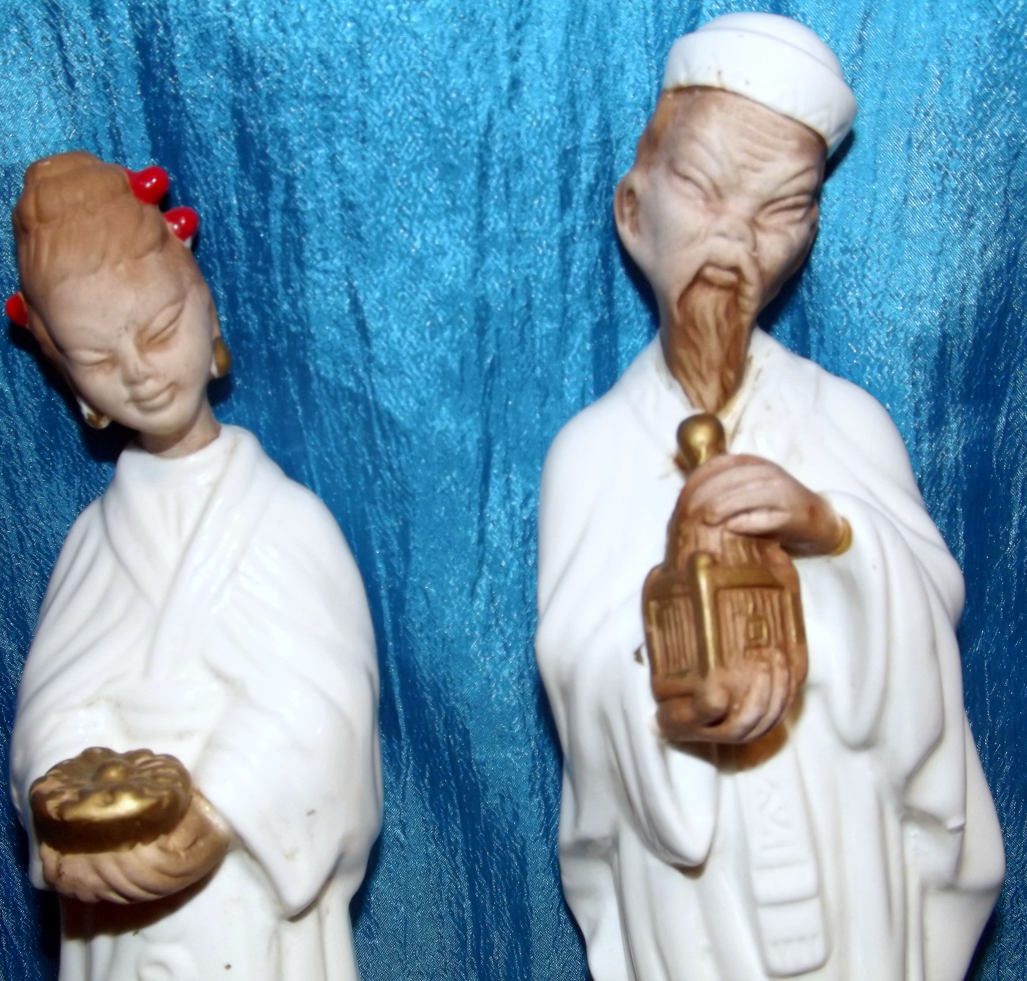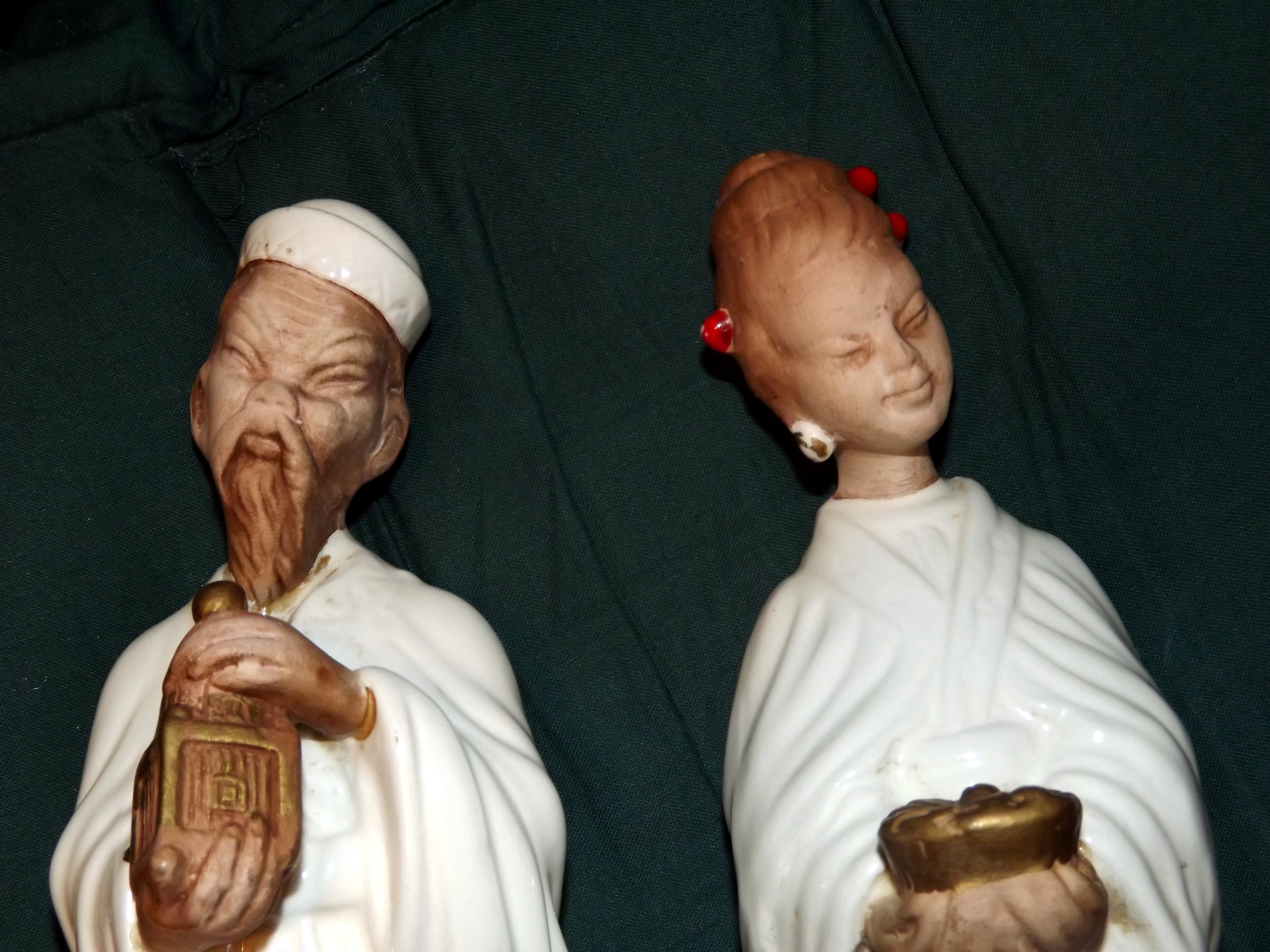 Unusual vintage pair of Manchini 9 1/2" Asian figurines. Made of pottery with fine detail and white robes. Fine detail. The woman appears to be a geisha girl and the man could be a holy man or wise man. Both pieces are marked Manchini on bottom. I do not know the age of these pieces or if the Manchini signature is Sablo Manchini of Florence Italy.