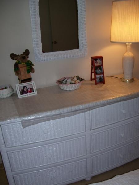 white wicker dresser wih 6 drawers and matching framed mirror and head-board for single bed.