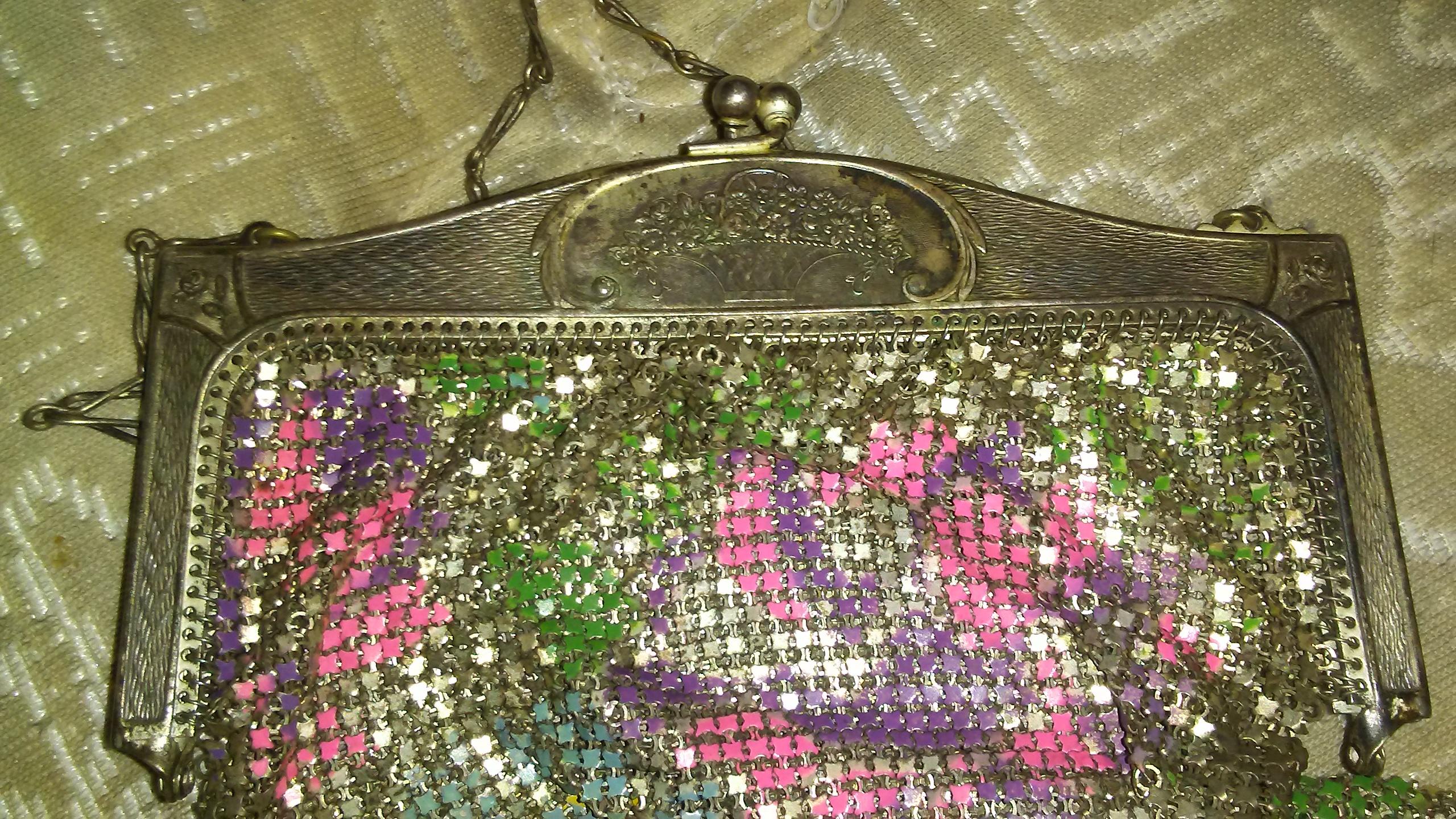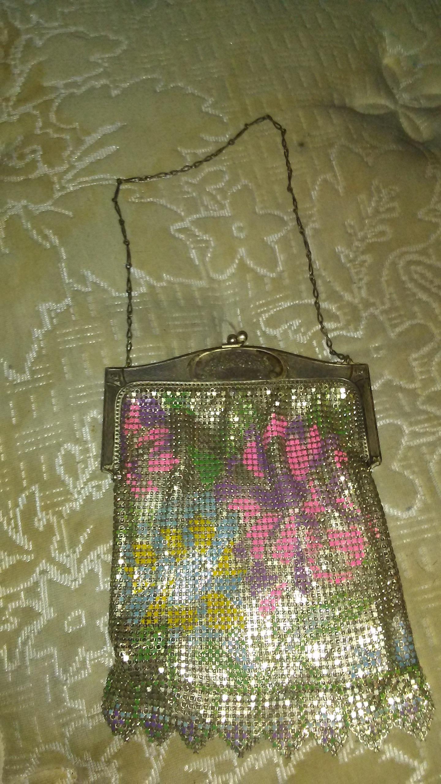 I have a whiting and davis mesh purse it has a flower design it is purple, pink, blue, yellow and green. It has a pot of flowers design on the metal clasp. It's 7 and a 1/2 inch's tall and five inches wide