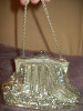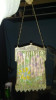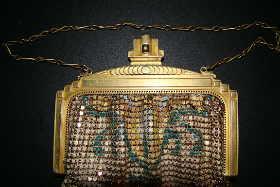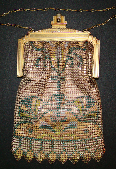 Enameled mesh shows little rubbing or wear. Colors: forest green, pale blues, creams, gold, orange, lime, rose...a matching deco flower-type pattern on front and back. In remarkable shape.