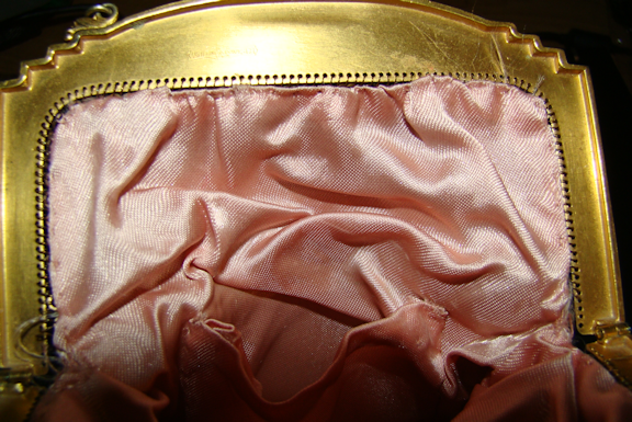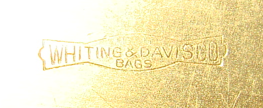 Gold plated bezel with very little wear, original link chain. Enamel on mesh is perfect, no missing or bent links, mesh is perfectly secured to bezel with no damage, original pale pink satin lining with pocked. No rips or holes in satin. Stamped with Whiting and Davis Co. emblem.