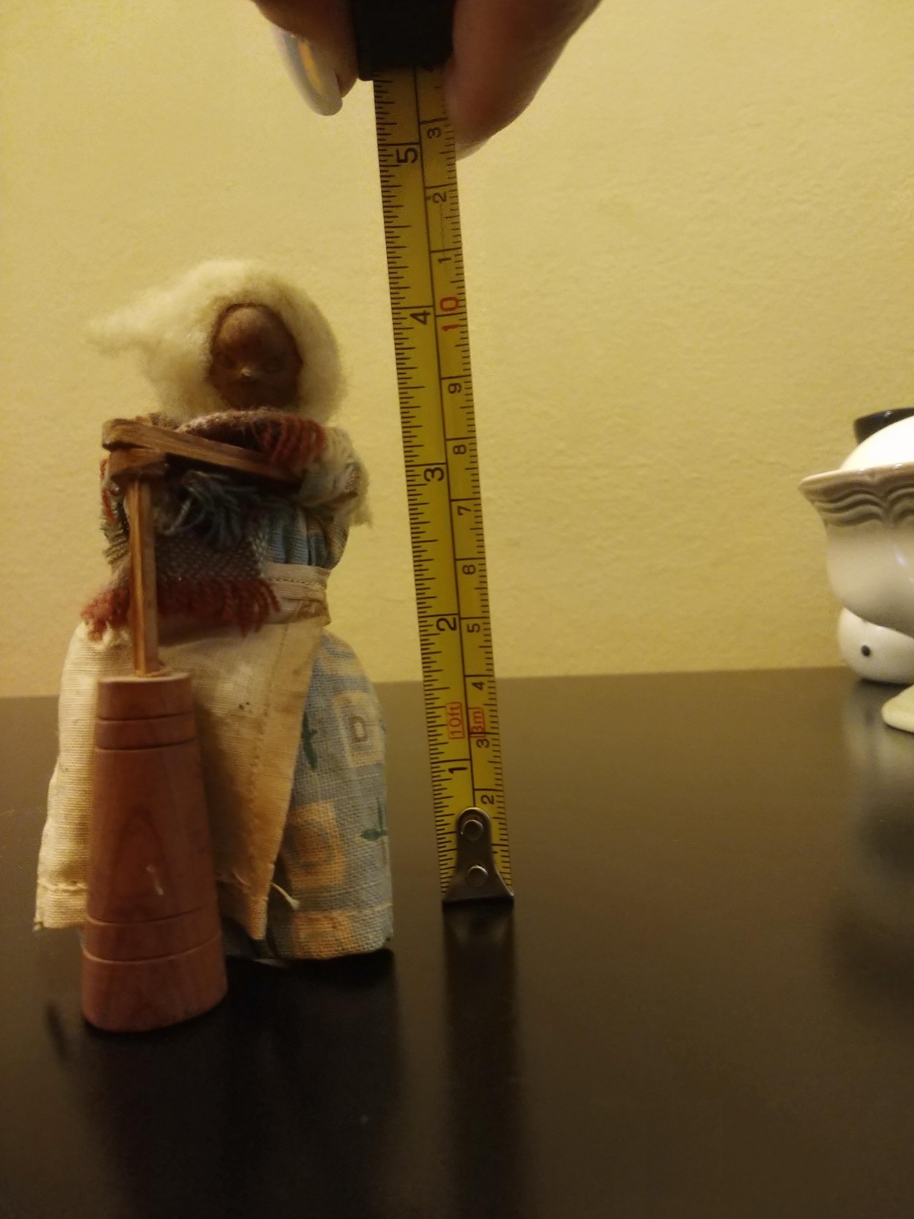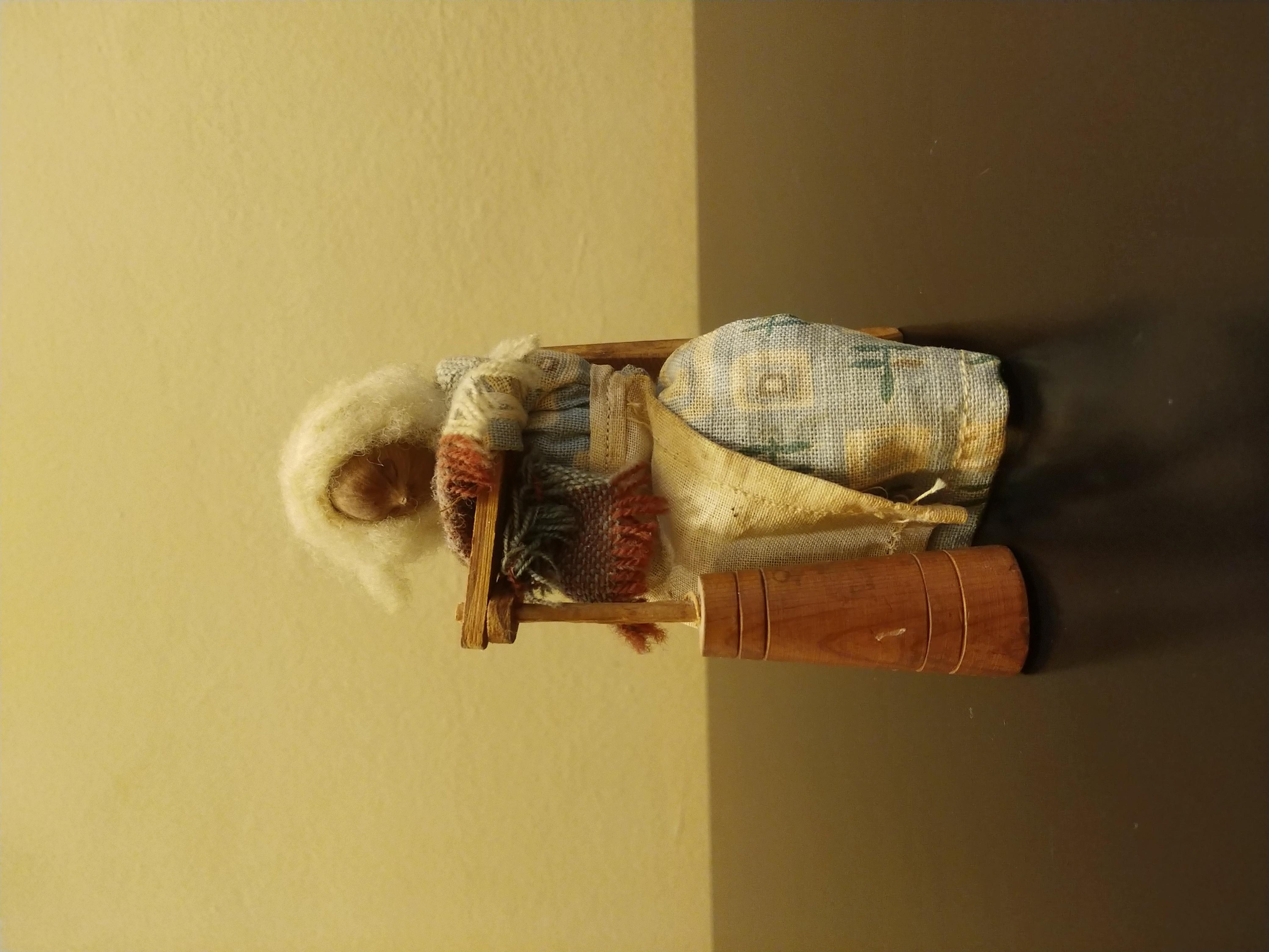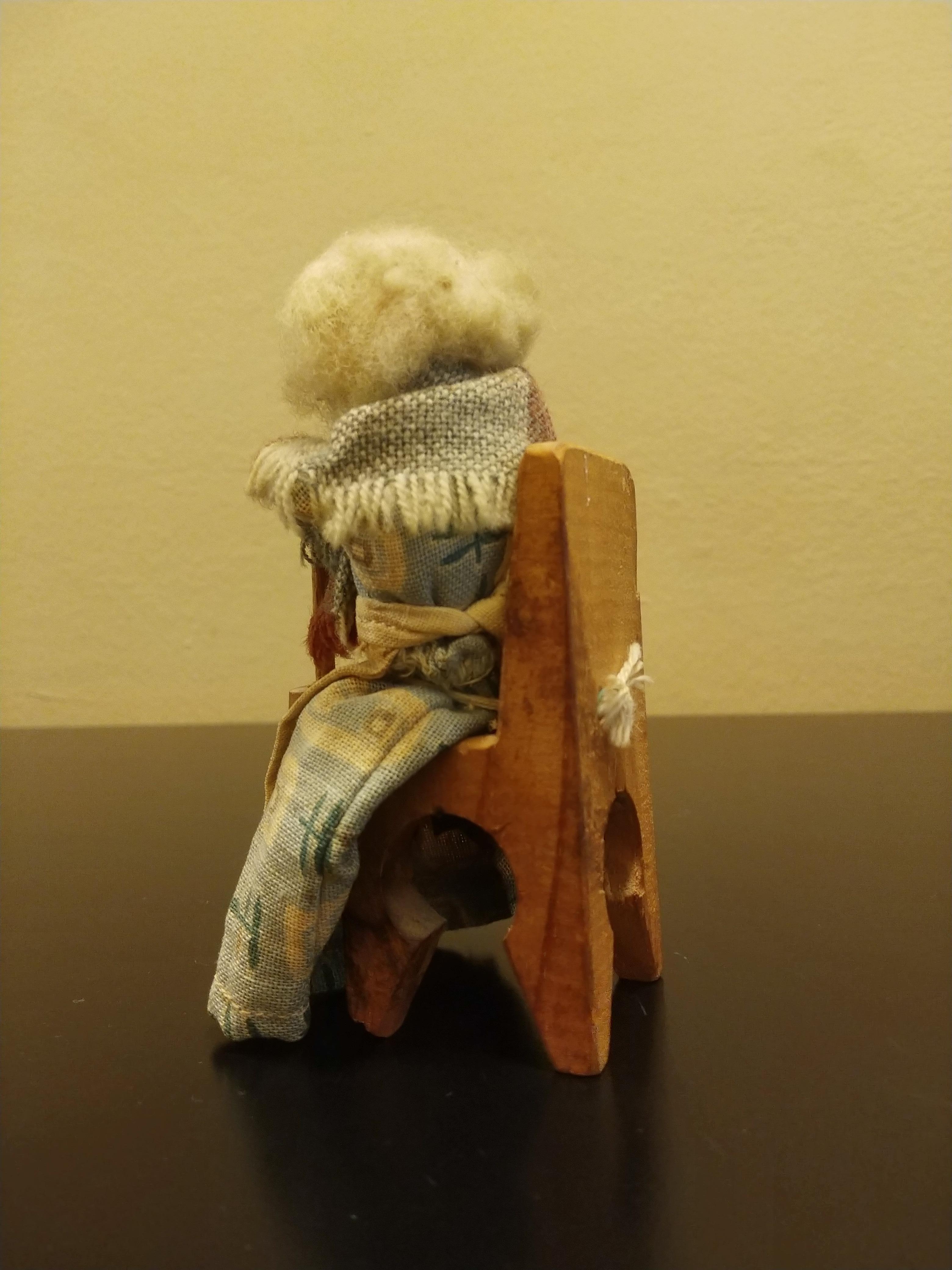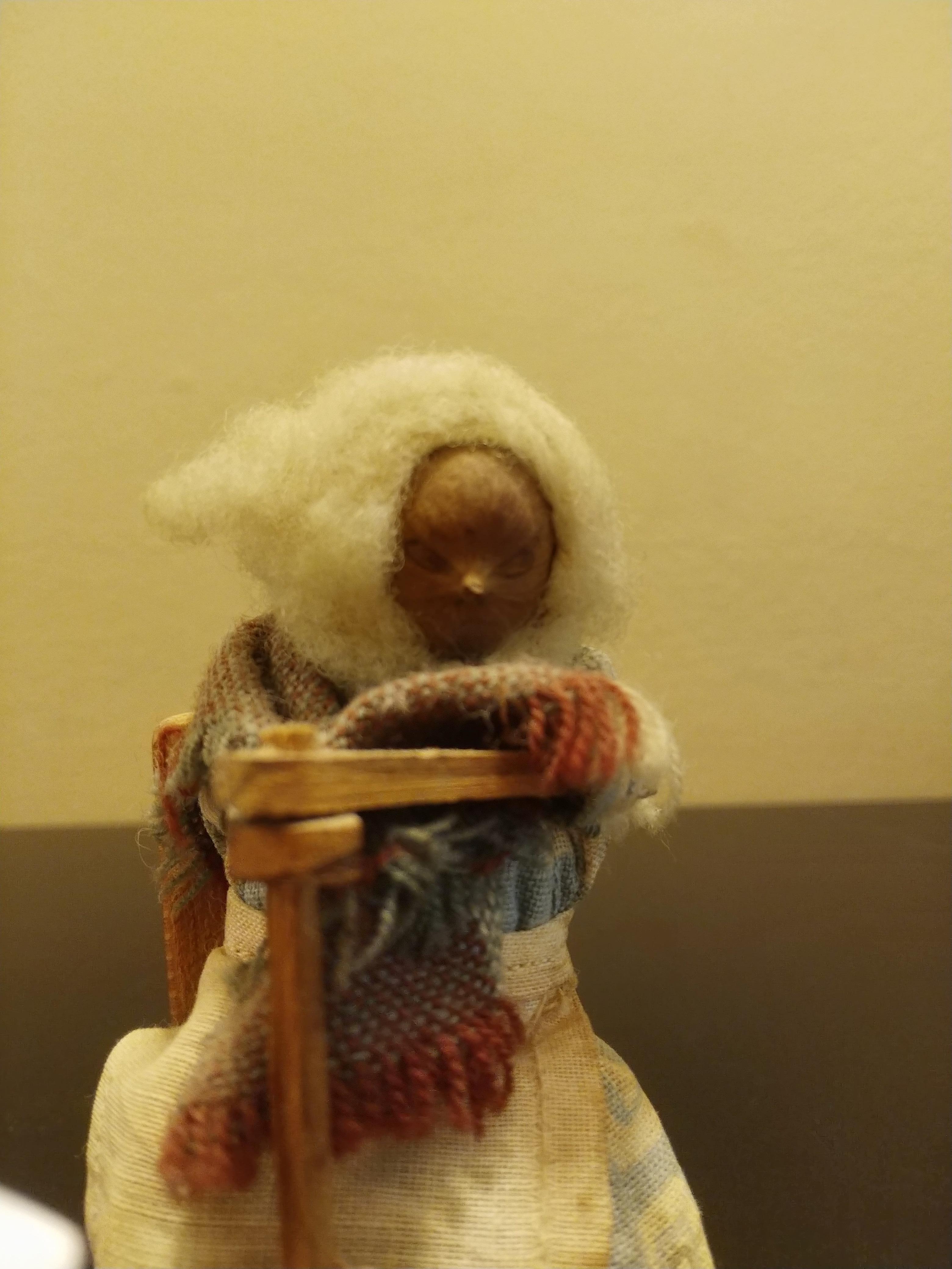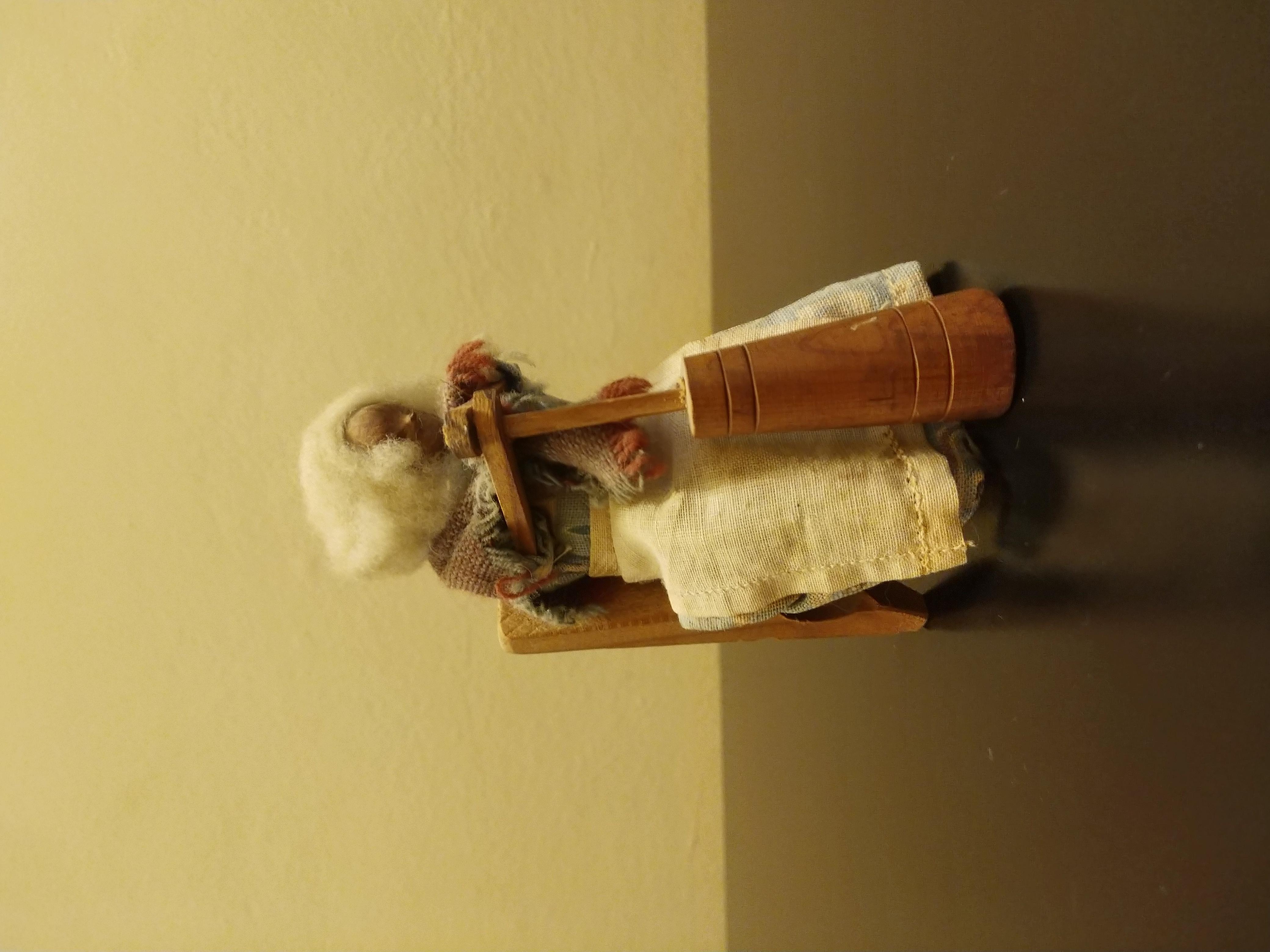 I recently aquired a wood carving that looks like a woman with wool hair using an 18th century churning tool. She is tied with string to her chair in the back. It appears to be missing a leg of the chair where her churning tool is, so it stands just fine. Her face looks as though it is made out of a hazelnut or chestnut or another type of nut. I do not have any background information regarding this piece. I purchased them along with other items in an abandoned storage unit in box labeled "antiques”. Could you please tell me about how old these pieces might be and how much they could possibly be worth? Thank you for your time.