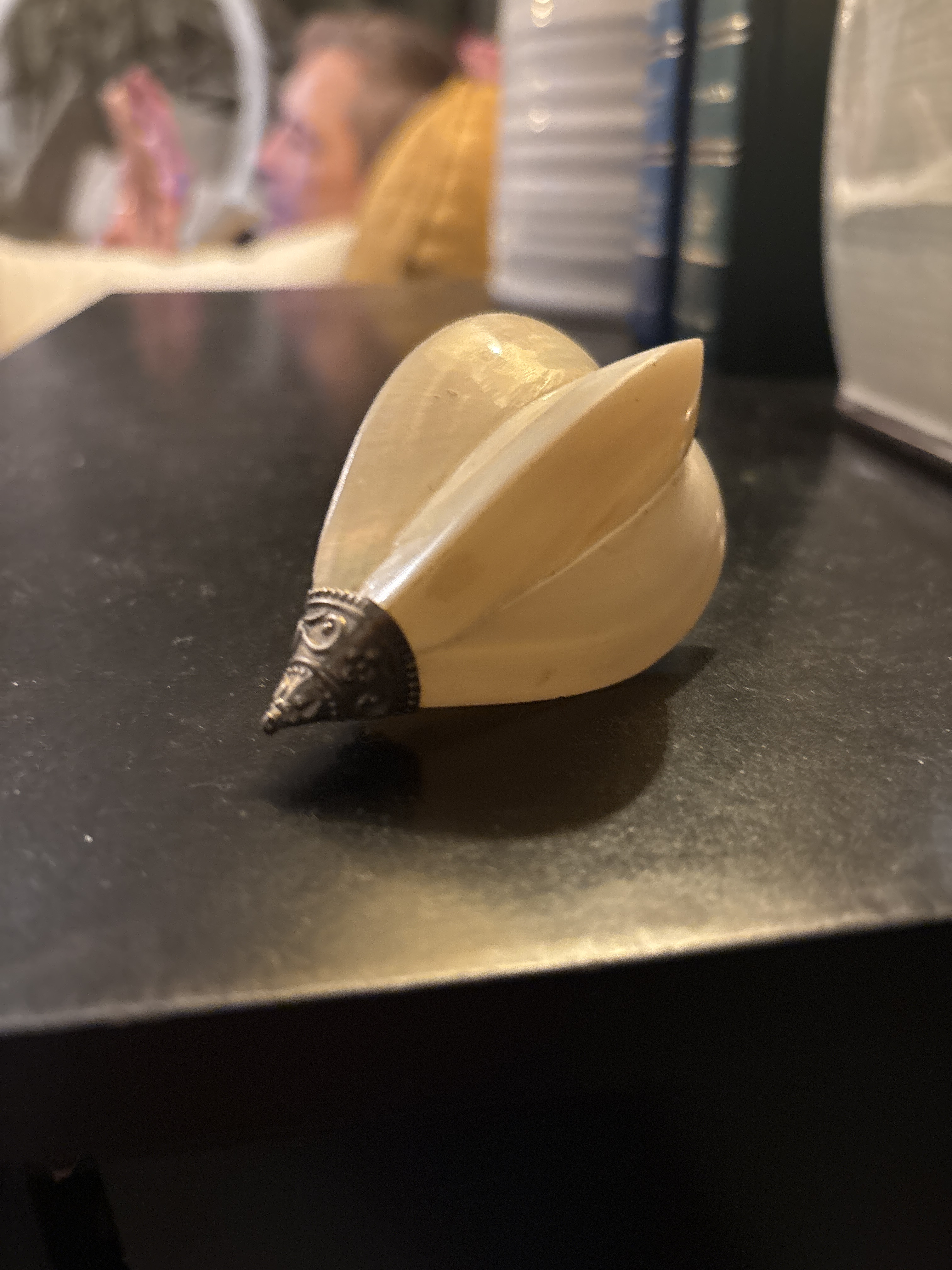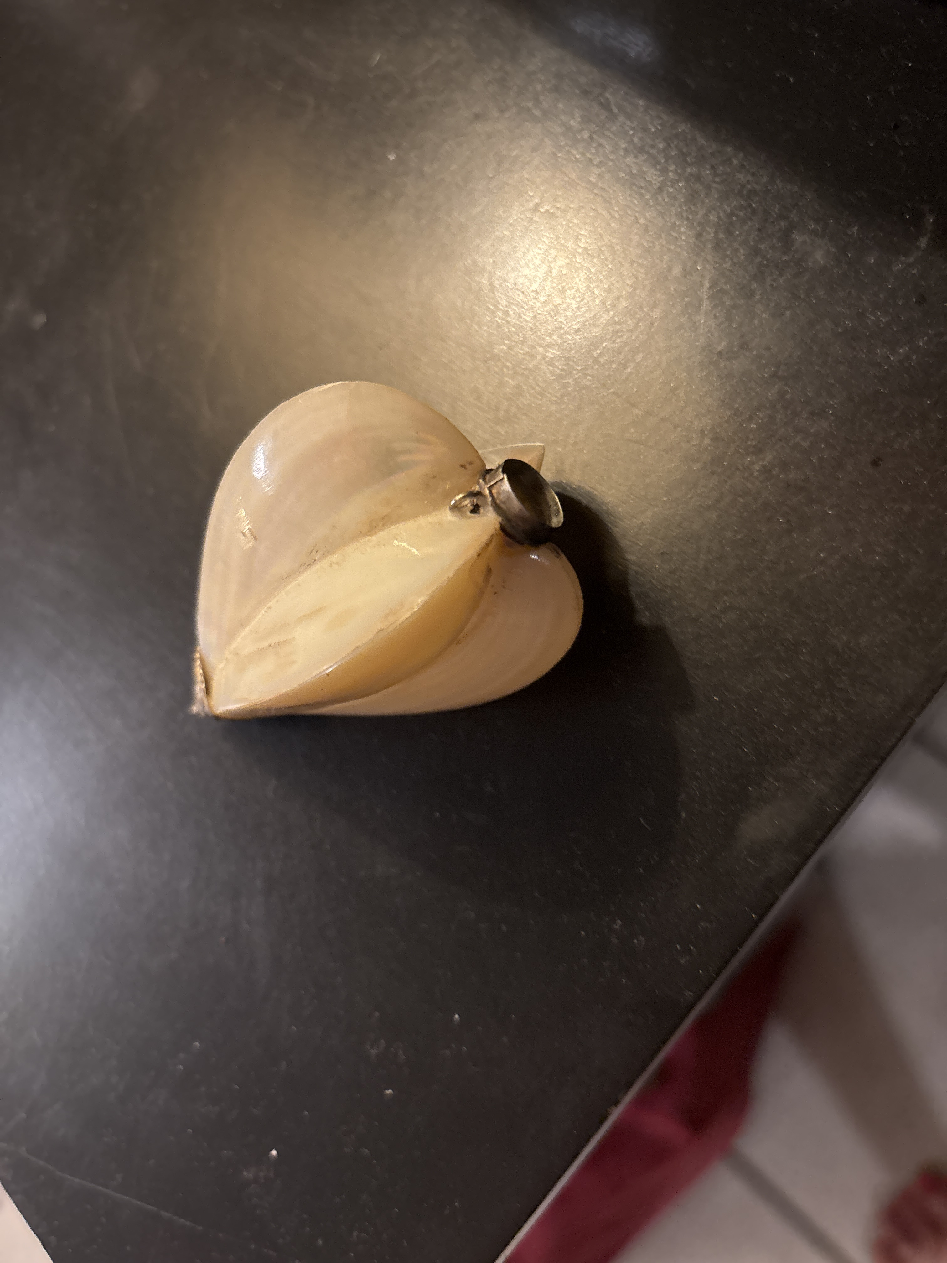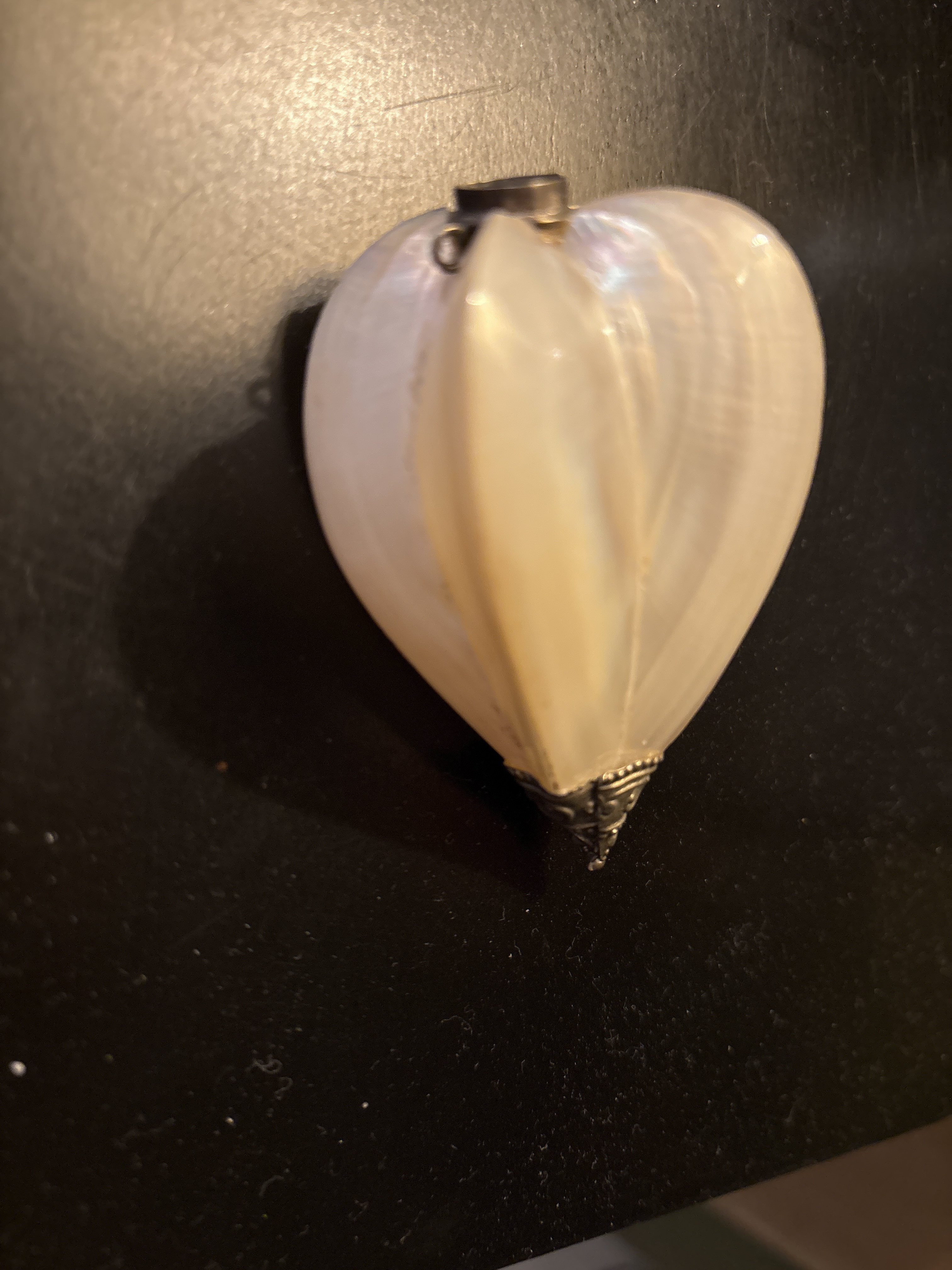 Physical Description: This unique vessel is crafted from shell, featuring a heart-like shape with a silver-toned metal cap at the top, suggesting it may have originally had a cork or similar closure. The approximate dimensions are 3 inches in length and 2 inches in width. The vessel's exterior showcases a smooth, glossy surface with natural color variations typical of shell materials.