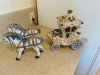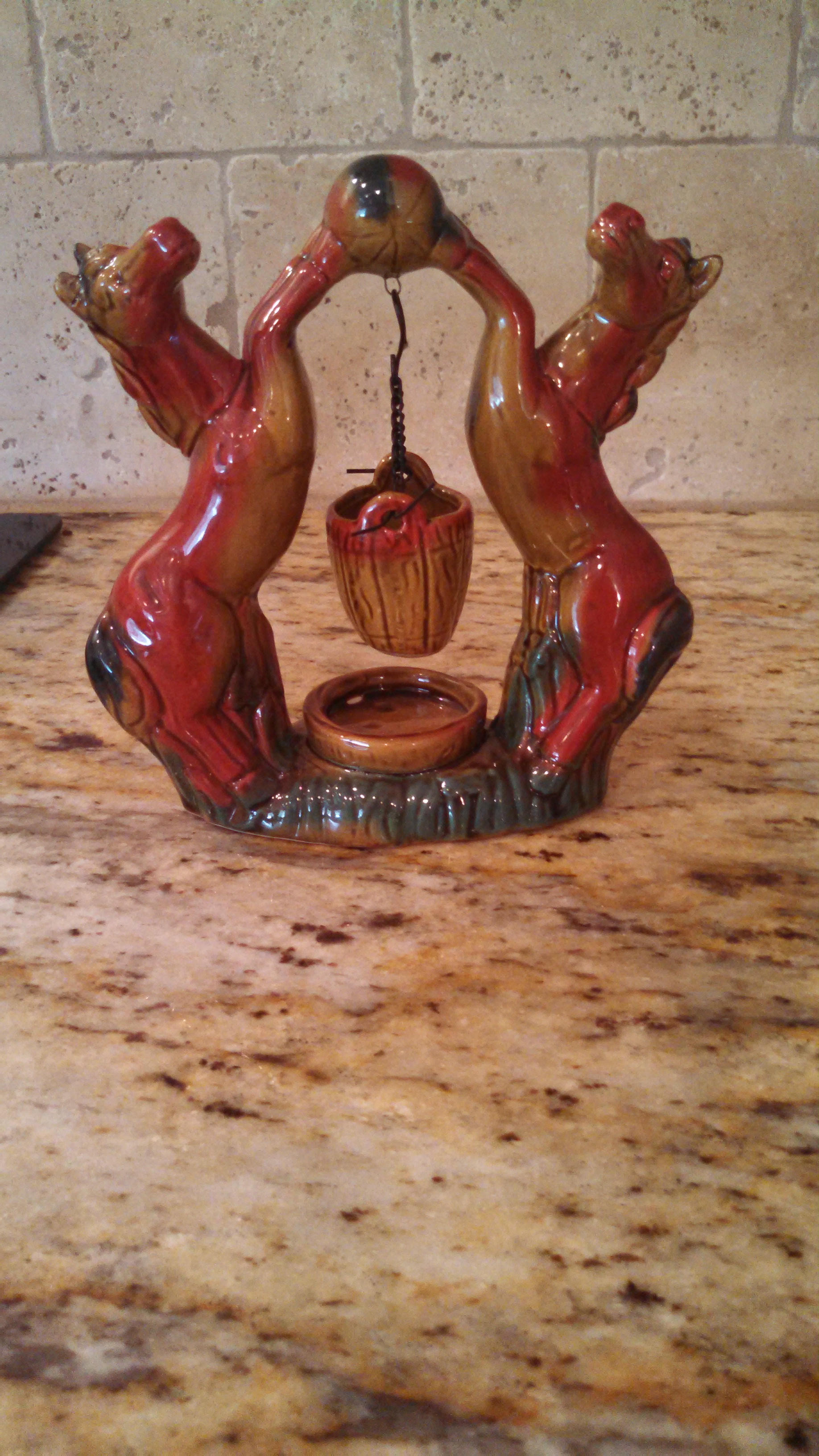 This figurine is unusual. It is two horses playing basketball with a waterbucket, held up by a chain, as a hoop. It is red, green and gold. It measures 6 1/2 inches tall and 6 inches wide. There are no makers marks of any kind that I am able to find.