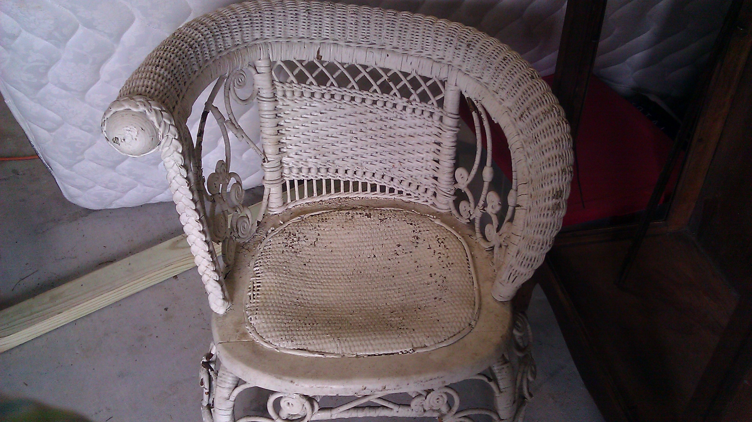 The chair is in pretty good shape just needs a paint job. the paint is peeling off. the wick is very heavy. has a unique design. seat cushion is good