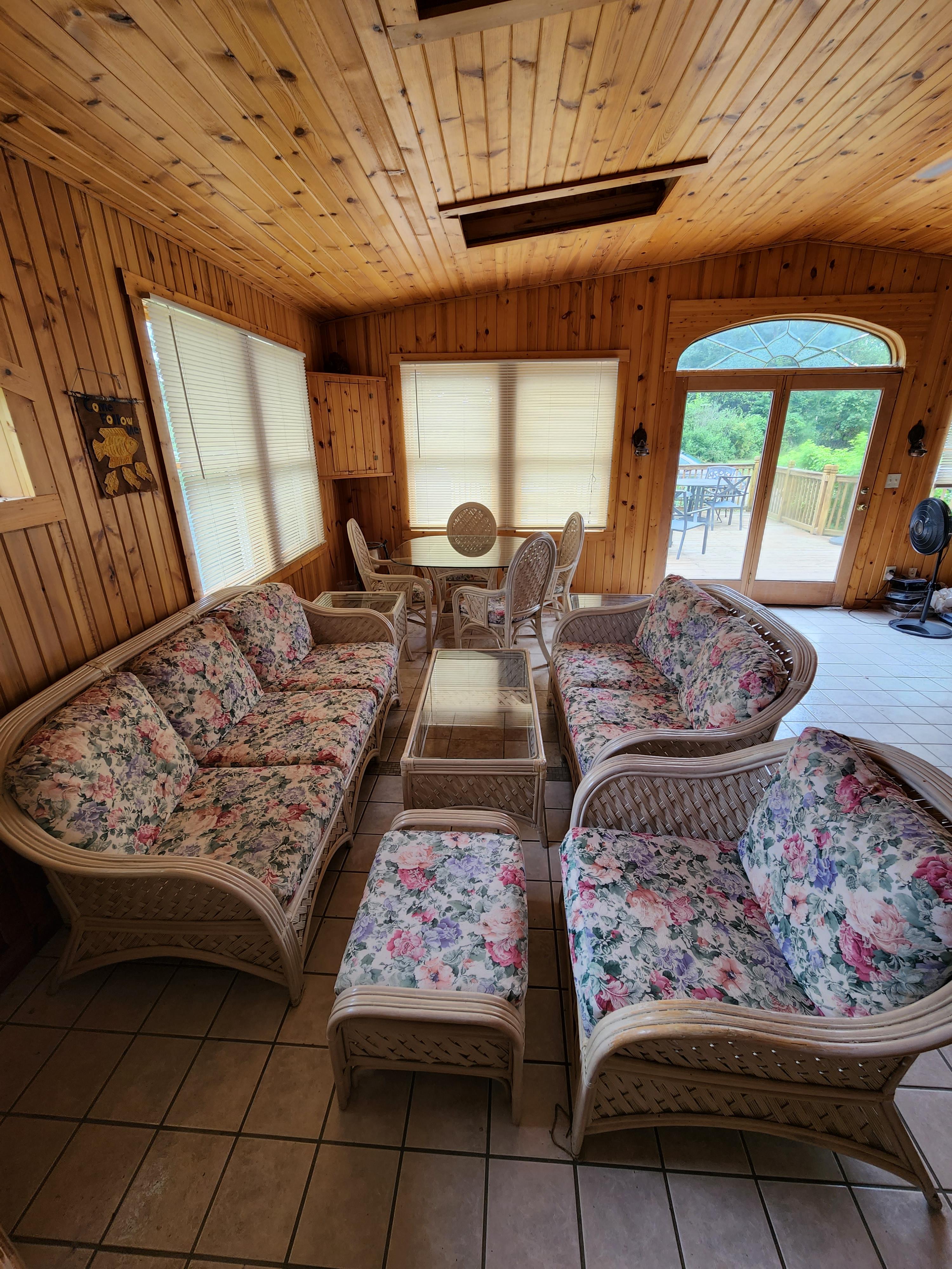 Set includes: dining table?, coffee table, 2 end tables, couch, loveseat, lounge chair with ottoman, 4 armchairs chairs. Painted white wicker with floral pattern cushions.