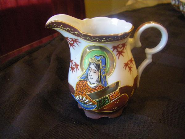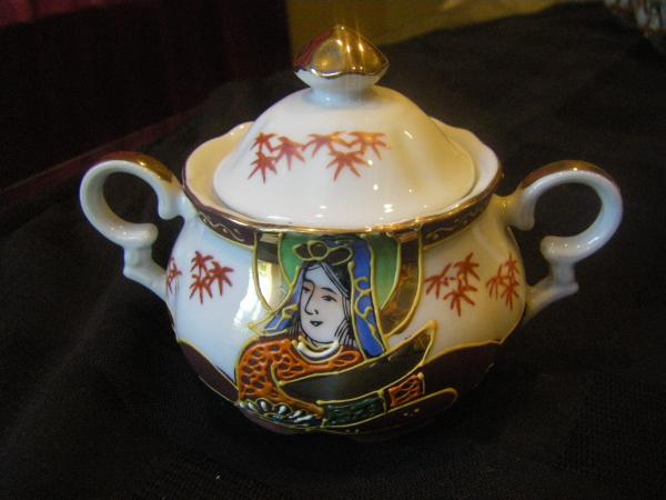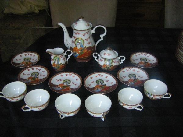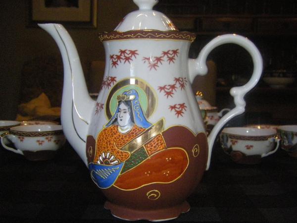 Teapot, 6 cups w/ saucers, sugar container, cream dispenser