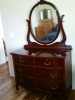 Description cherry wood, two small drawers side-by-side, two deep drawers at bottom. oval mirror attached with metal decorative fixtures (screws? maybe?)