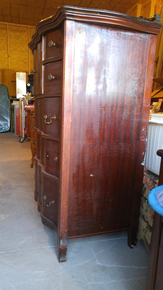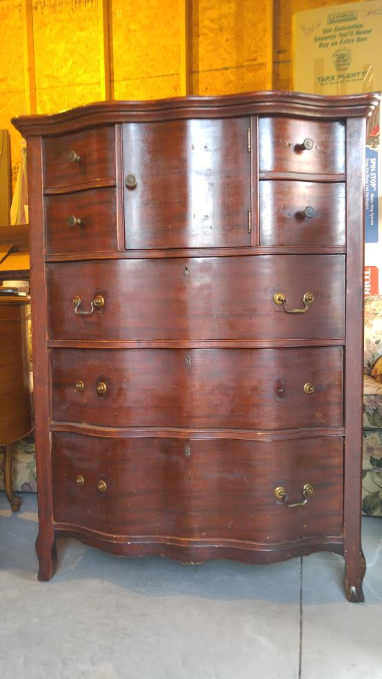 I believe it to be from the Widdicomb Furniture Company and made in 1899. I think it is walnut, the drawers are dovetailed. The top 4 drawers have been redrilled for single knobs instead of the 2 pronged pull knobs shown on the other drawers. I have a mirror, but I don't believe that it really goes with this piece. It is 38" W 22" D 48 1/2"H.