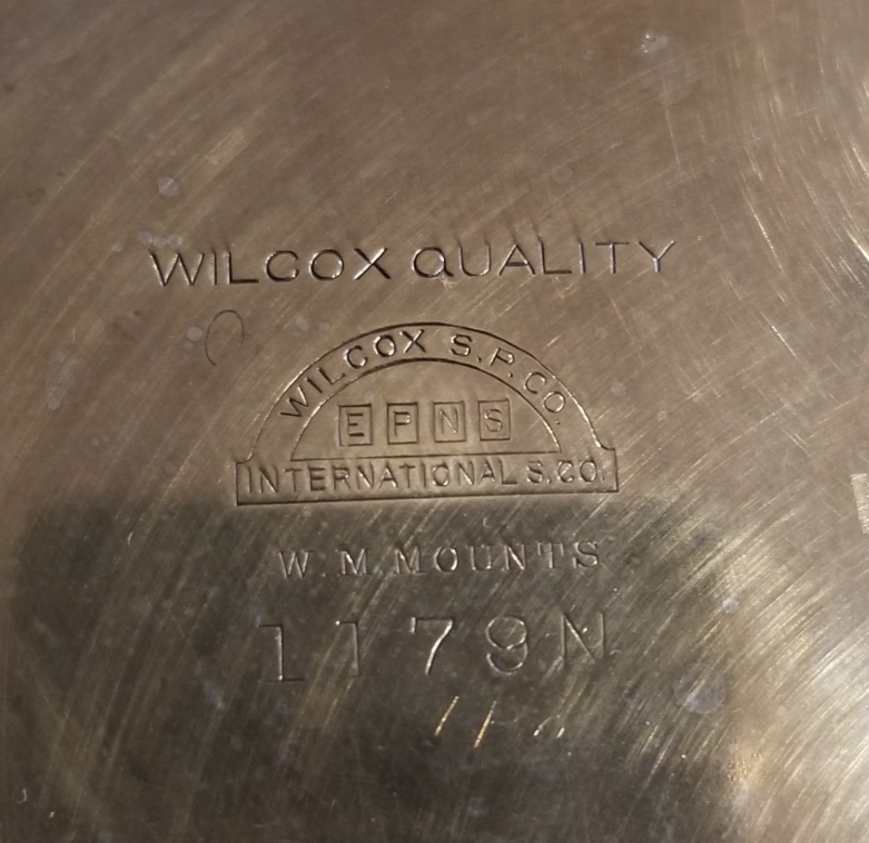 I found a nice piece at a Goodwill store that I am looking for information on. I have searched the internet and cannot seem to find one like it. The back is stamped WILCOX QUALITY with a trade mark half circle Wilcox S.P. Co International S.CO. In the center is the blocks E F N S. Under that is W.M.Mounts and the numbers/letter 1179N
