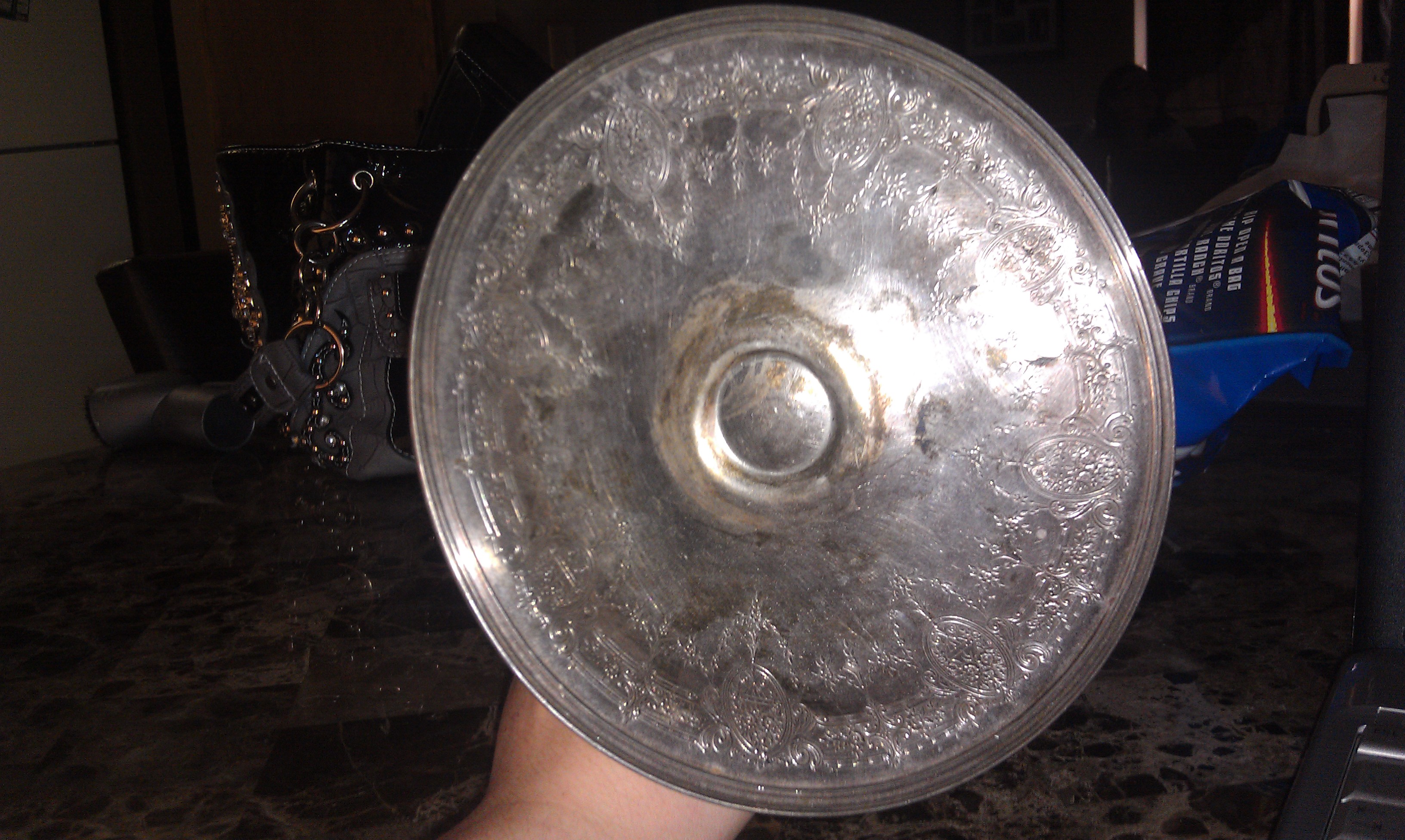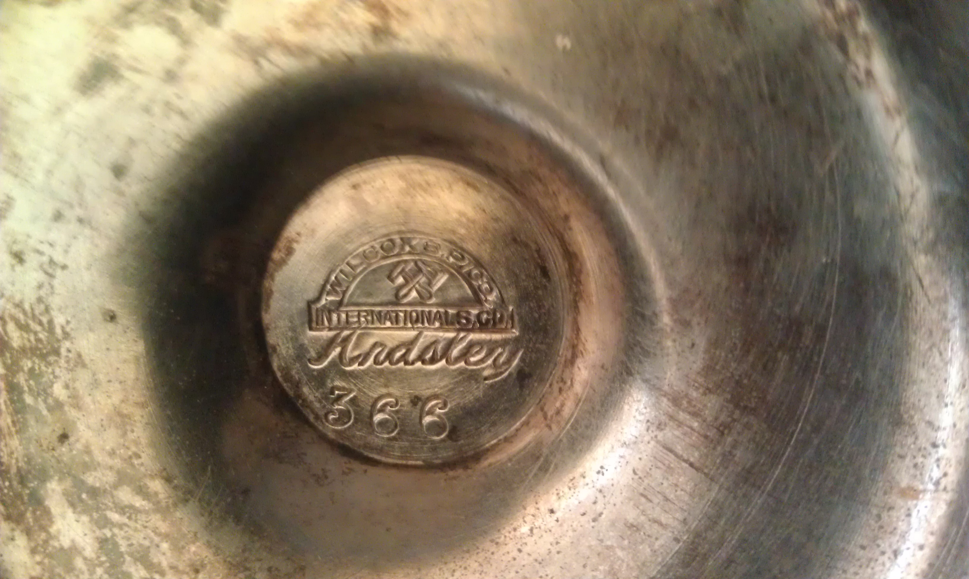 it is a silver plate type thing on the bottom it has wilcoxs,p.co below tht it says internationals.co and below that it says andsley 366