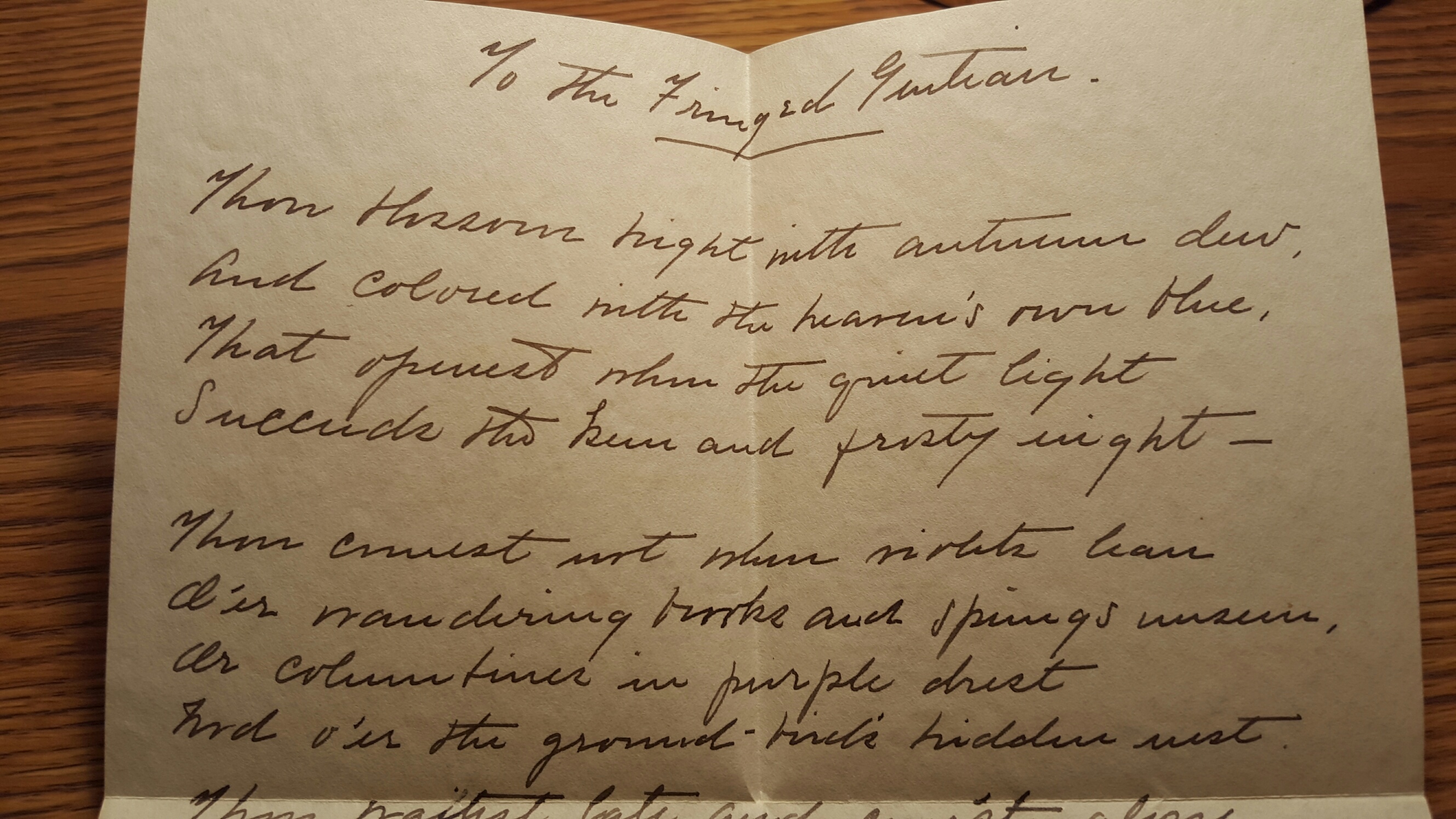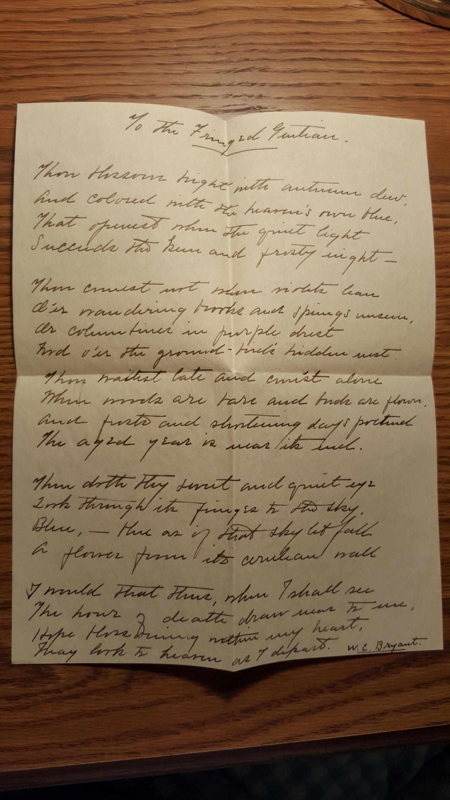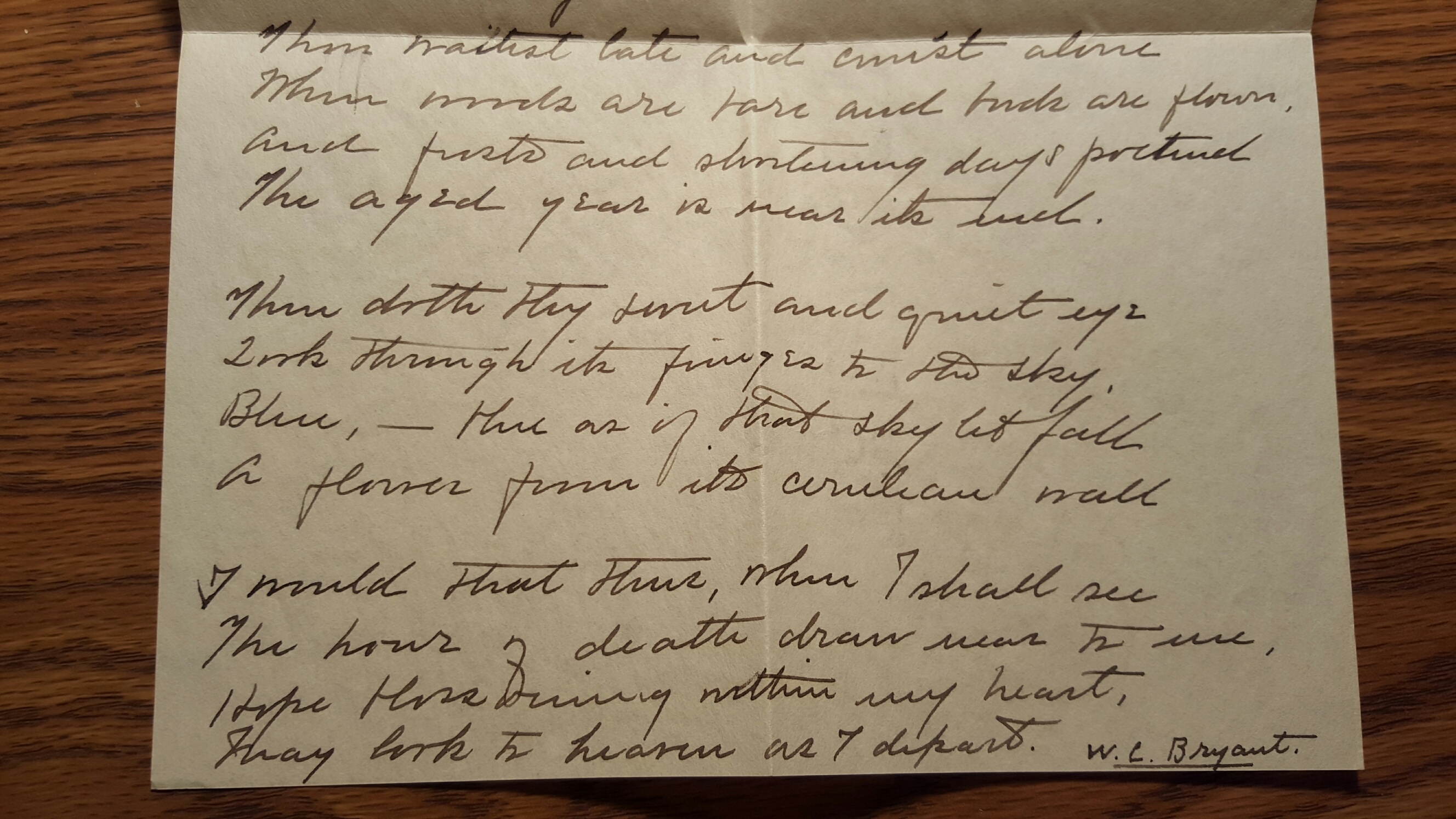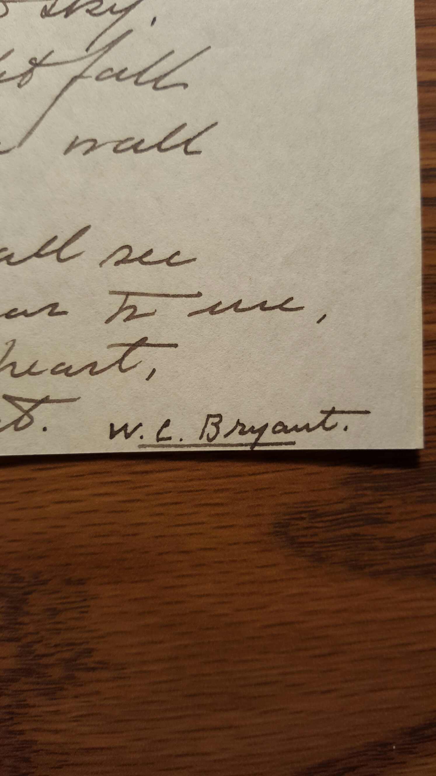 This was found inside of a scrapbook which was given as a present to Bertha E. Chamberlaine in 1885. It seems she was interested in poetry, or was an aspiring poet herself. The scrapbook also contains handwritten and/or signed poems by James Berry Bensel ("She and I") and Margaret E. Sangster ("Our Own"). I would like to know if this is an authentic piece, and what the value may be.
