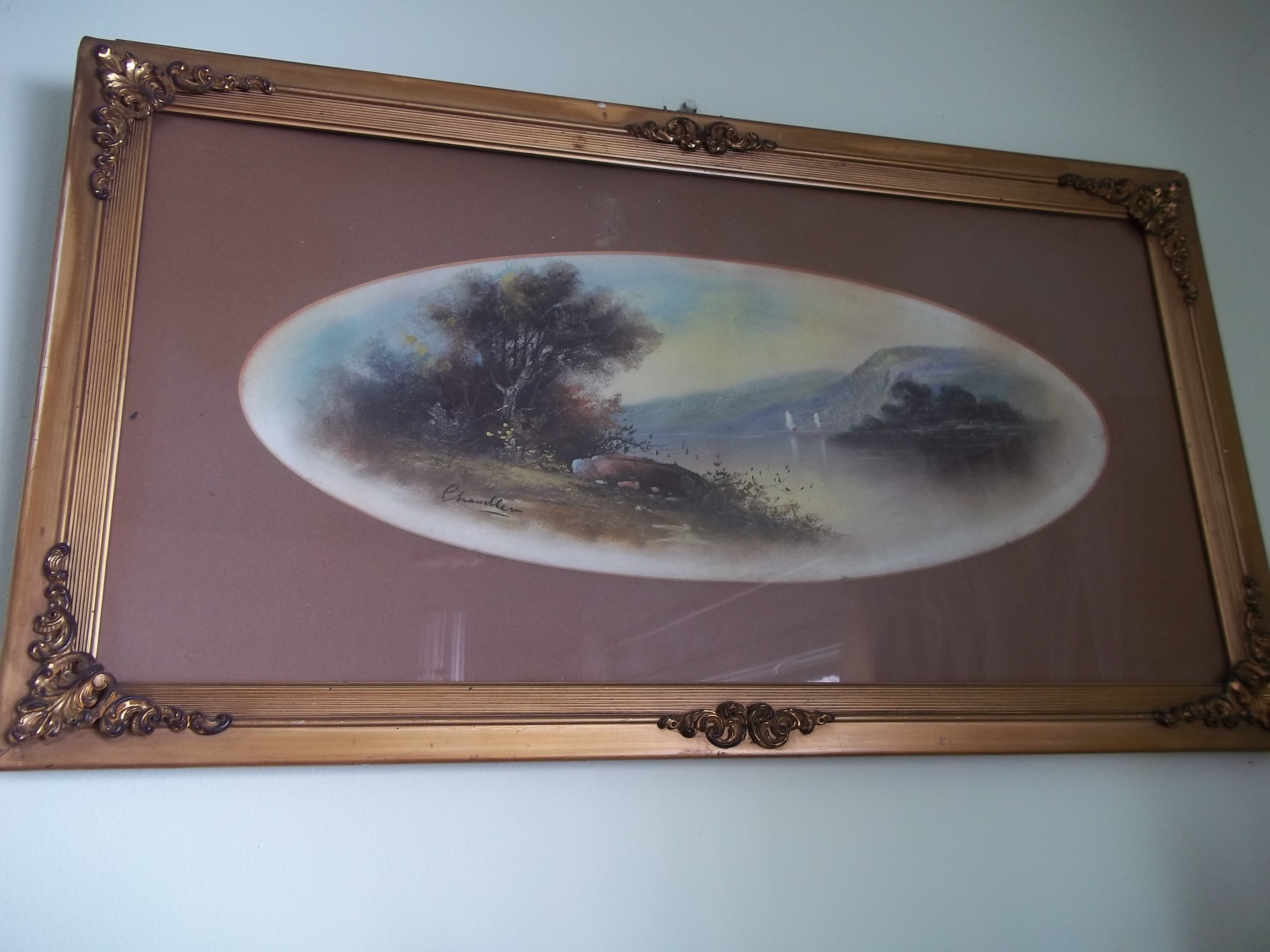 belonged to great granfather. has a metal frame with glass over. landscape. signed Chandler in left lower corner