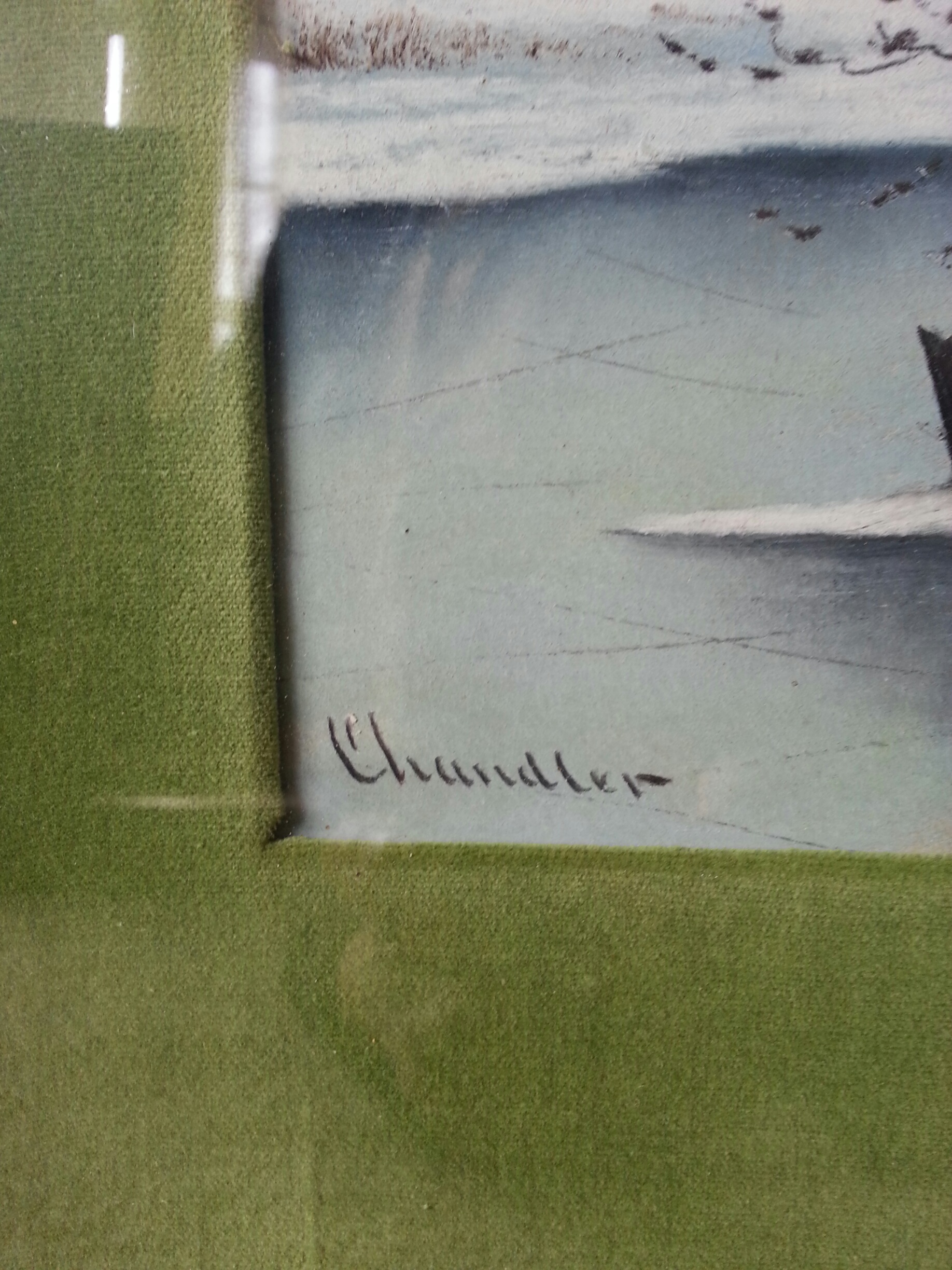 I am interested in finding out what the enclosed pair of Chandler pastels are worth. Both are in excellent condition.. no rips or tears and no fading. The frames are original and in excellent condition too. I also took copies of the backs which are original and in very good condition. Not sure of the actual size of the artwork. But measuring on the glass side is 22x8 for each. There are 5 pics altogether.