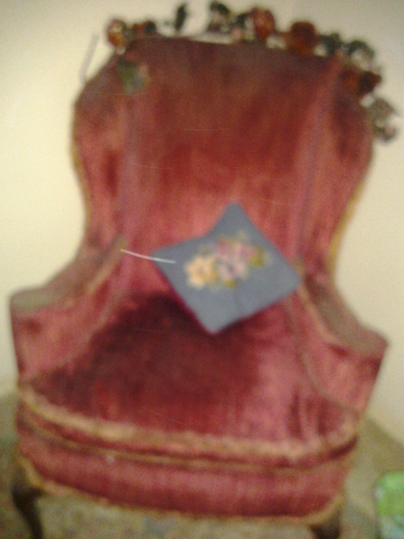 a red crushed velvet chair i bought at a historical auction many years ago.and wad guarenteed that it was from dr. william penns own home in 1690