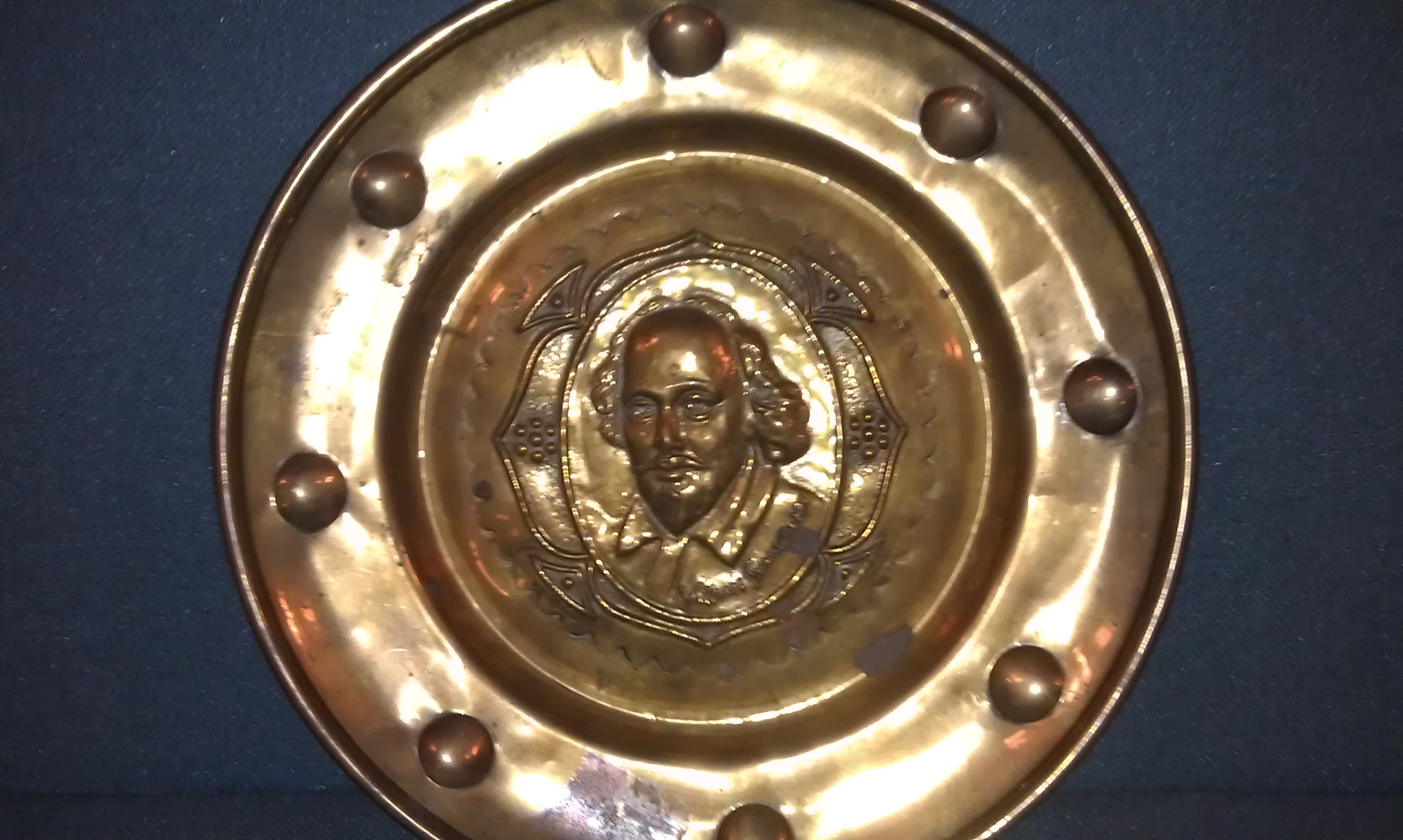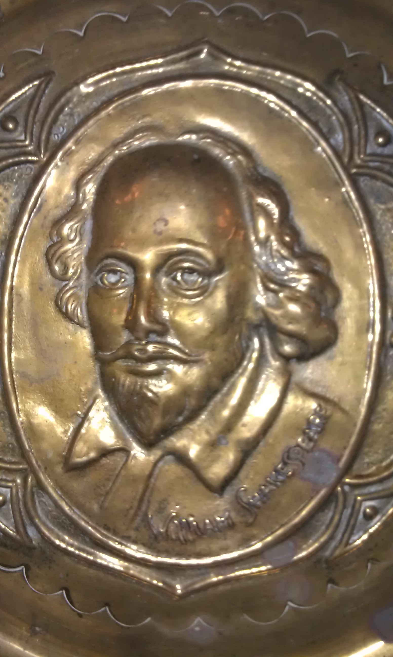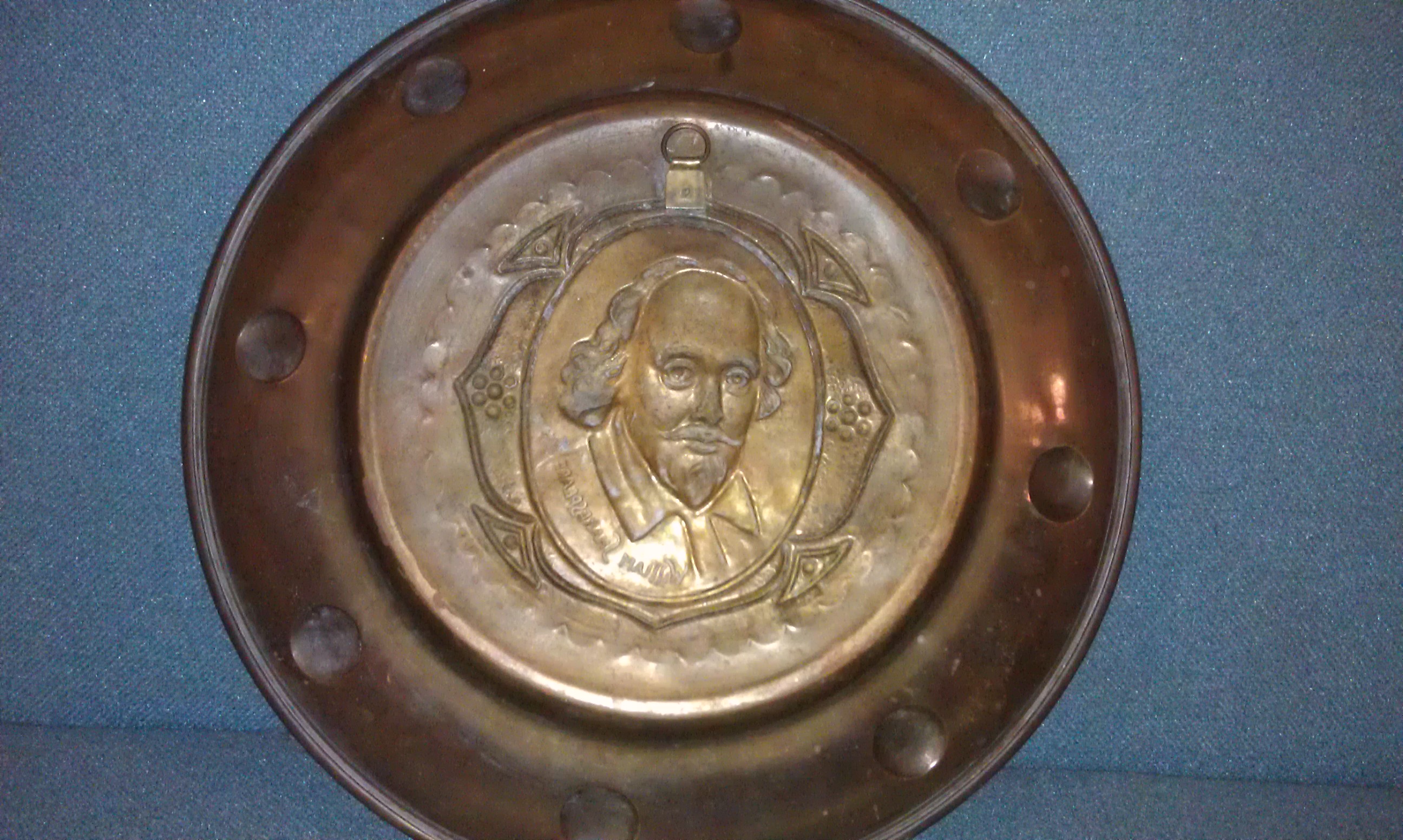 I have a brass plate of William Shakespeare in the center with his name engraved as you can see, Also the scene of his picture is on the back and looks amazing in front of a good light and for the age. It appears to be hand crafted by a art sculpture of sort. To be sure it's worth something to the William Shakespeare collectors. See the pictures below.