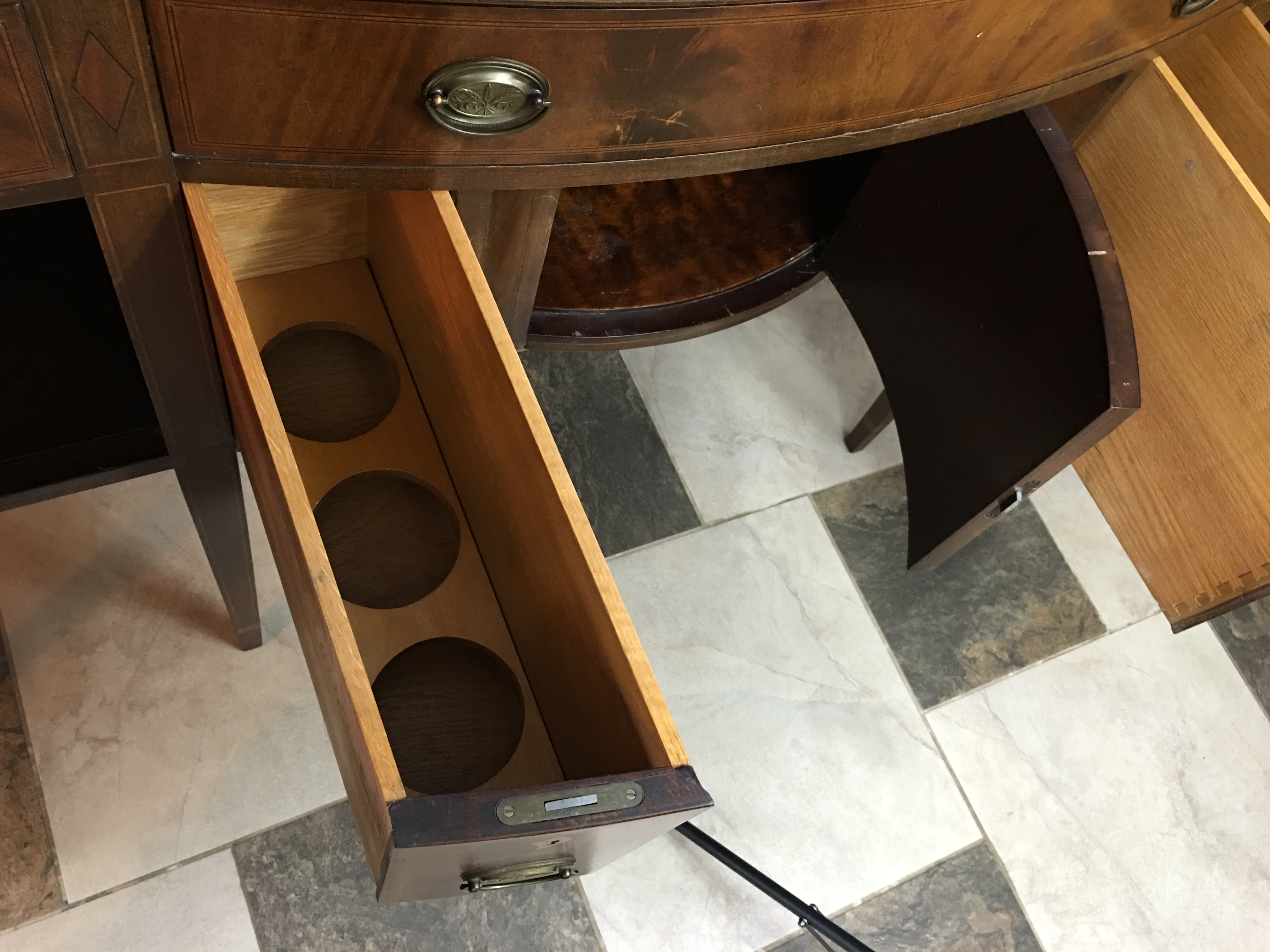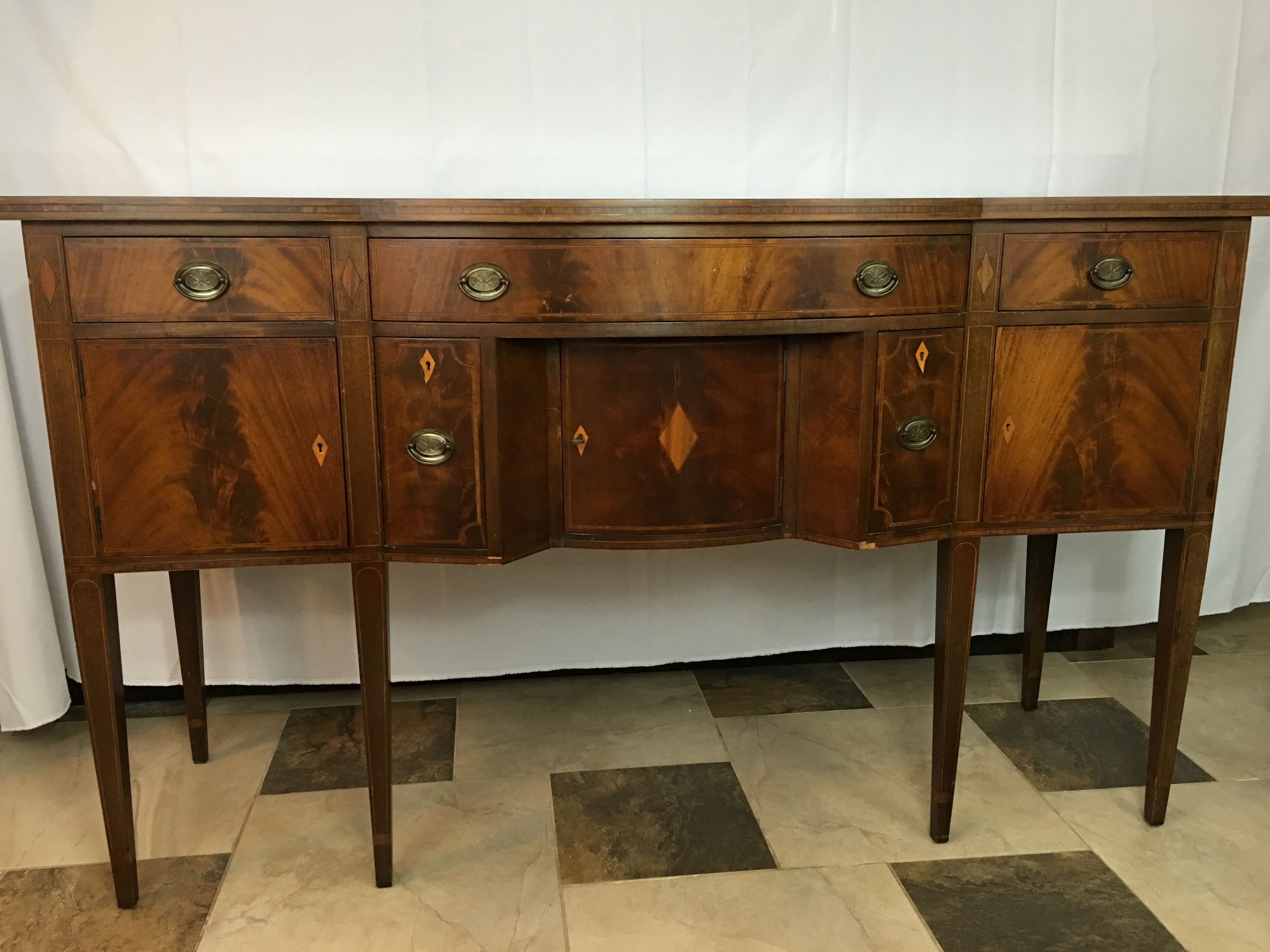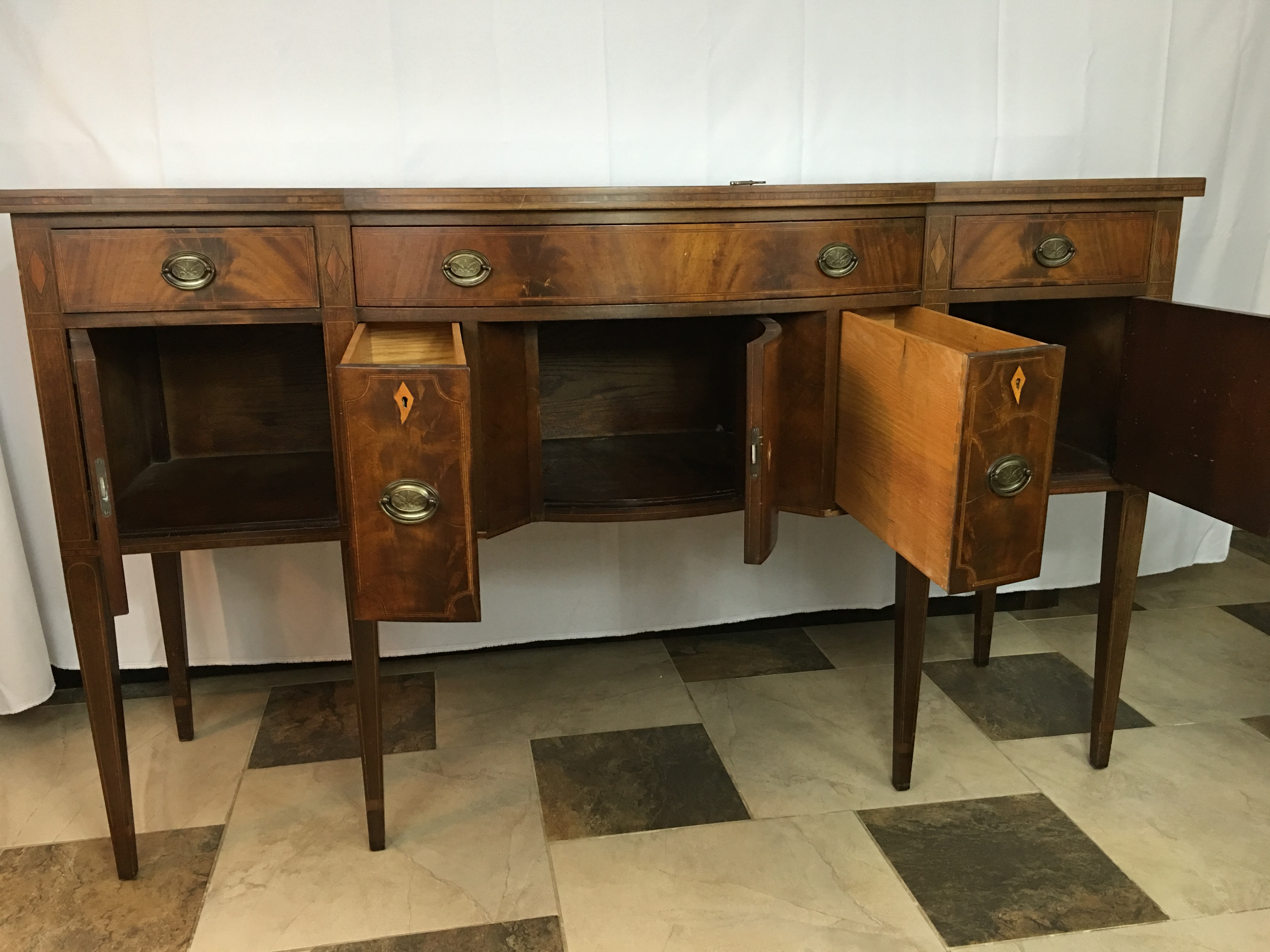 The buffet/ side board has 3 door compartments and 5 drawers all work perfectly and all 5 skeleton key locks work