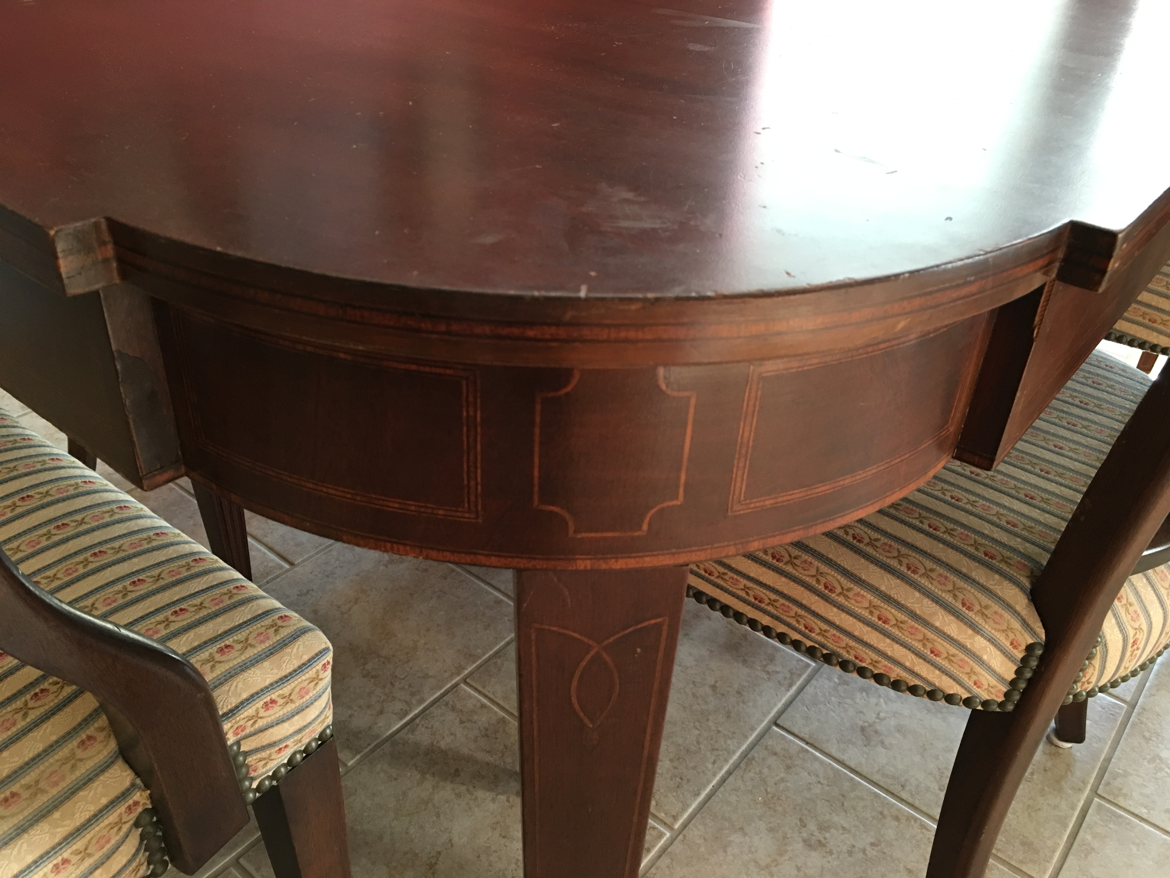 the table is dark wood with inlay all around and on legs, It was sold to me with 8 chairs.