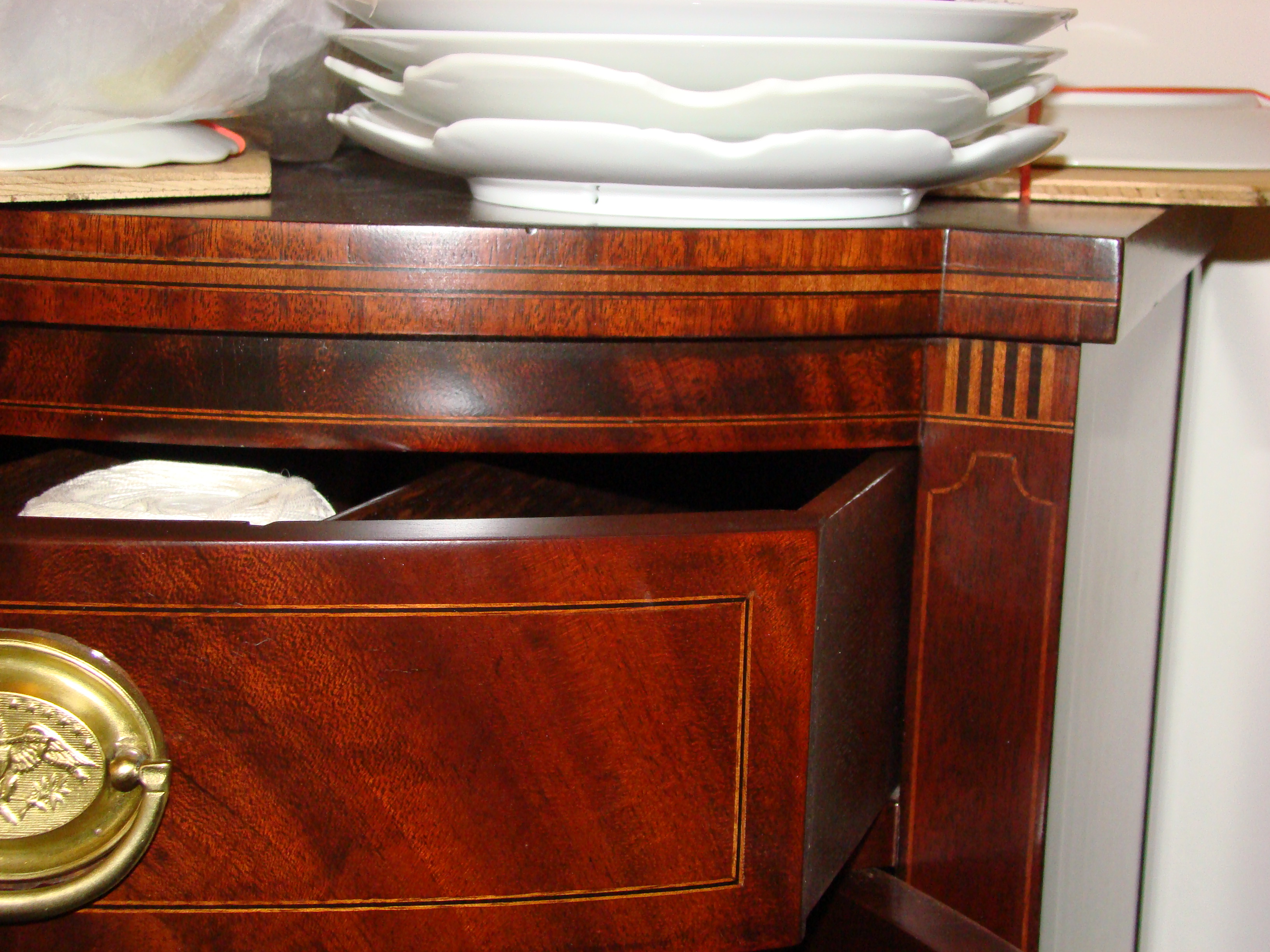 Williams-Kimp serpentine sideboard.  Not sure of wood type.  Three drawers above four doors, with inlaid wood accents.  Pretty good condition, some minor scratches. Believe it is all original finish.