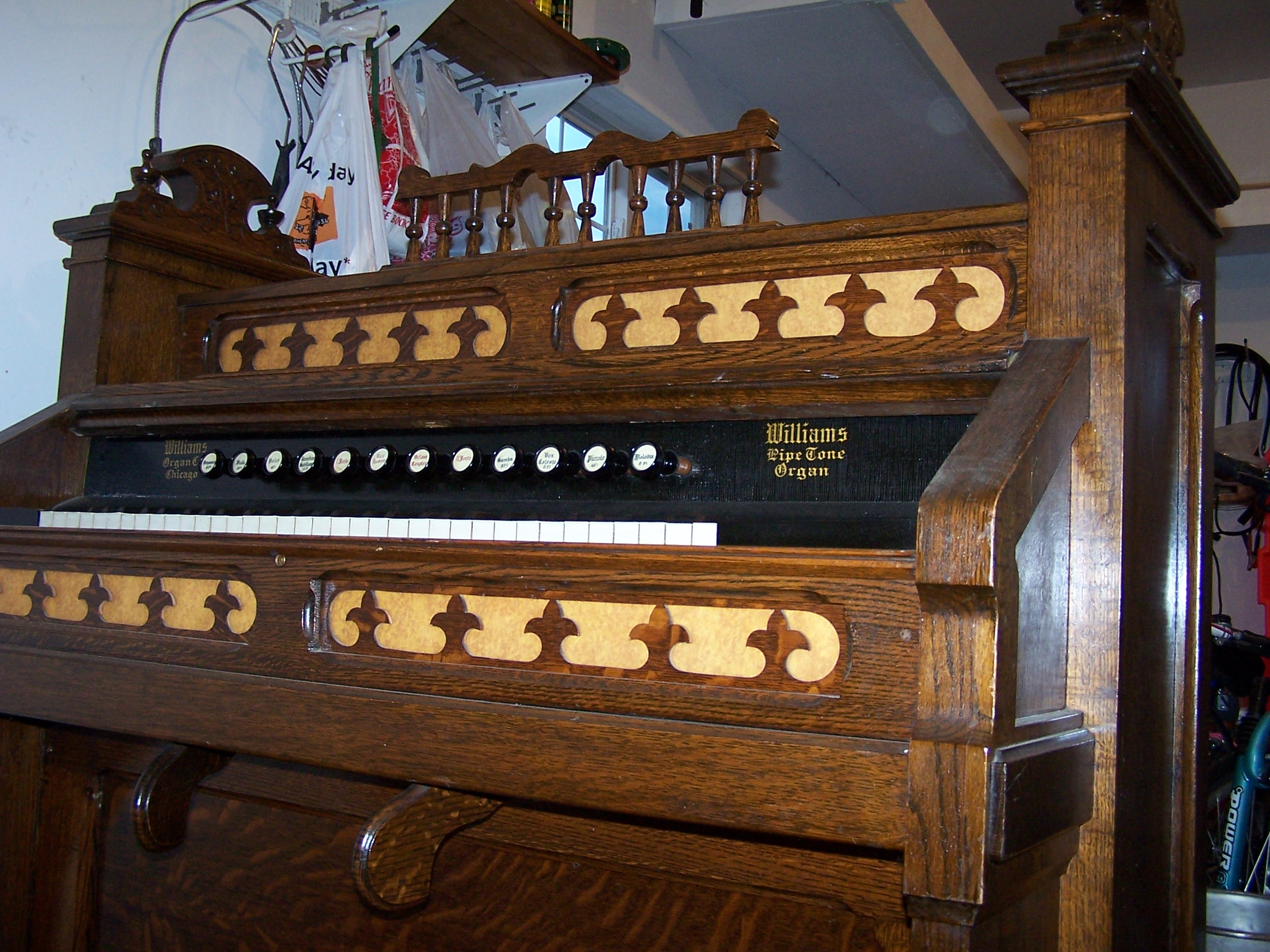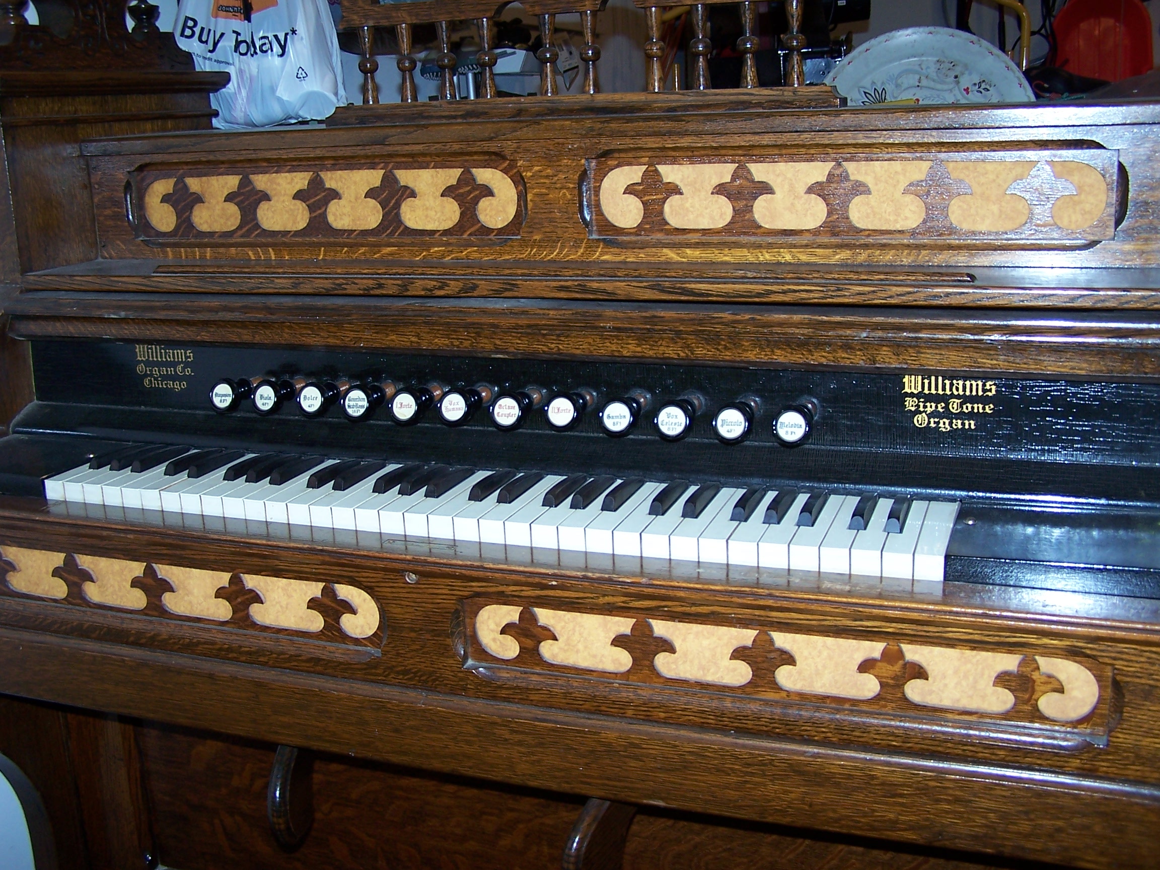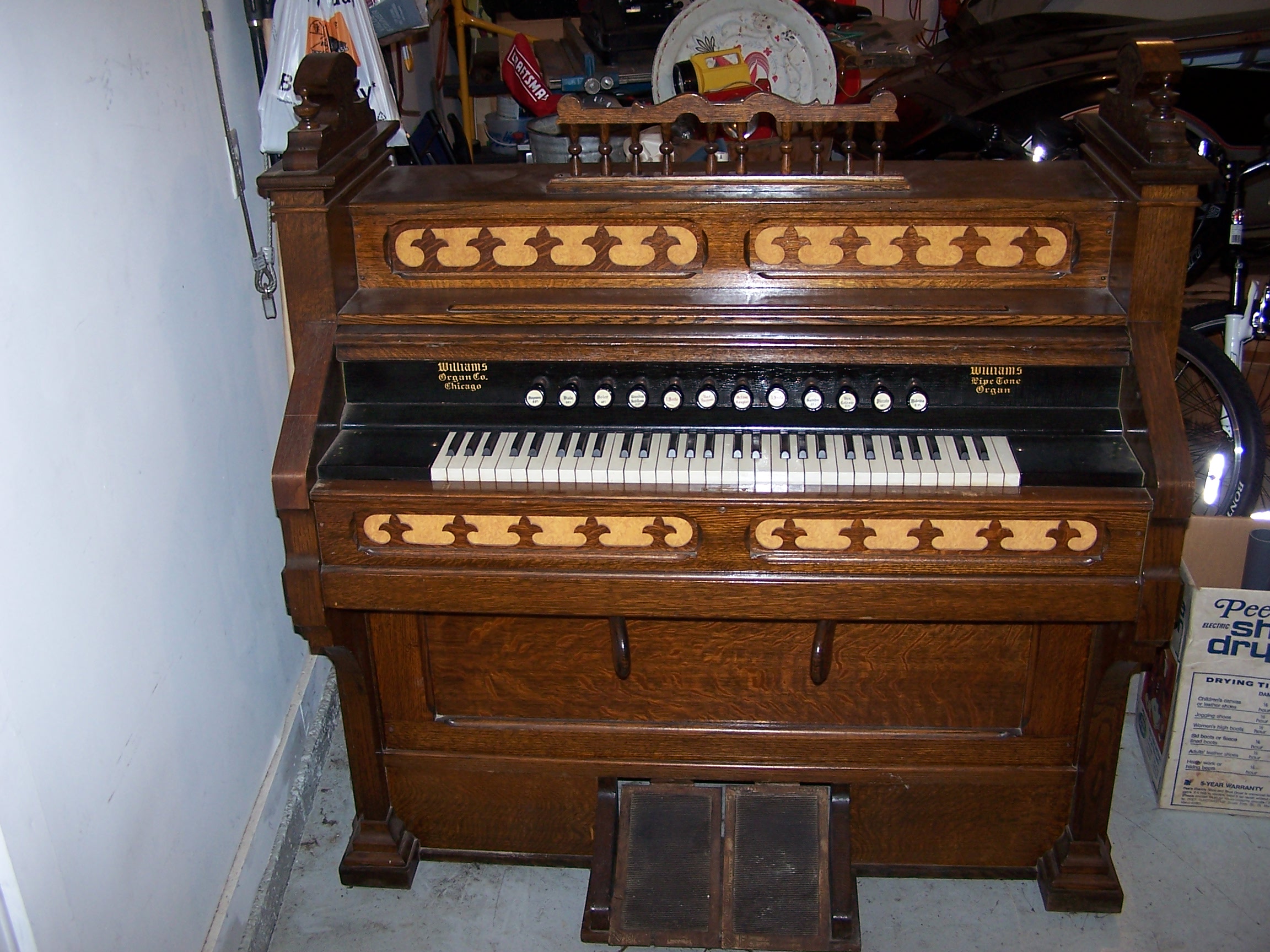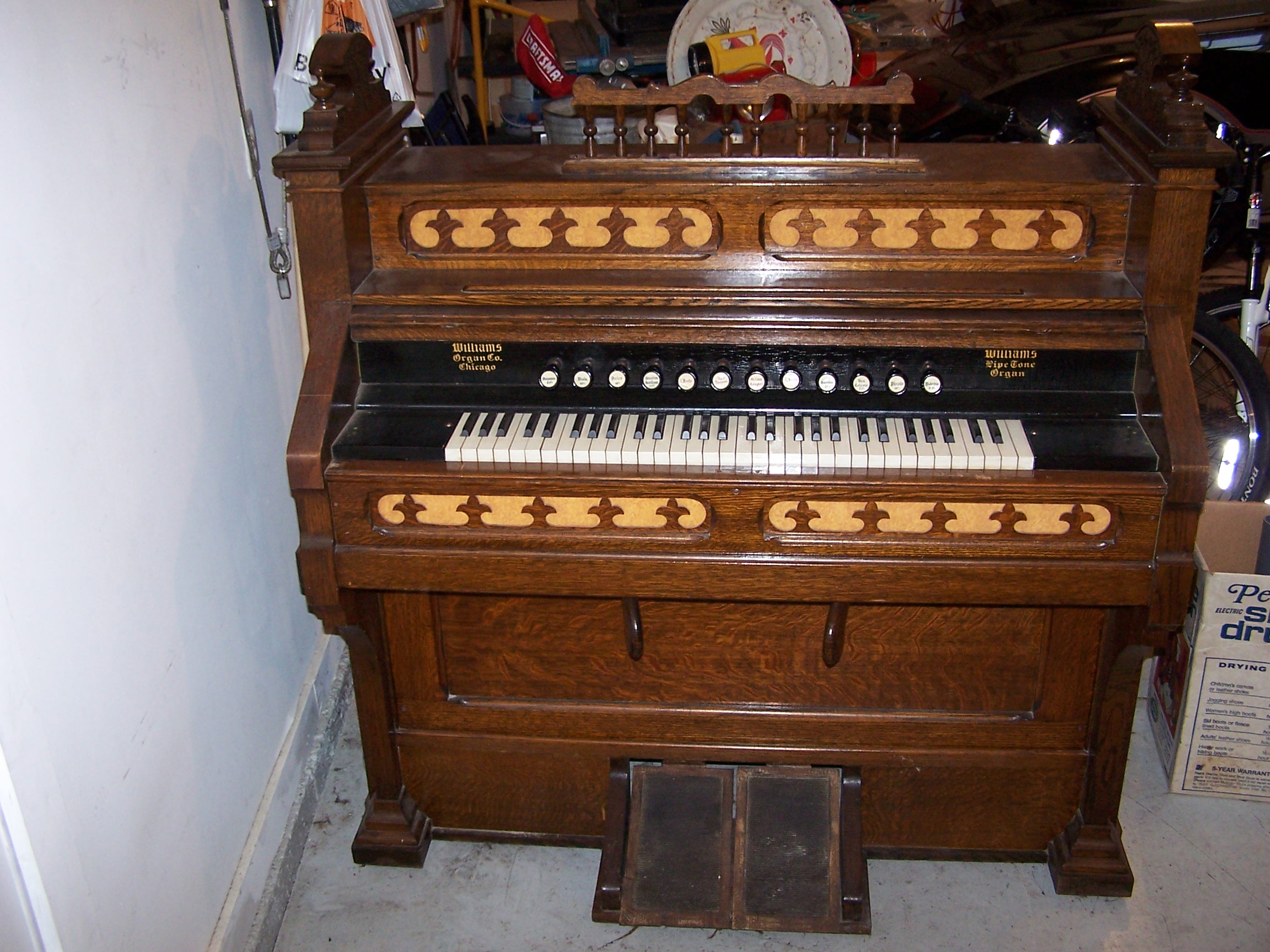 I have an antique Williams Organ Co. Chicago - Williams Pipe Tone Organ that is in good condition on the outside and does play as well.  There is an air leak on one side as you pump.