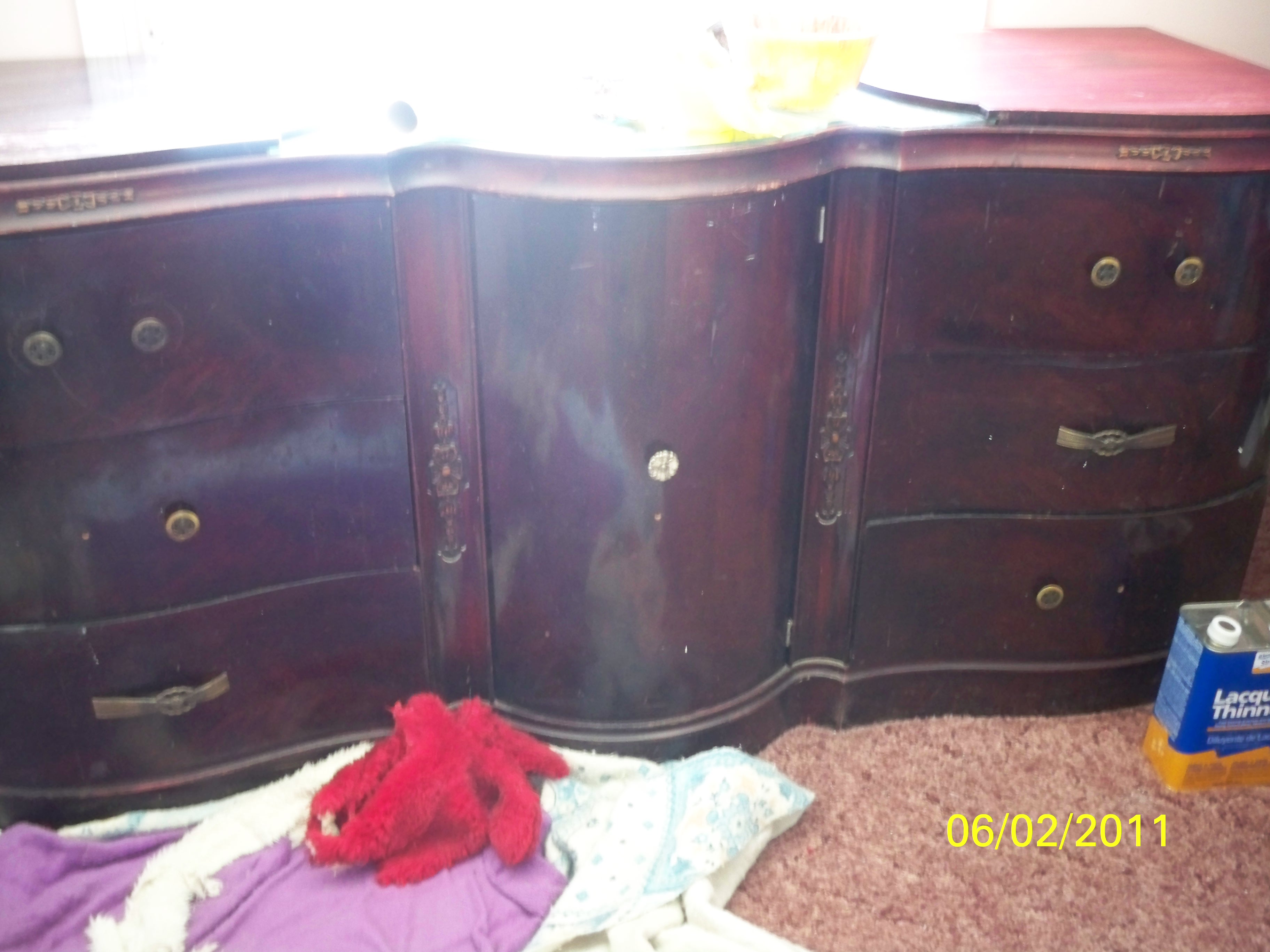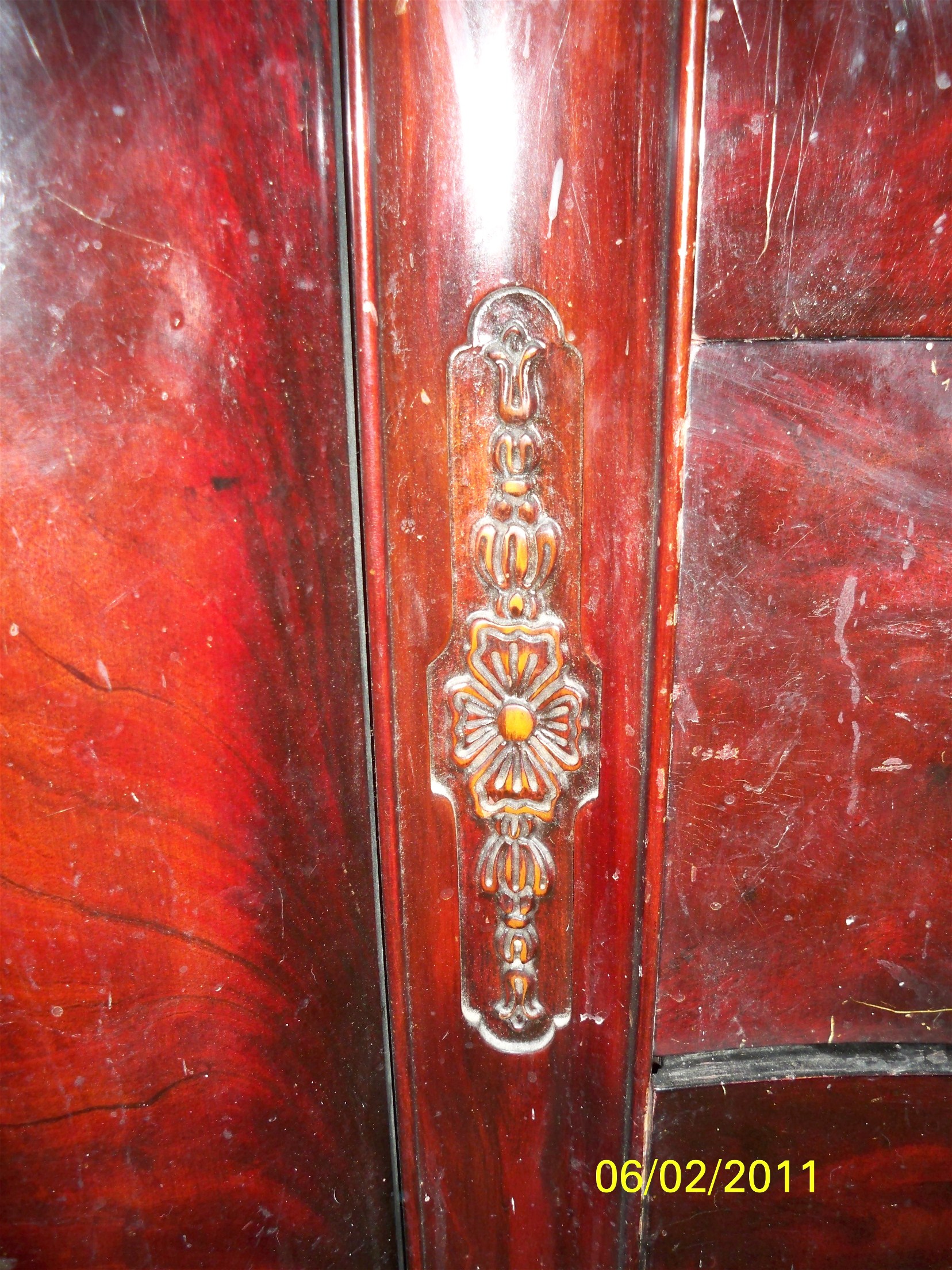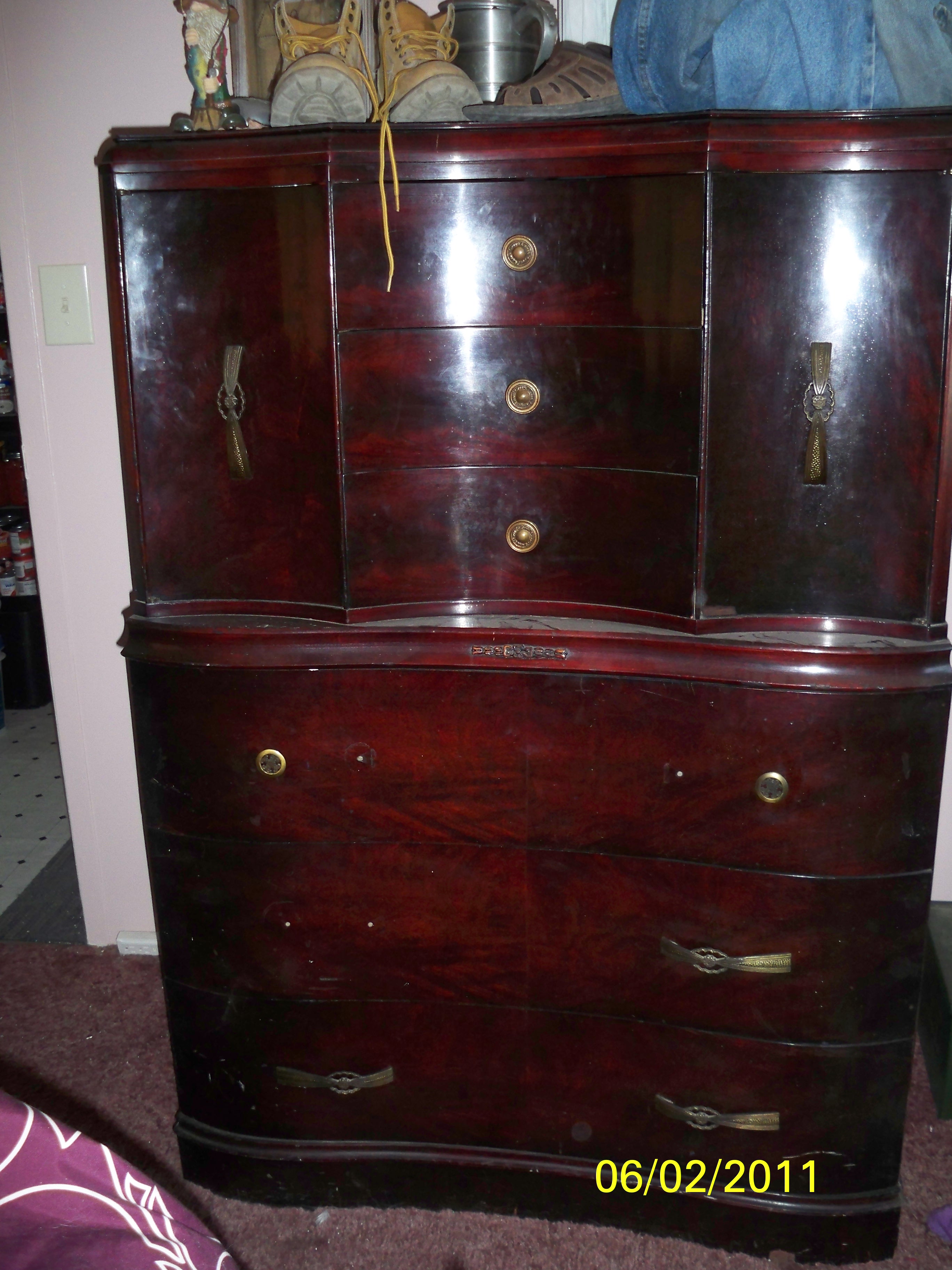 My Husband was given this set YEARS ago while living in New Jersey. It was a gift from his sister, who got it from her in-laws who got it ? ? ? ? We though it was Mahogany until we had it professionally "cleaned" and noticed it was cherry pink. According to my husband (before my time) all pieces had glass "dust" covers. There is a mirror in the center of the long dresser... It is stamped N7- I -953. The "flowers" on the front look like 4 hearts placed together to form the flowers. The pulls are cast with either Made in England or fB in a circle Reg'd London England stamped on the back. Dressers do have "dust" shelves between the drawers.