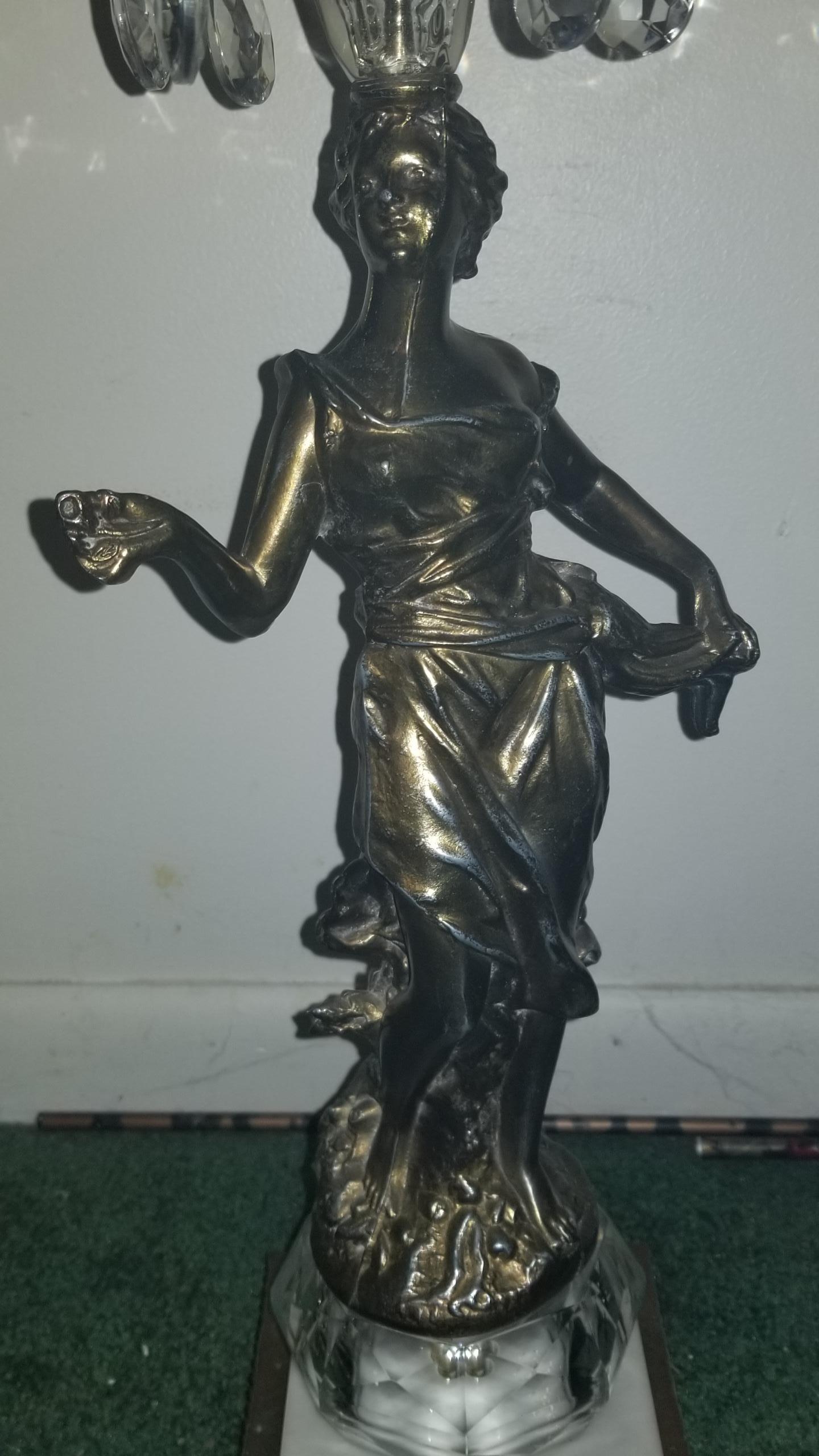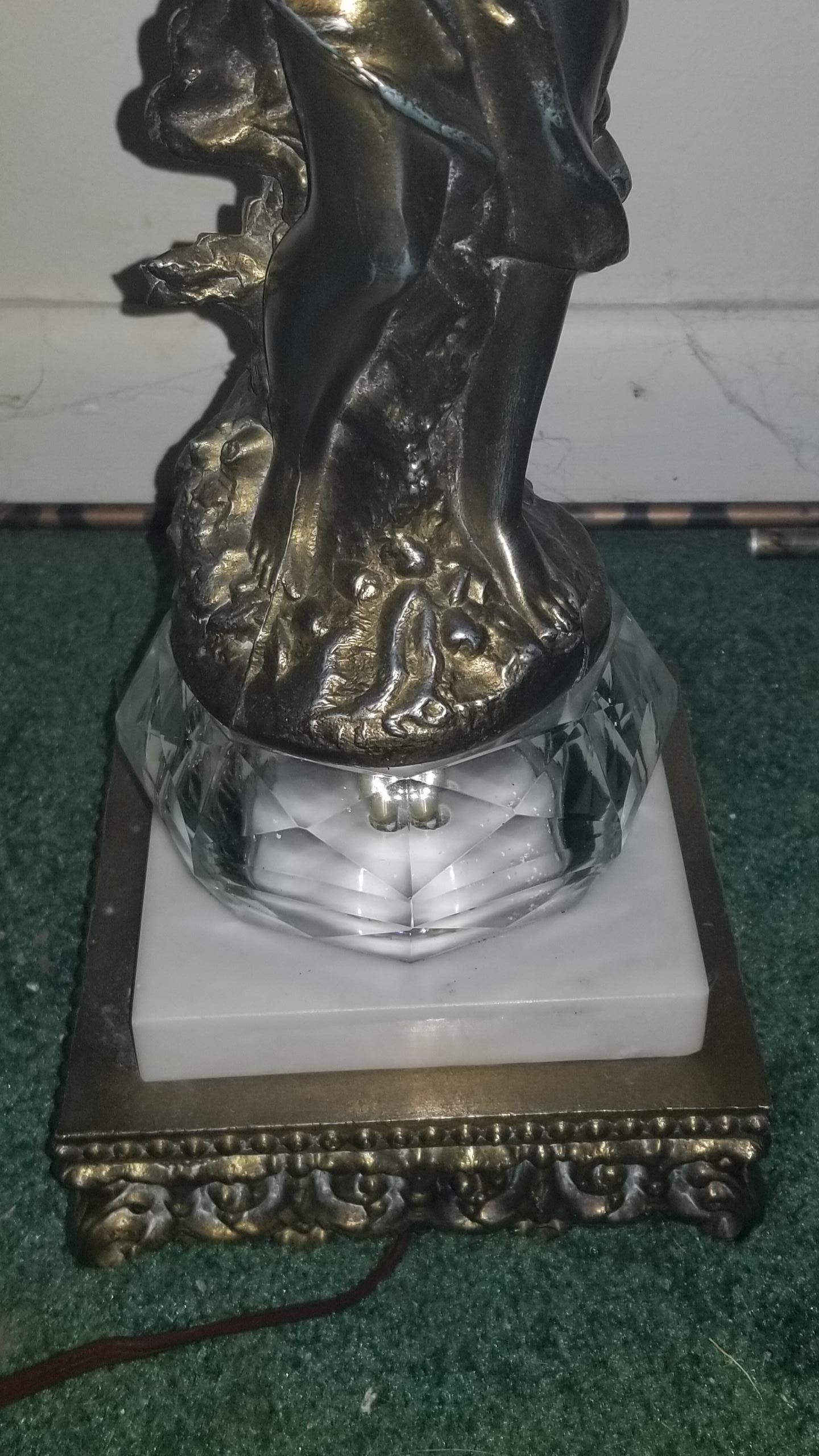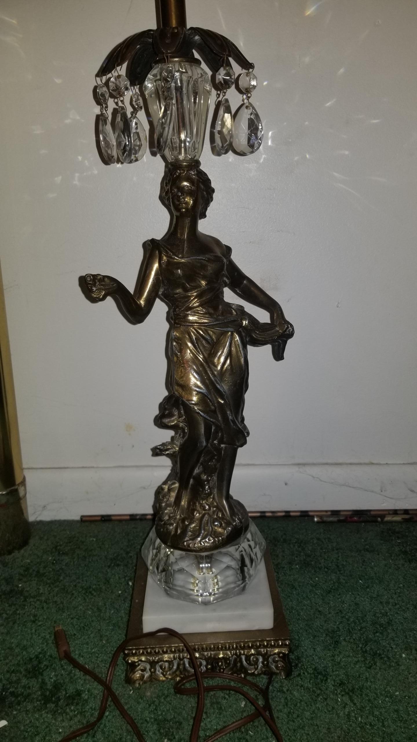 Shes on a marble and brass base with glass prisms at the top. Glass balls at the top of her head and bottom of her feet. Lamp is very heavy I believe she's bronze Bottom has wilmar co and under that it has 5W.