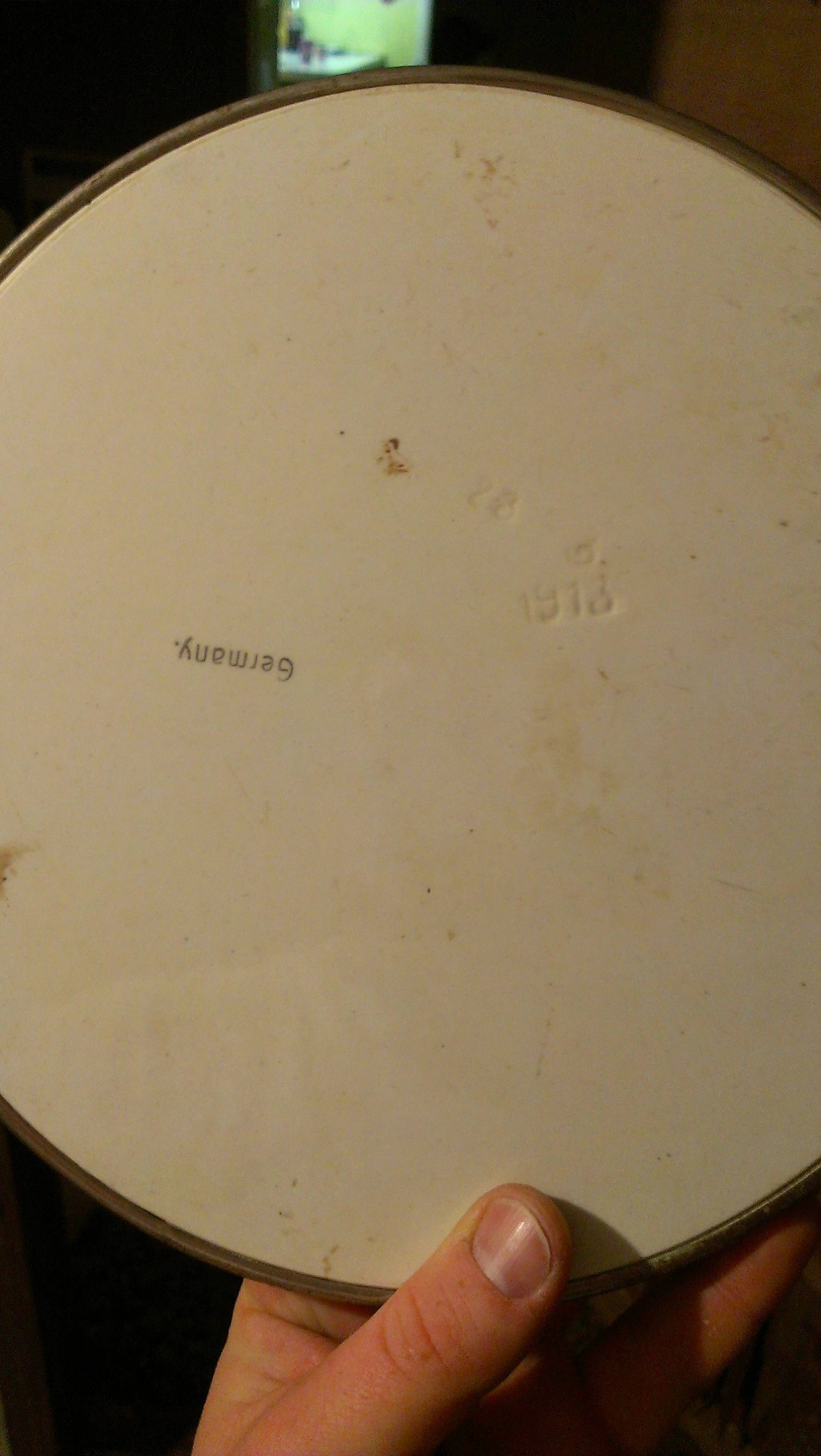 Blue and while plate with what looks like pewter ring. Back says Germany 1913 and has a 6 and a sc .