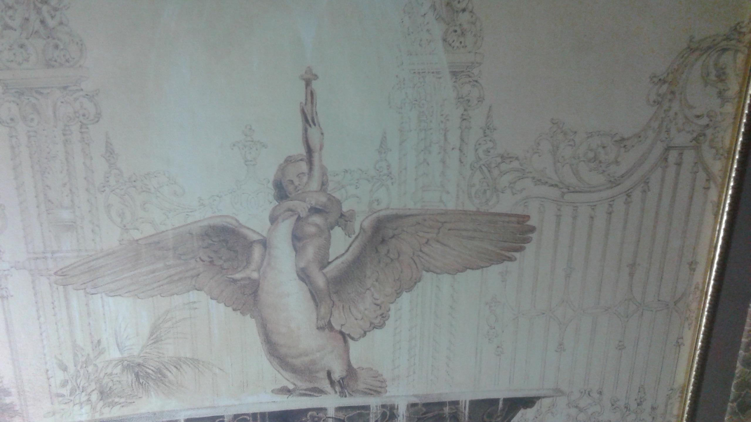 A drawing of an angel on a bird in a a fountain in front heavens gates