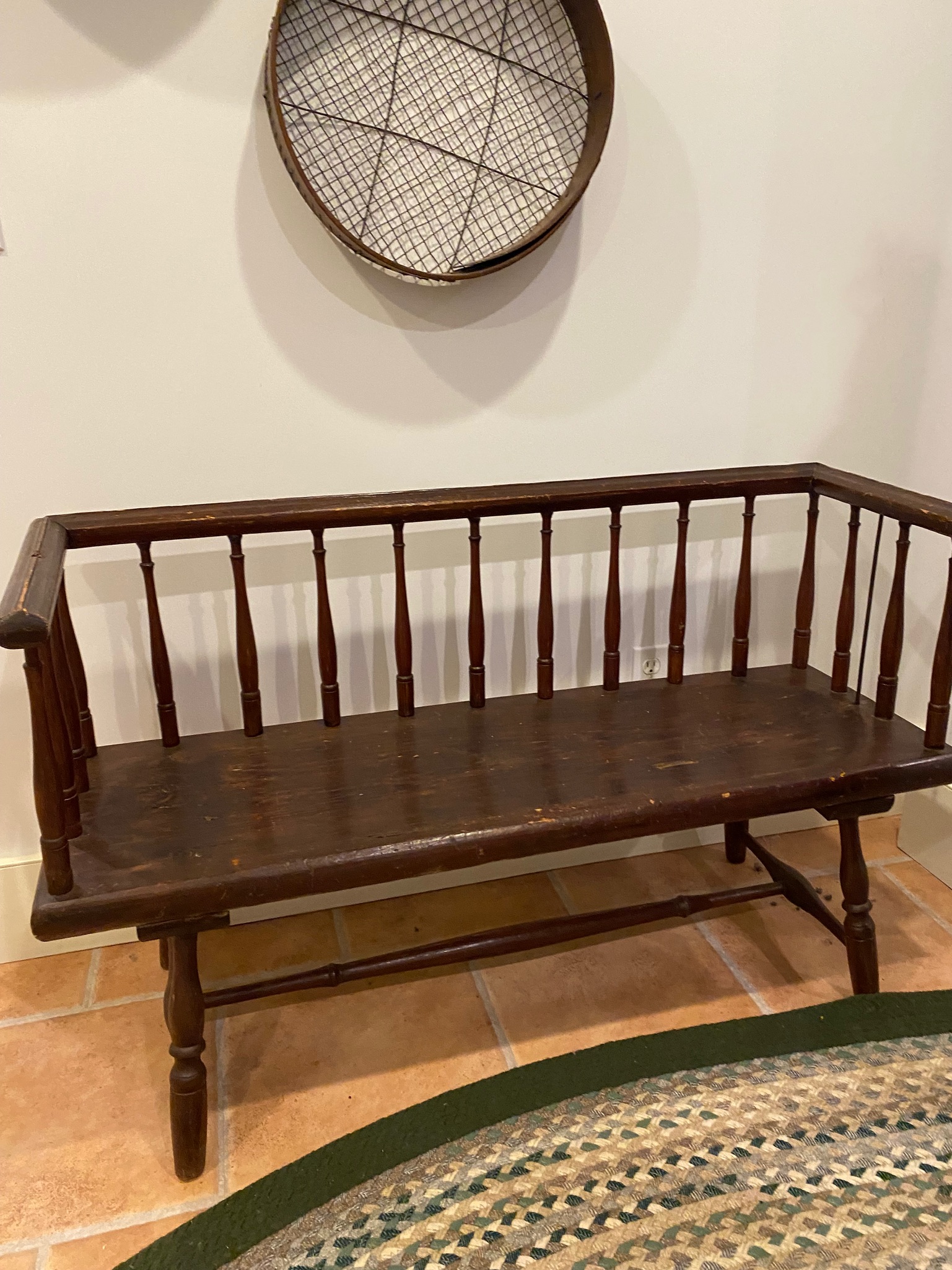 Probably 19th century. Of box form, with baluster-turned spindles and a continuous back, raised on turned legs joined by stretchers. Length - 47" Probably formerly painted; reduced in height