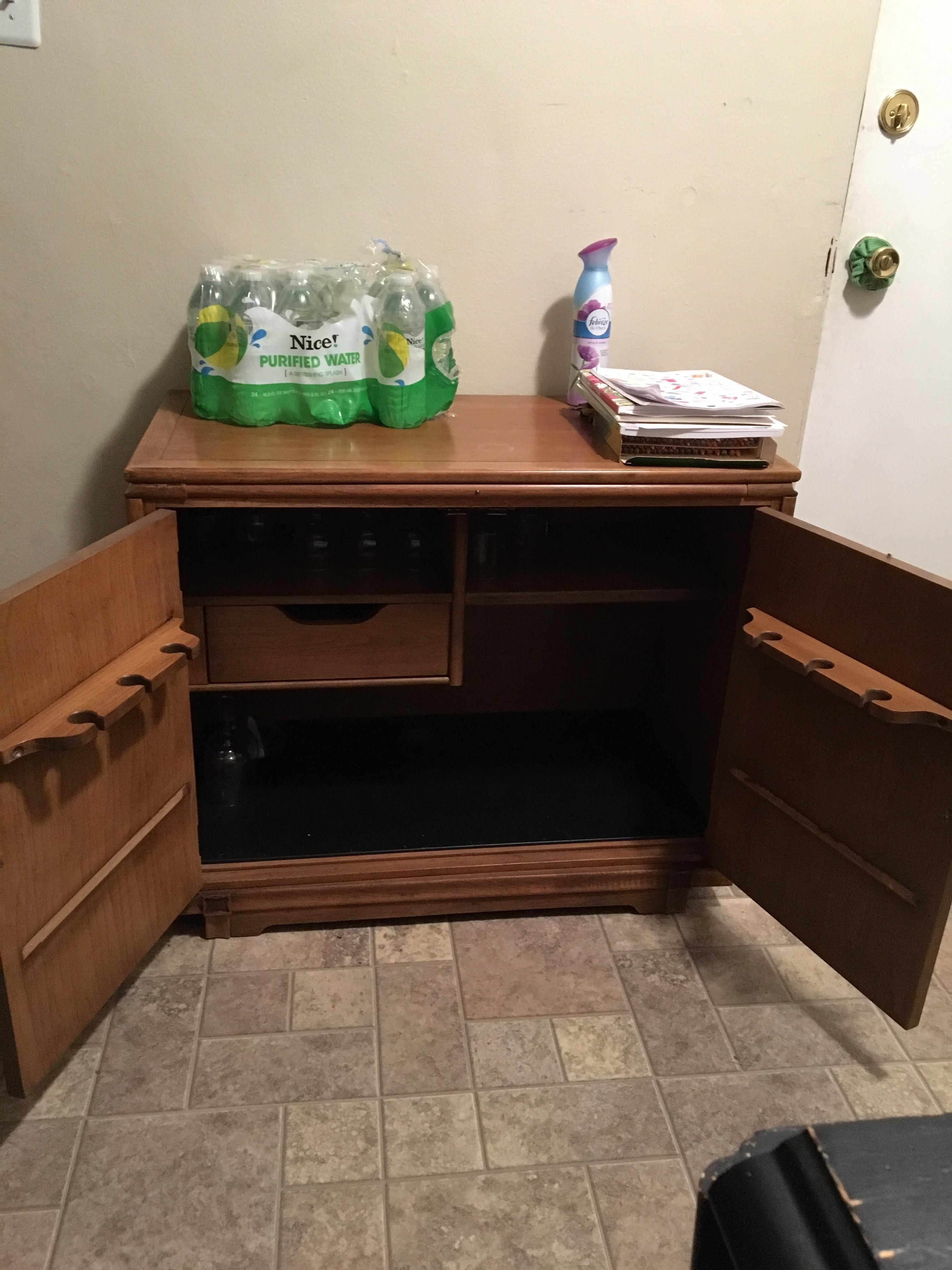 We think it is a wine cabinet, it is in wonderful condition except one water mark. About 2 ft tall and almost 3 ft wide