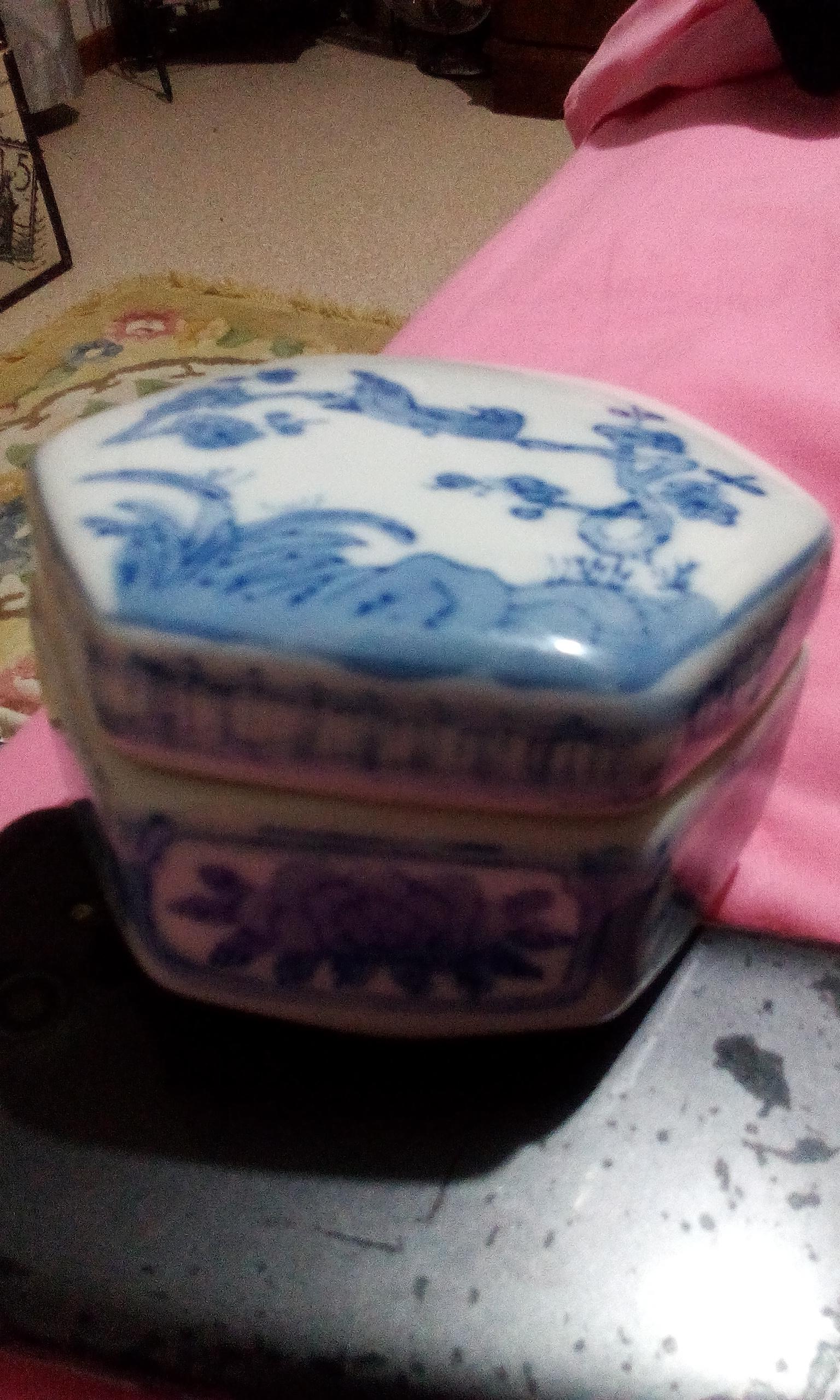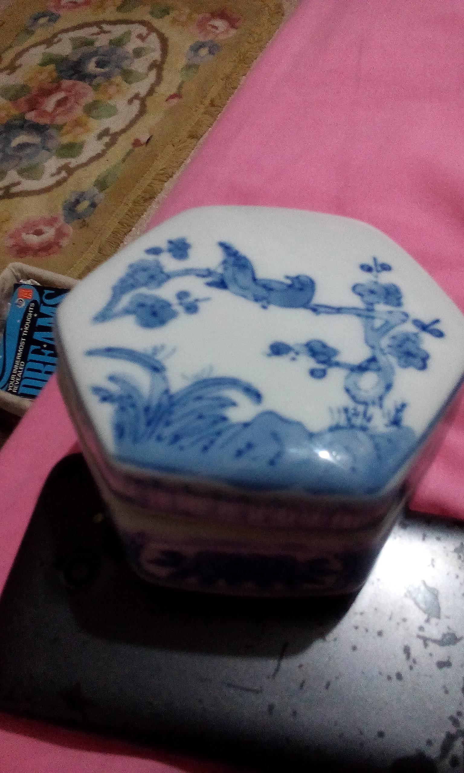 Blue and white porcelain pot with lid. Stamped with markings. Belong to the Qing Dynasty. It is in perfect condition.