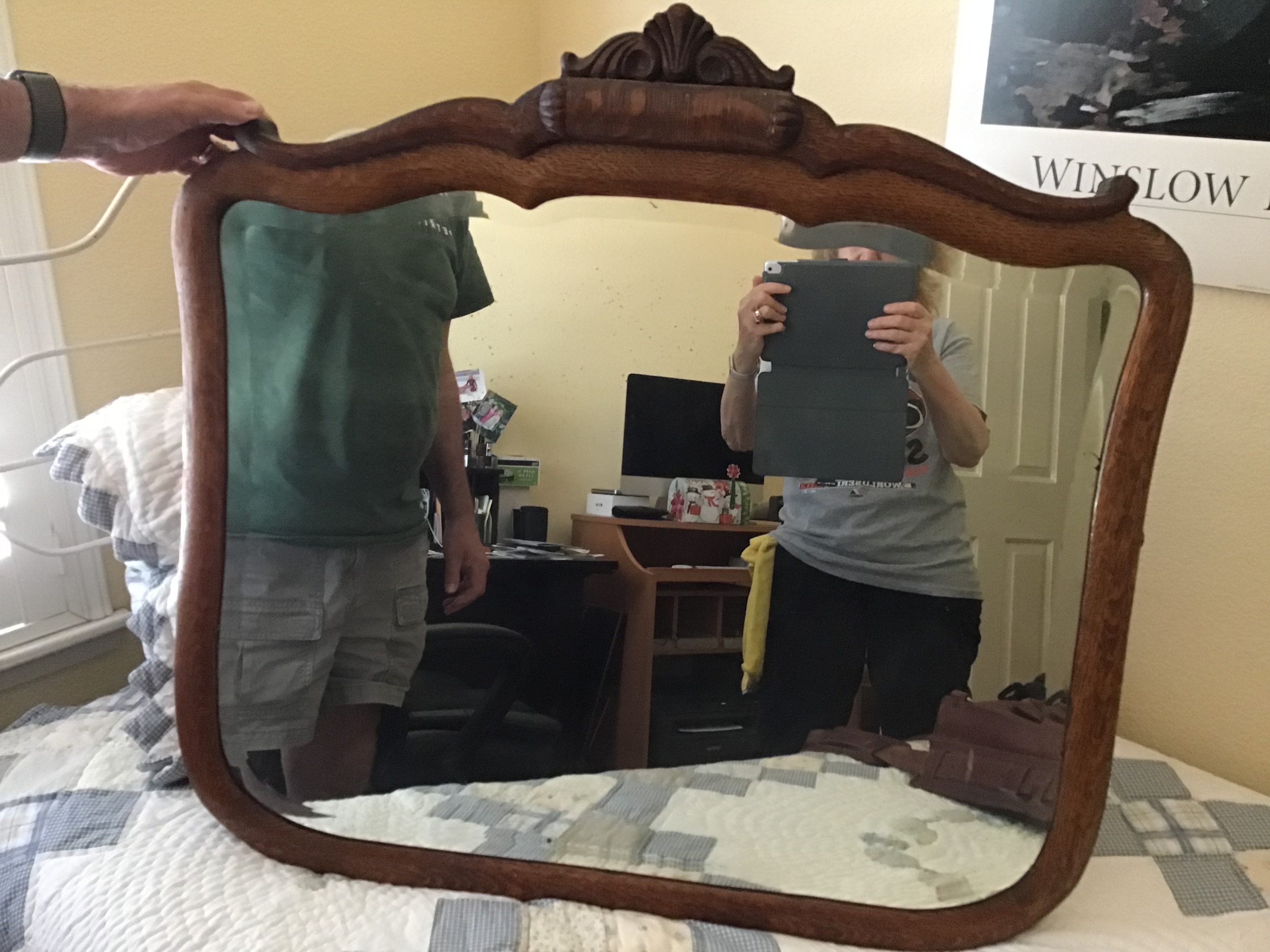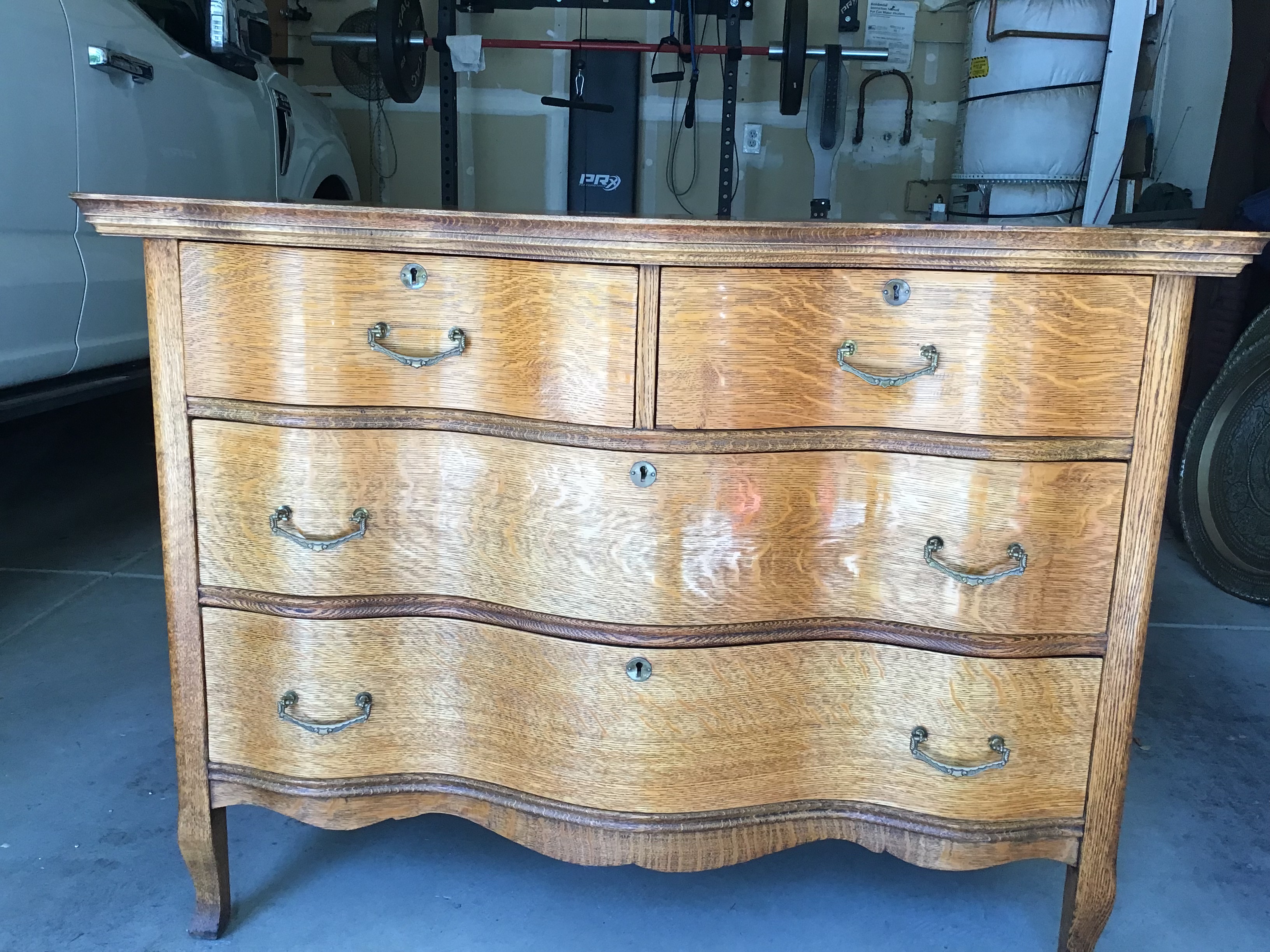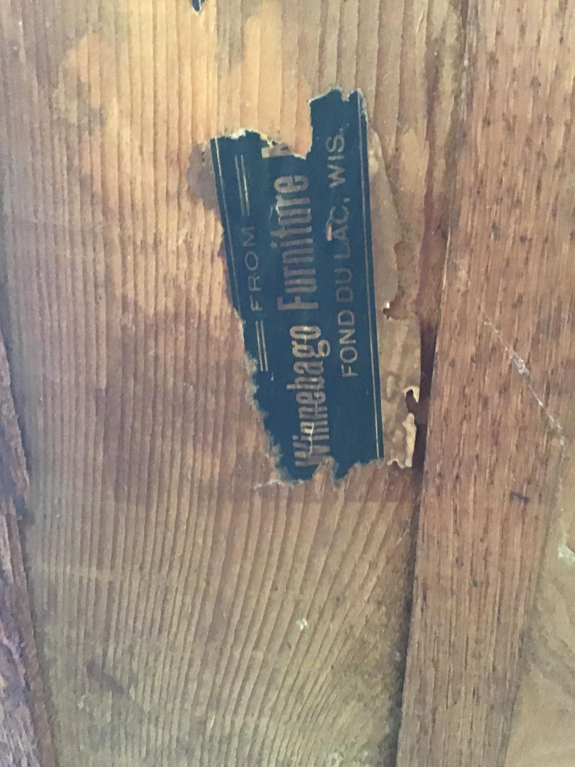 Four drawer oak dresser with detached mirror. Bent wood front. Produced by the Winnebago Furniture Co., Fond du Lac, Wisconsin. Good condition. It has been in the family for over 100 years.