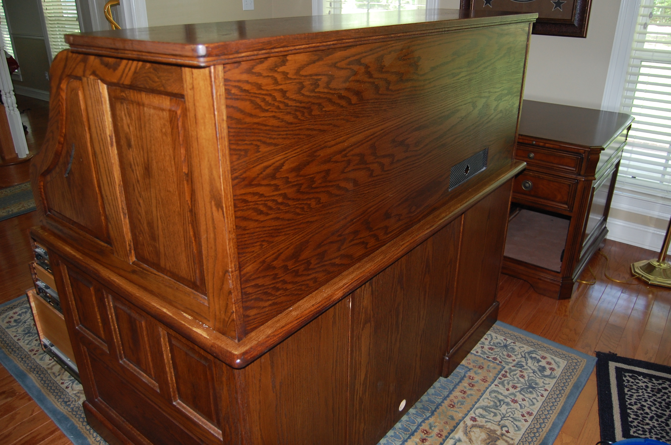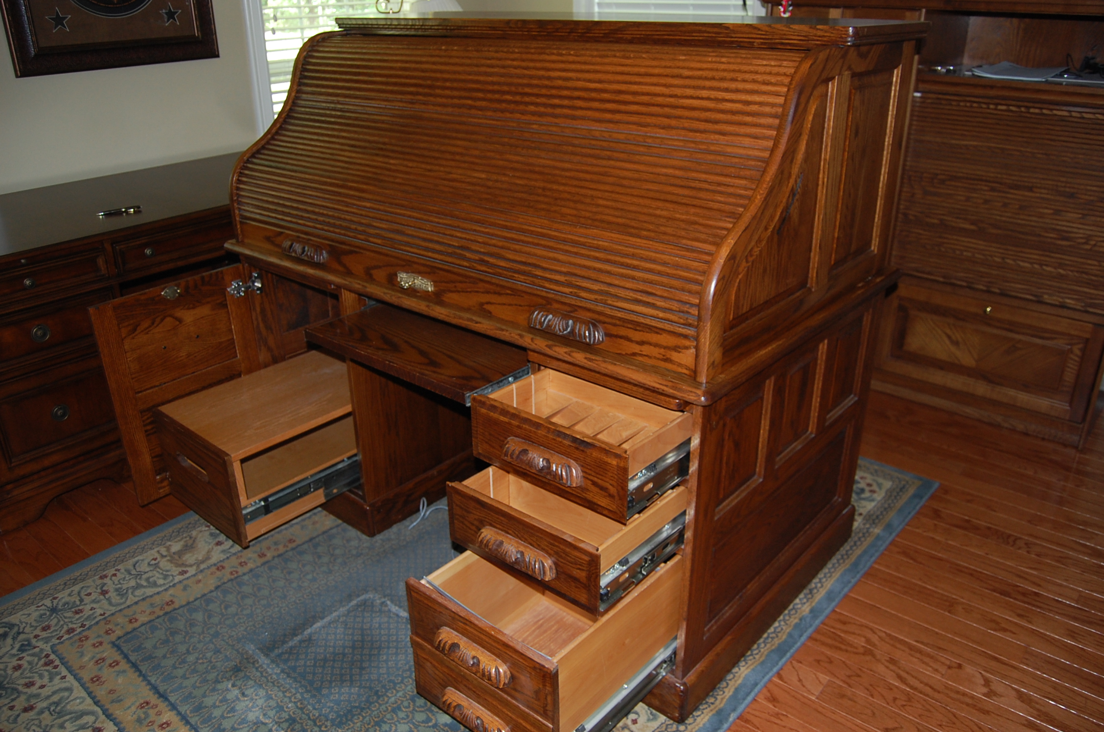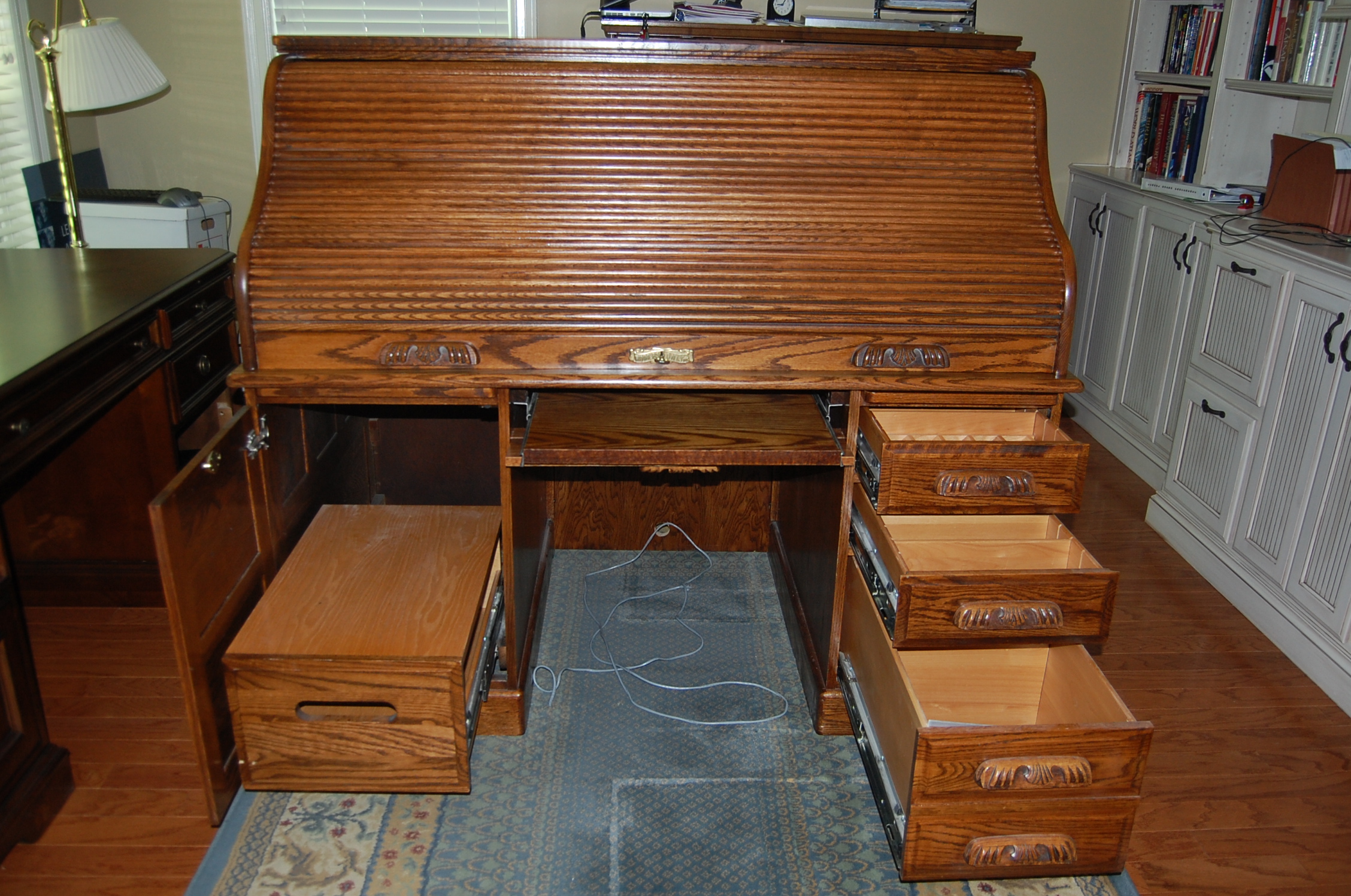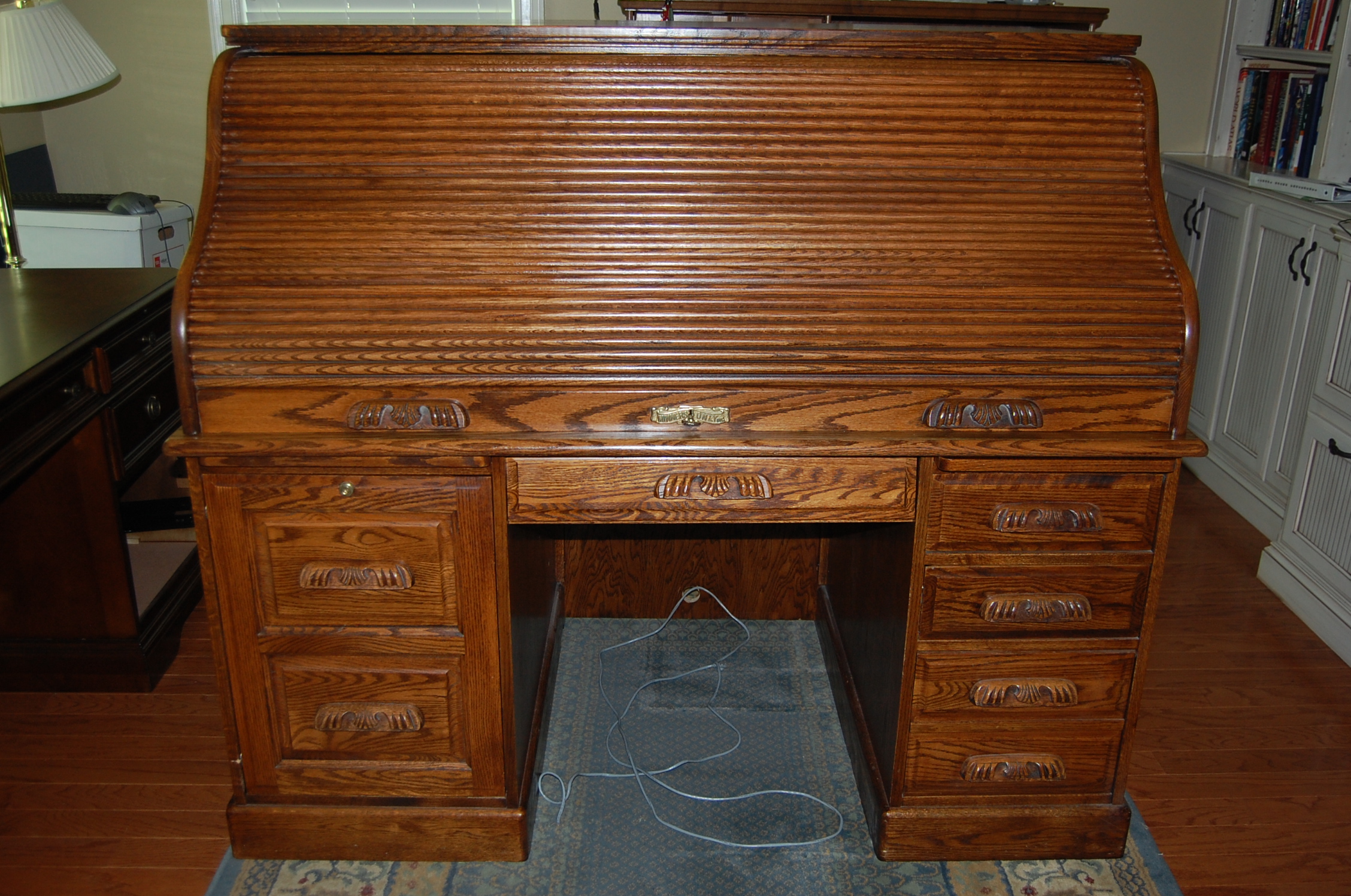 Purchased in 1986; excellent conditions; computer roll top desk with plenty of storage.  Left side pedastal for printer rollout and right side ioncludes two upper drawers with file drawer at bottom.  Medium oak finish; solid wood with oak veneers.