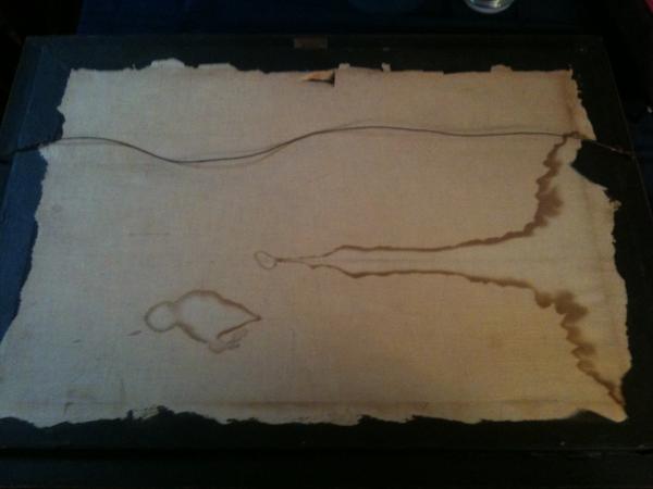 You can see the details of the brush strokes. Image is in excellent condition. The back  has stains (see photo). It was framed at Prager's, in Wheeling, W.VA. (see photo of tag), which is where my father lived when he first returned from WWII.